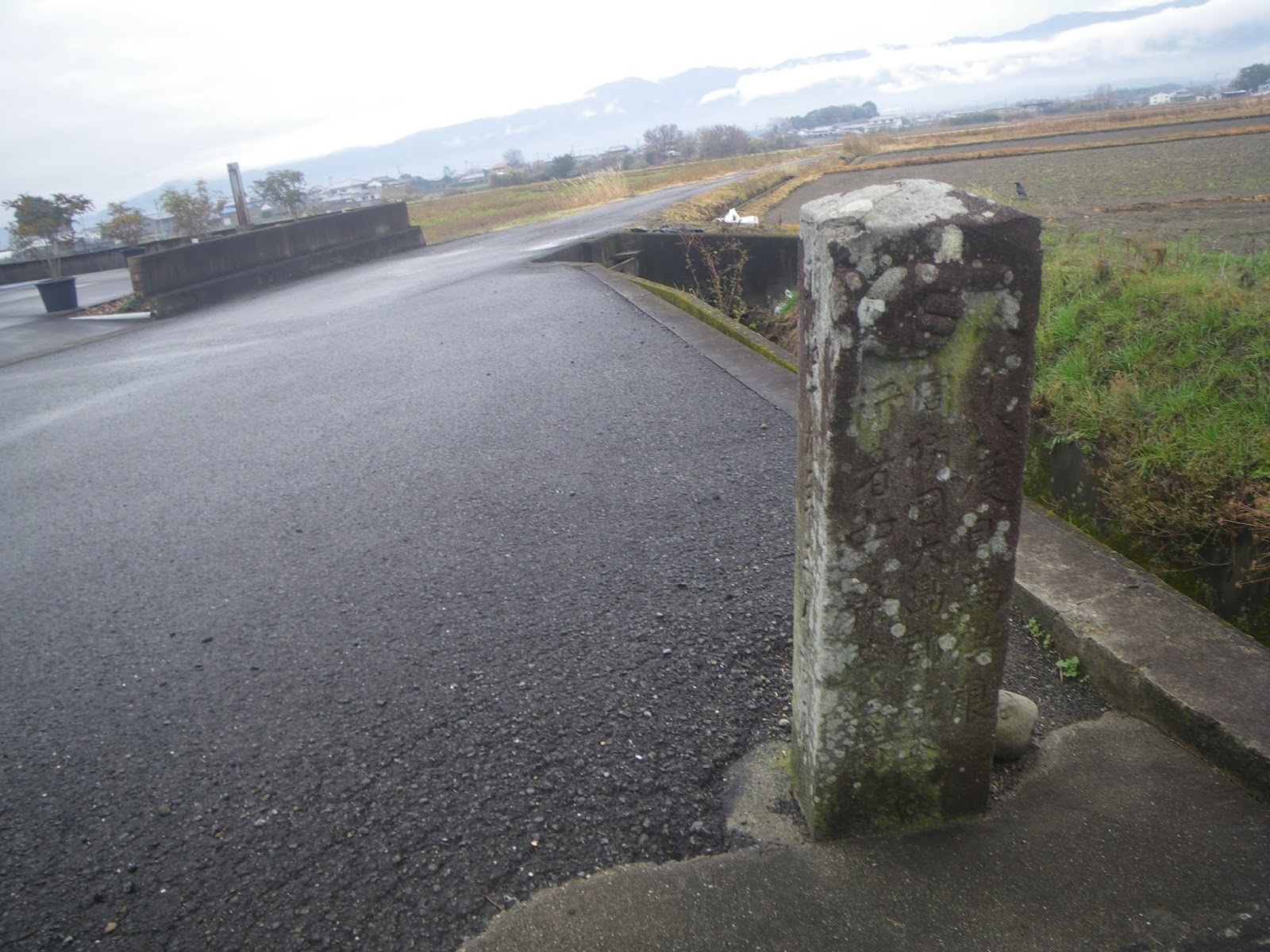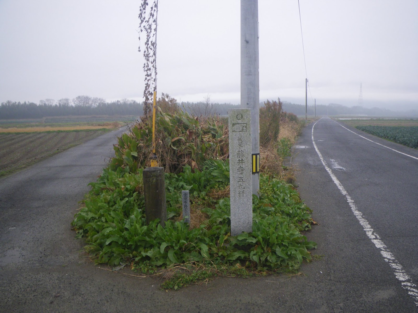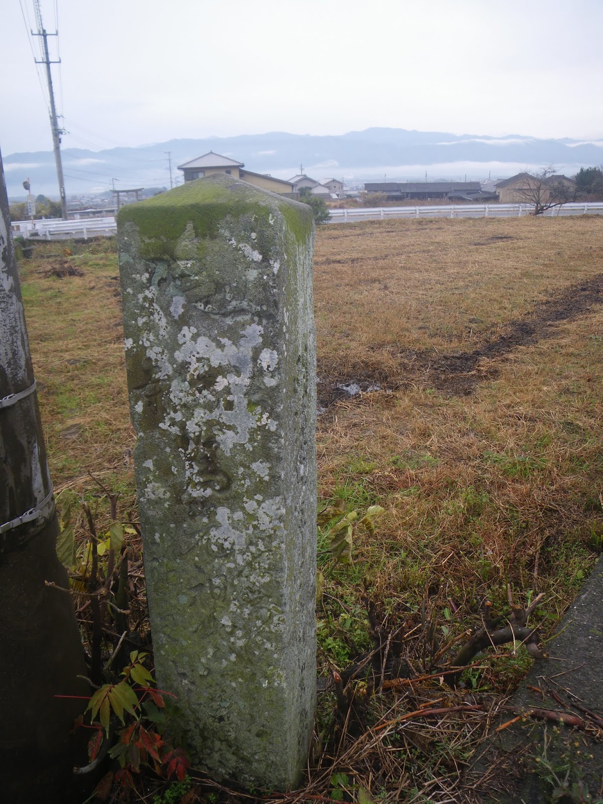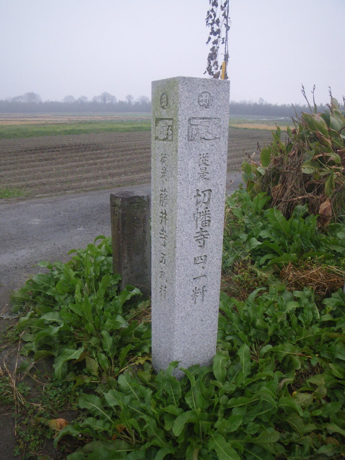標石から分岐点を左に進むと、県道237号と県道122号が合流する箇所に標石が立ち、「ふじゐ寺へ 廿八丁 きりはた寺へ 一里十丁 大正年間」といった文字が刻まれていた。