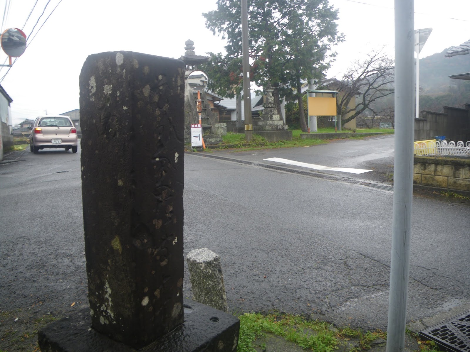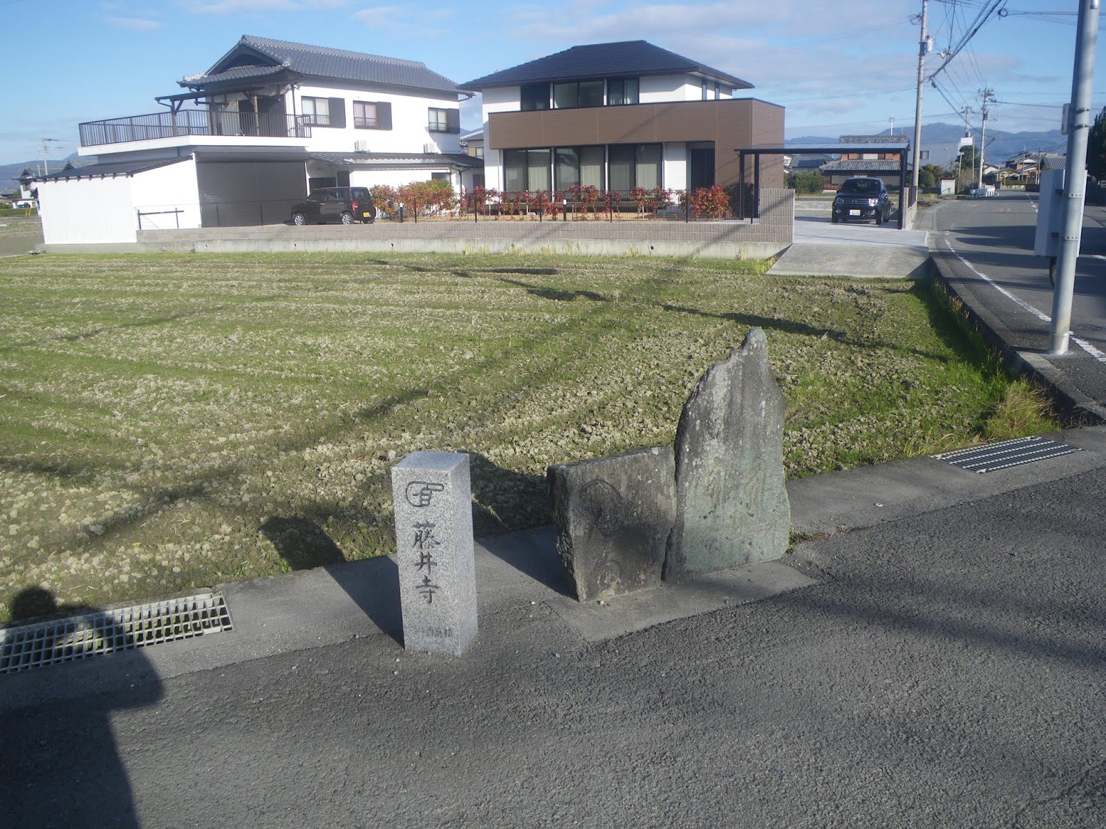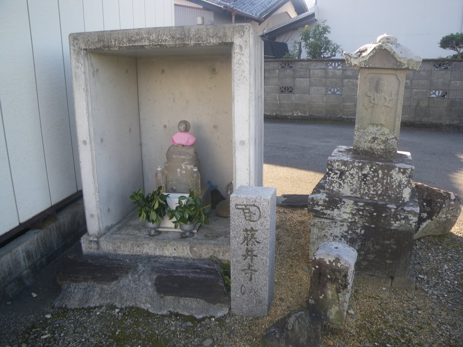 県道に戻った遍路道をしばらく歩く。県道238号交差部、北西角に標石。新しい藤井寺と刻まれた石柱の横に自然石2基。1基には「へんろ」の文字が読める。もう1基にも文字が刻まれているようだが読めない。
