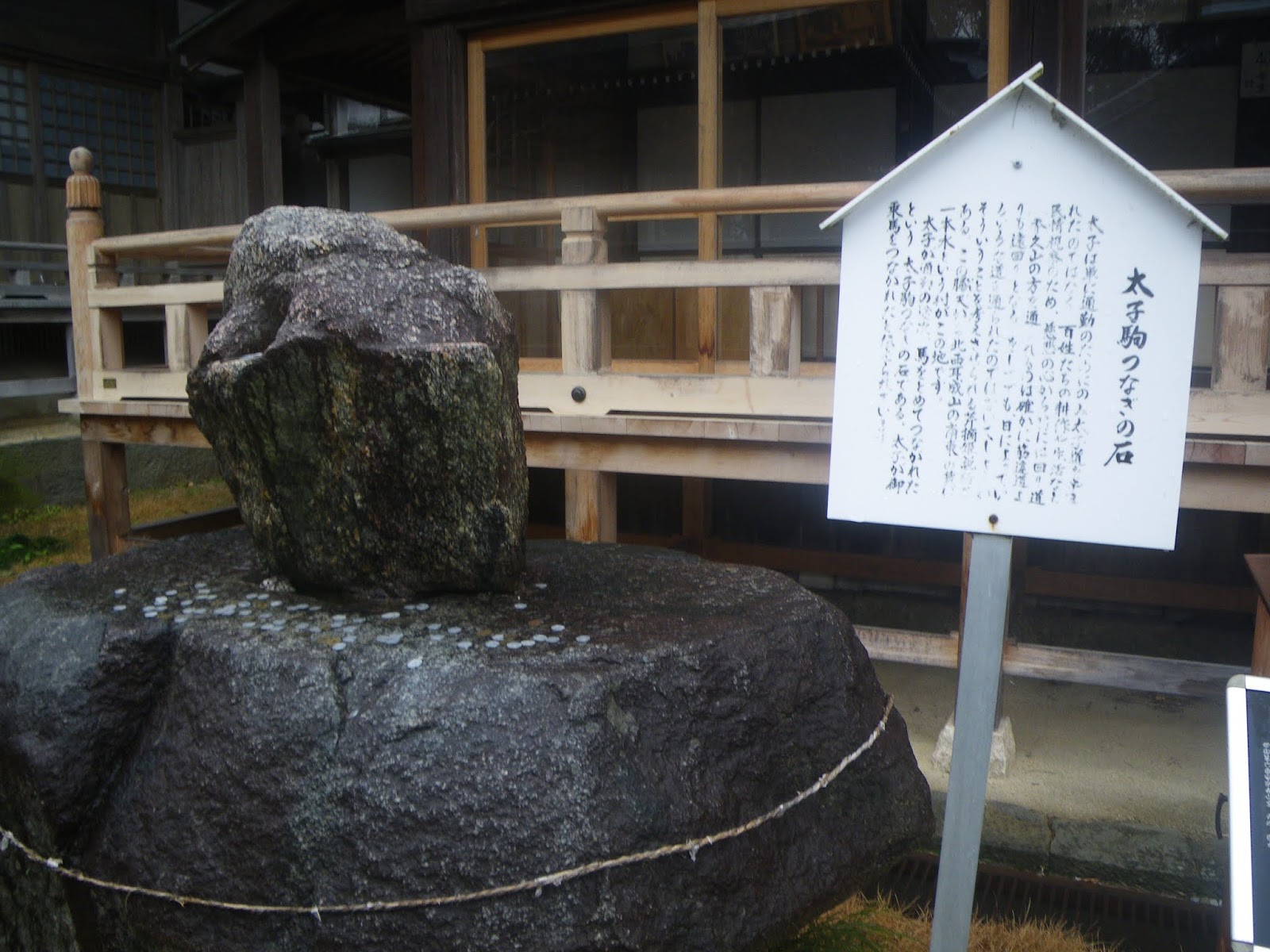 方丈前に大きな岩があり、「聖徳太子の駒繋石と一本木大楠不動明王の由来」の案内。「(前略)この聖徳太子駒繋石と一本木大楠不動明王の御尊像(一本木大楠の倒木で造像された)は、聖徳太子が法隆寺へ通う道すがら、民の生活を知るためにこの一本木大楠の木かげのこの駒繋石に歩を止められた、と伝えられ、太子の宮と法隆寺の間に奉安(奈良県橿原市石原田町川本一吉氏宅)されしも、御所市早川勢津子先生のもとに、この不動明王の「お四国へ行って修行の旅をする者の道しるべとならん」というお説げが三度まであり、やっと関係者思案を重ねた末、この地に移されることとなった。(後略)」とあった。