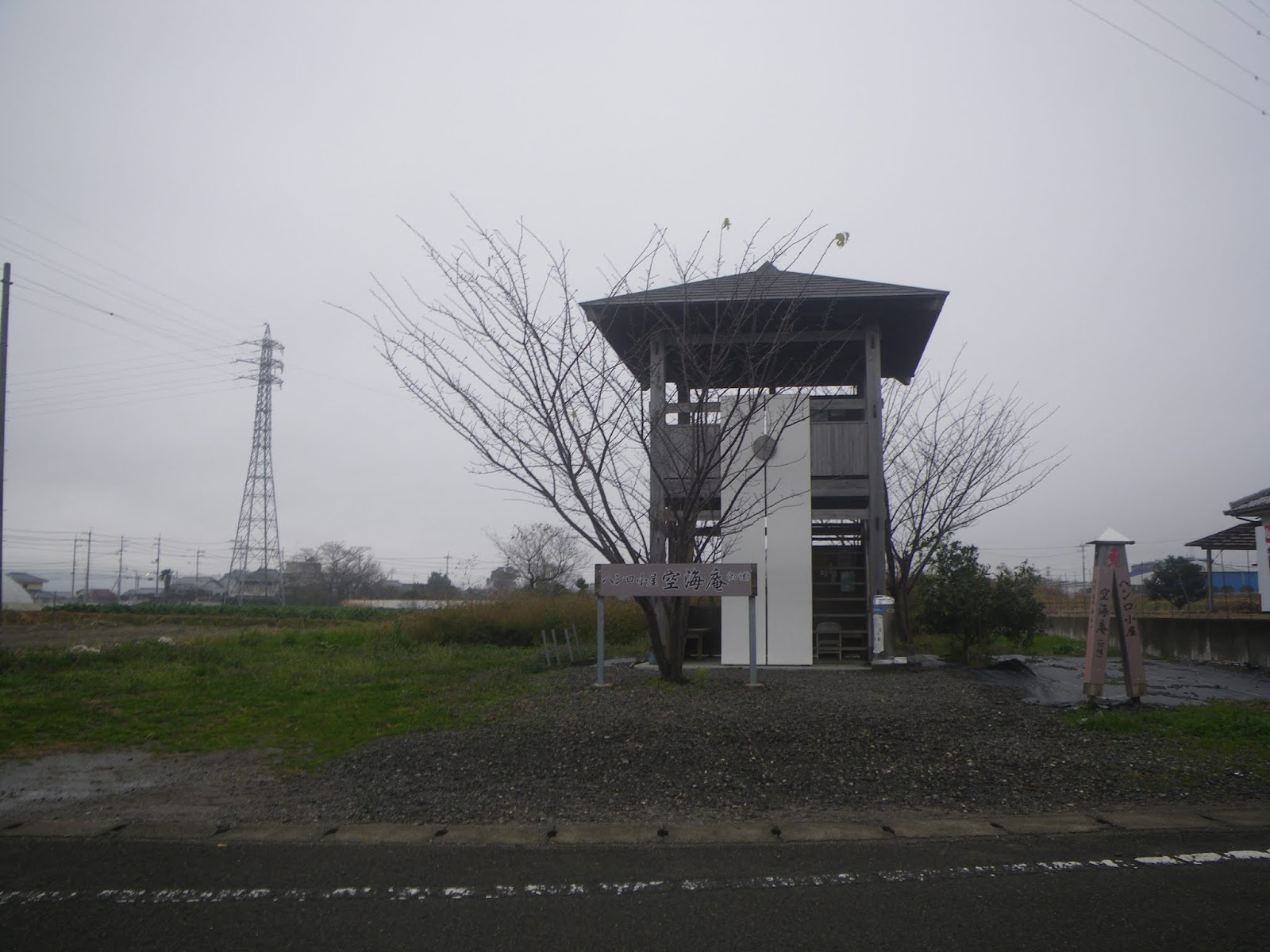 道の右手に比較的新しそうな標石があり、藤井寺8.8kmとある。更に南に下ると県道12号との交差部少し手前、道の右手に一見遊園と見まごうへんろ小屋があった。木造2階建ての遍路小屋には「へんろ小屋 空海庵」とあった。