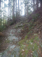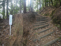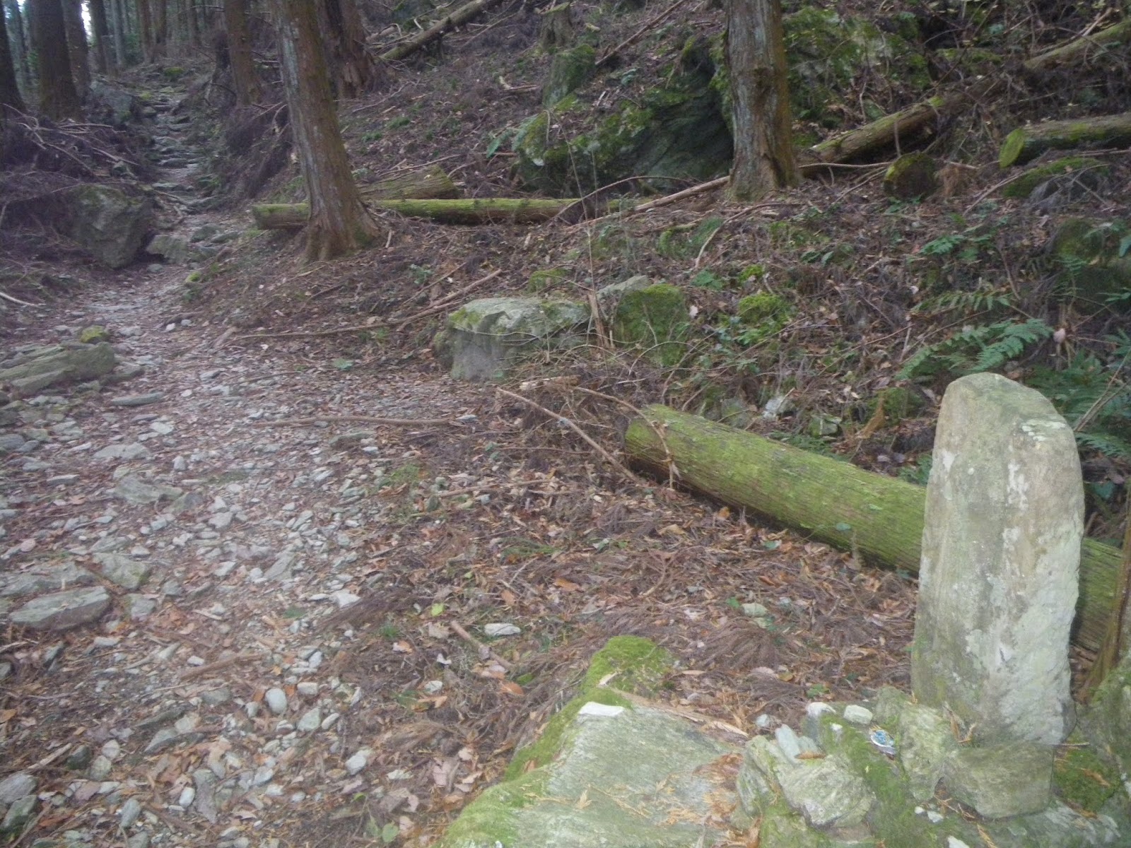 自然石が敷かれた急坂を上る。傾いた角柱丁石(午後12時45分)、上部が少し欠けた舟形地蔵丁石(午後12時47分)が立つ。角柱丁石は文字が読めないが、舟形地蔵丁石は「十五丁」と刻まれているように思える。
