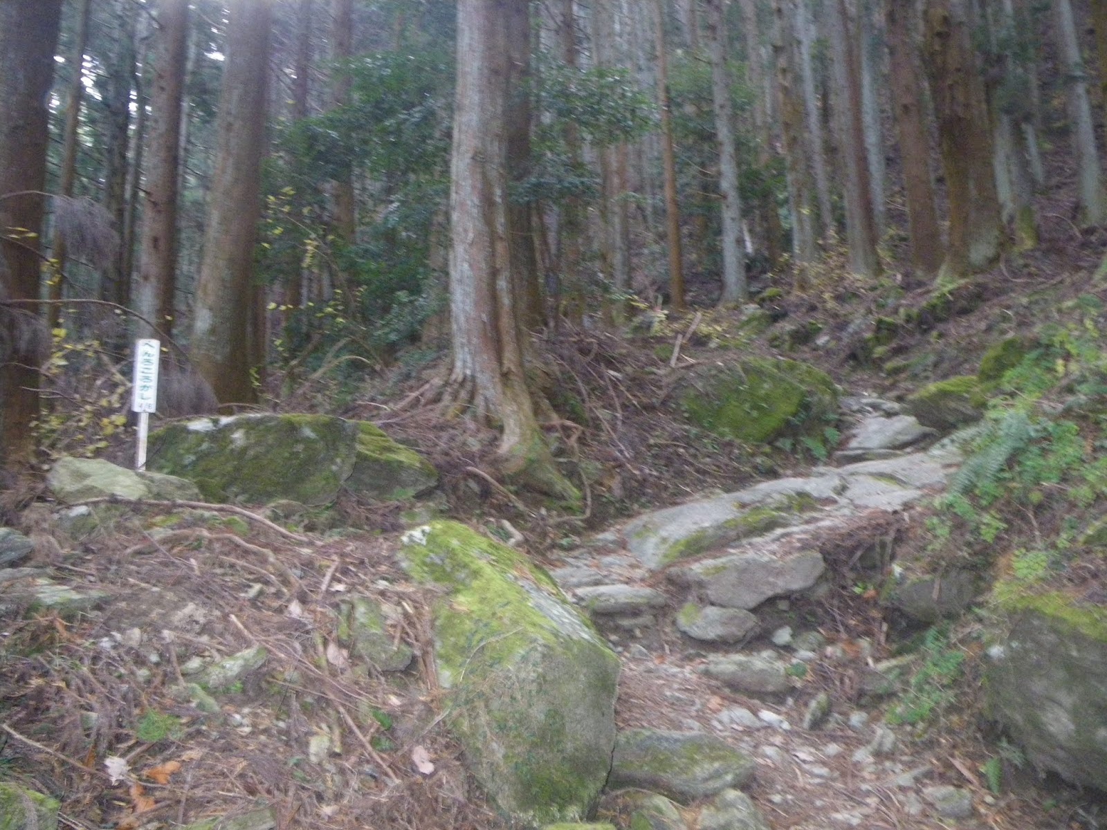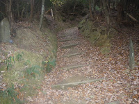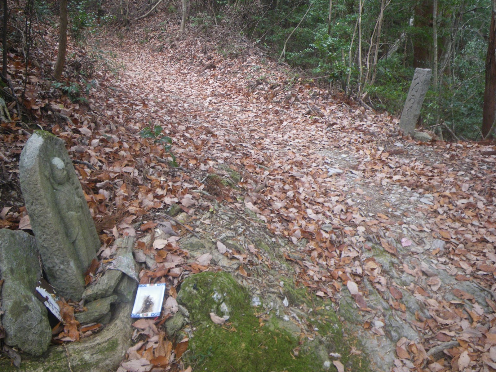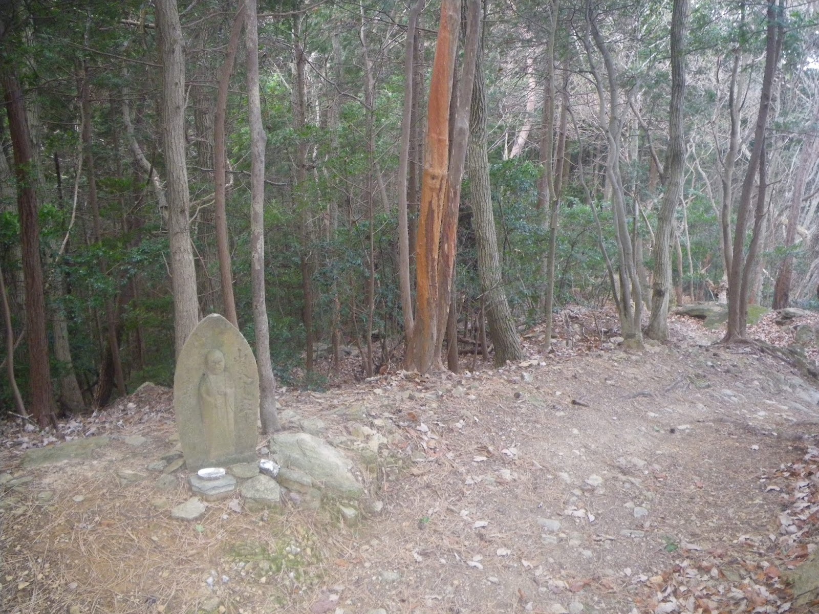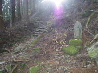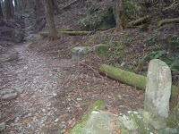 5分ほど進むと角柱丁石と舟形地蔵が並んで立つ(午後1時16分)。大岩を削った坂を上る。