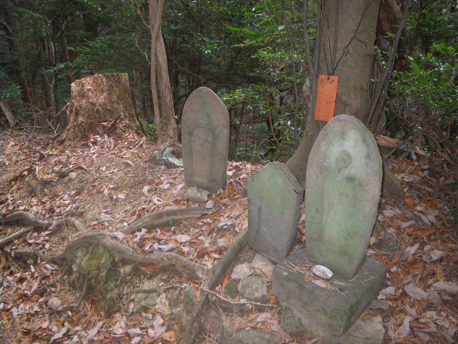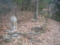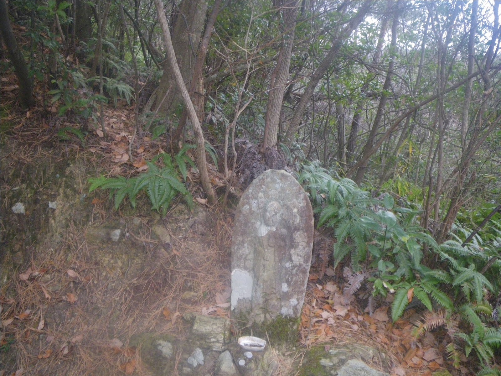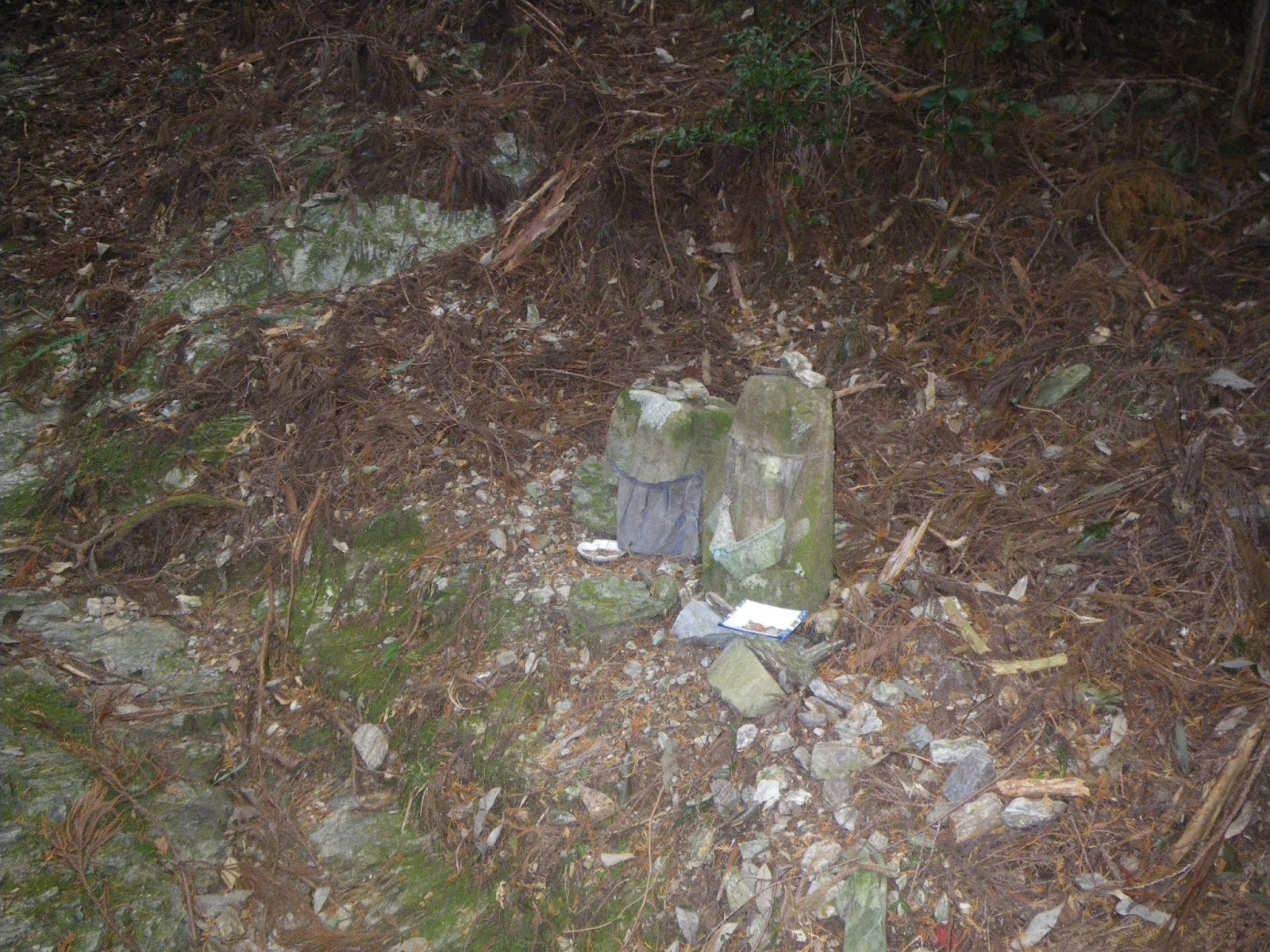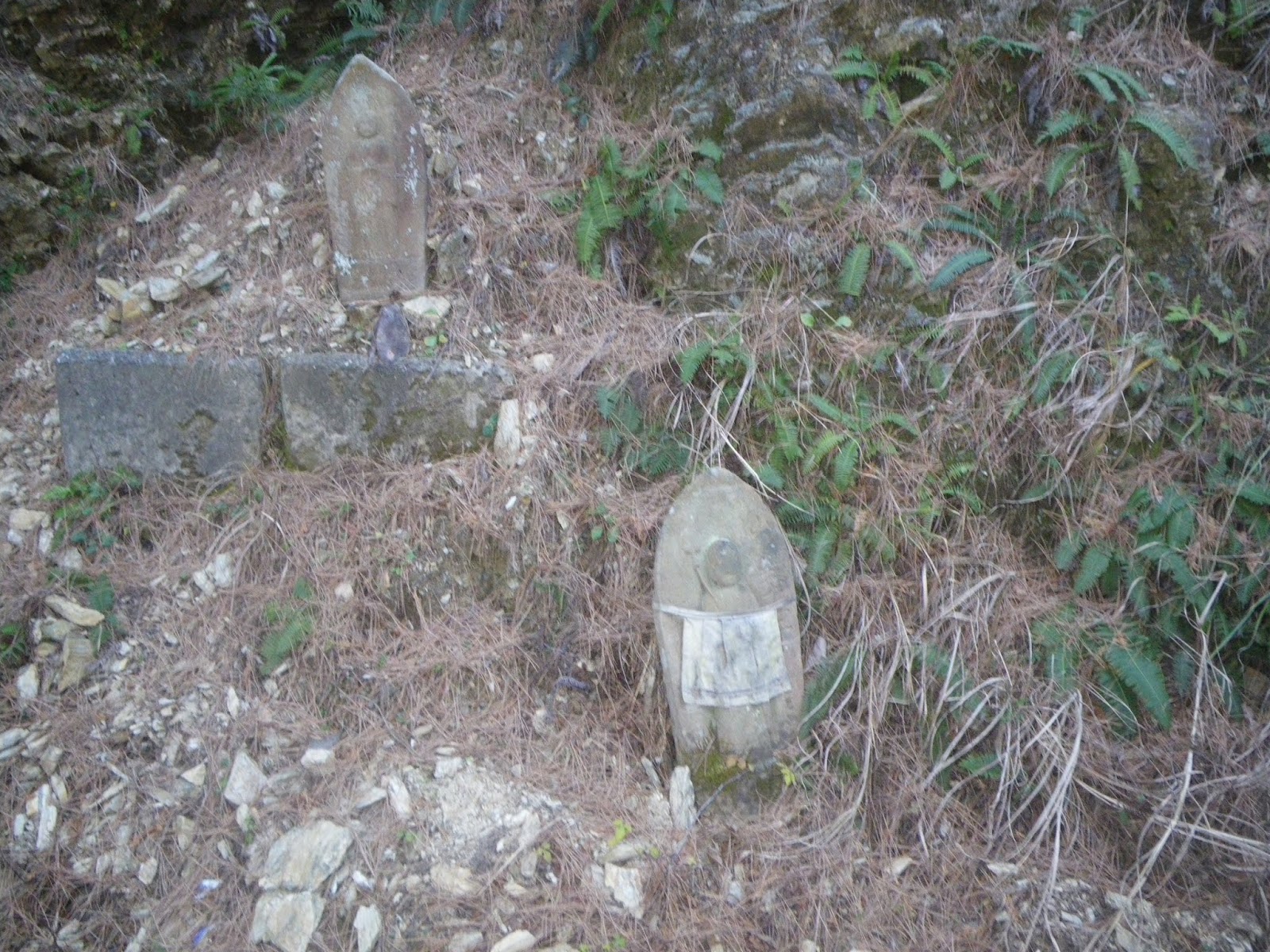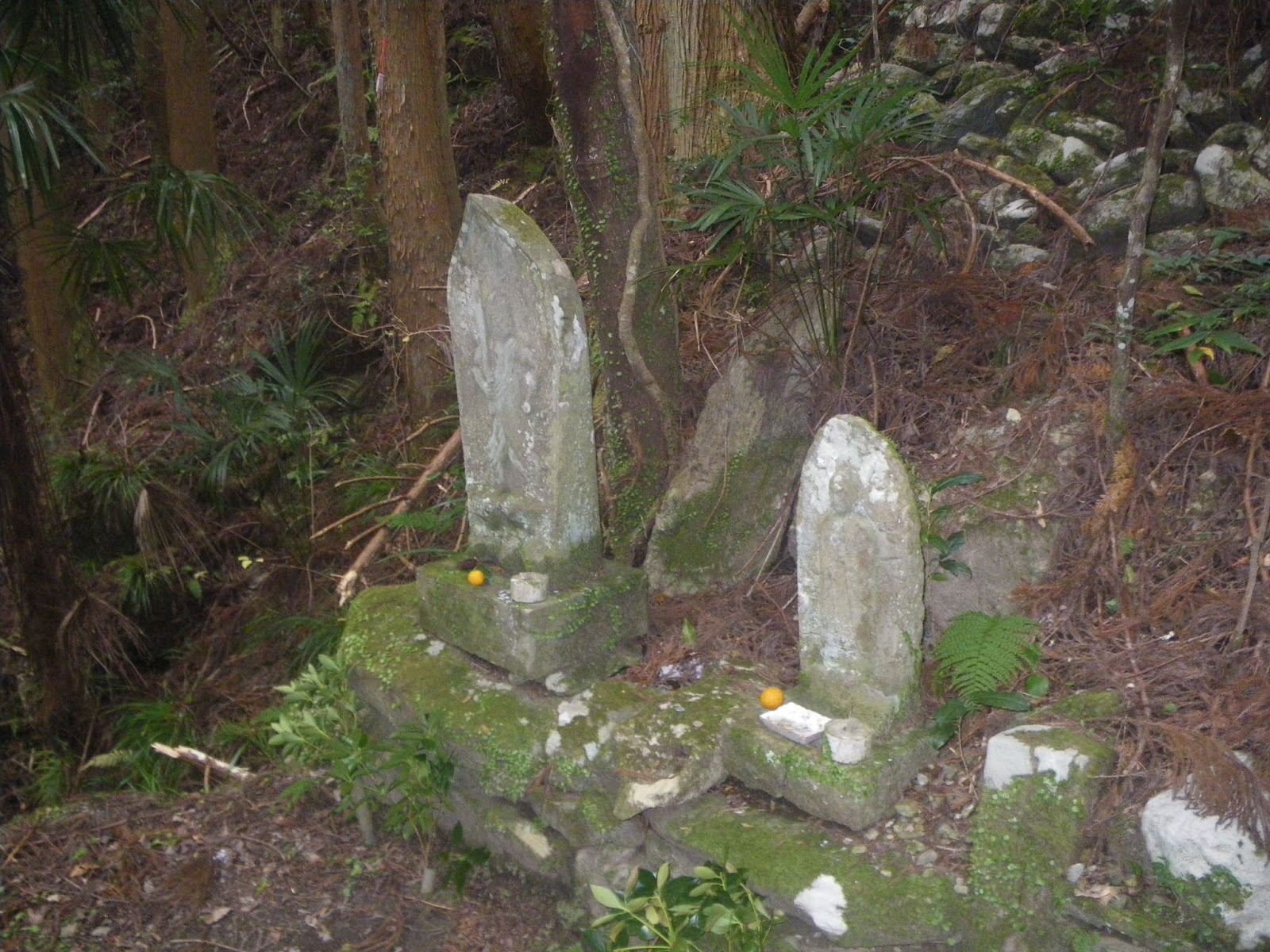 岩場の急坂を上る。角柱丁石と石仏が並ぶ(午後12時50分)。石仏は遍路墓だろう。角柱丁石は「十四丁」だろうか。