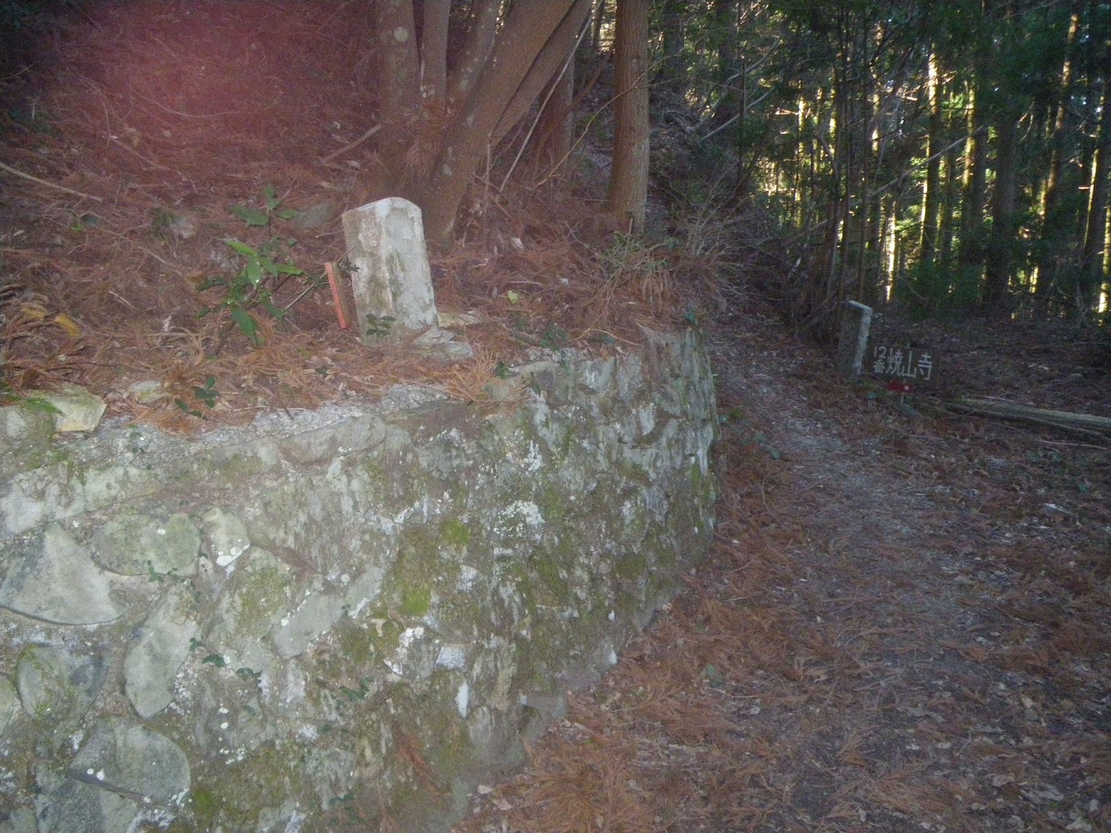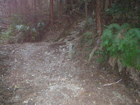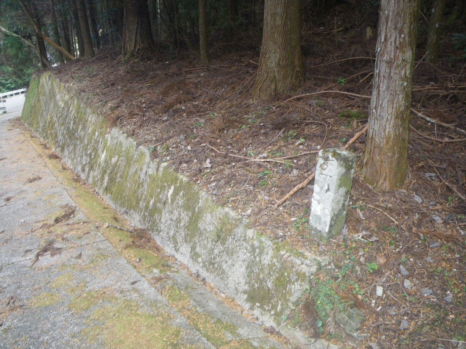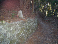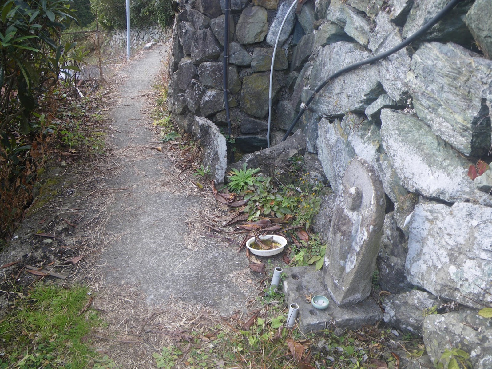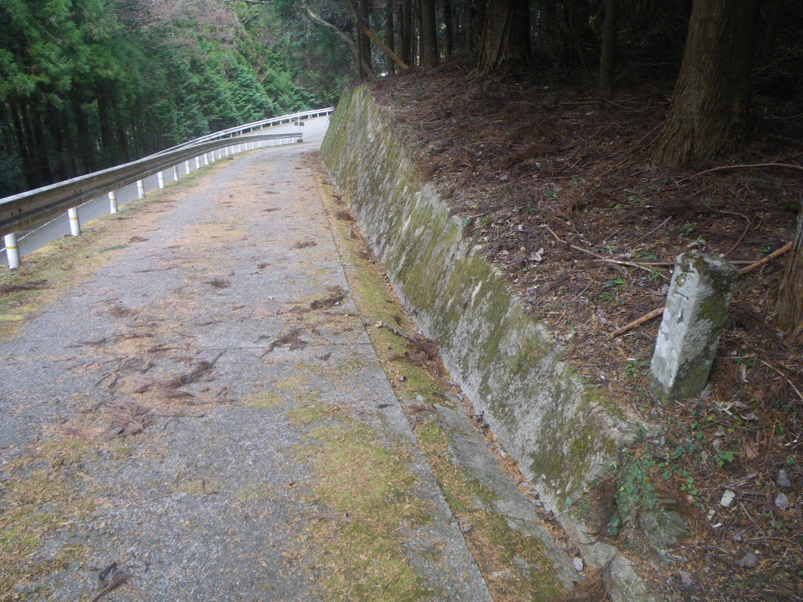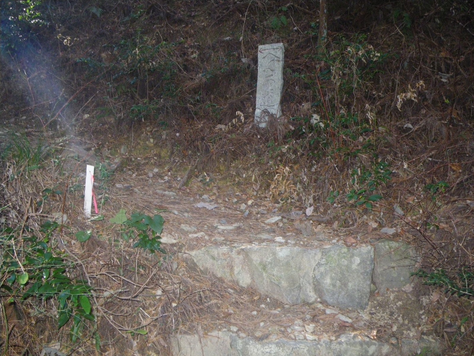 杖杉庵から先の遍路道は車道を離れ土径を下る(午後3時)。杖杉庵東端に土径への下り口。その両側に標石が立つ。左手は中尾多七標石。右手には角柱丁石。「十三丁」だろう。