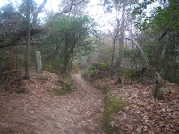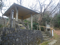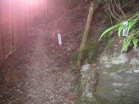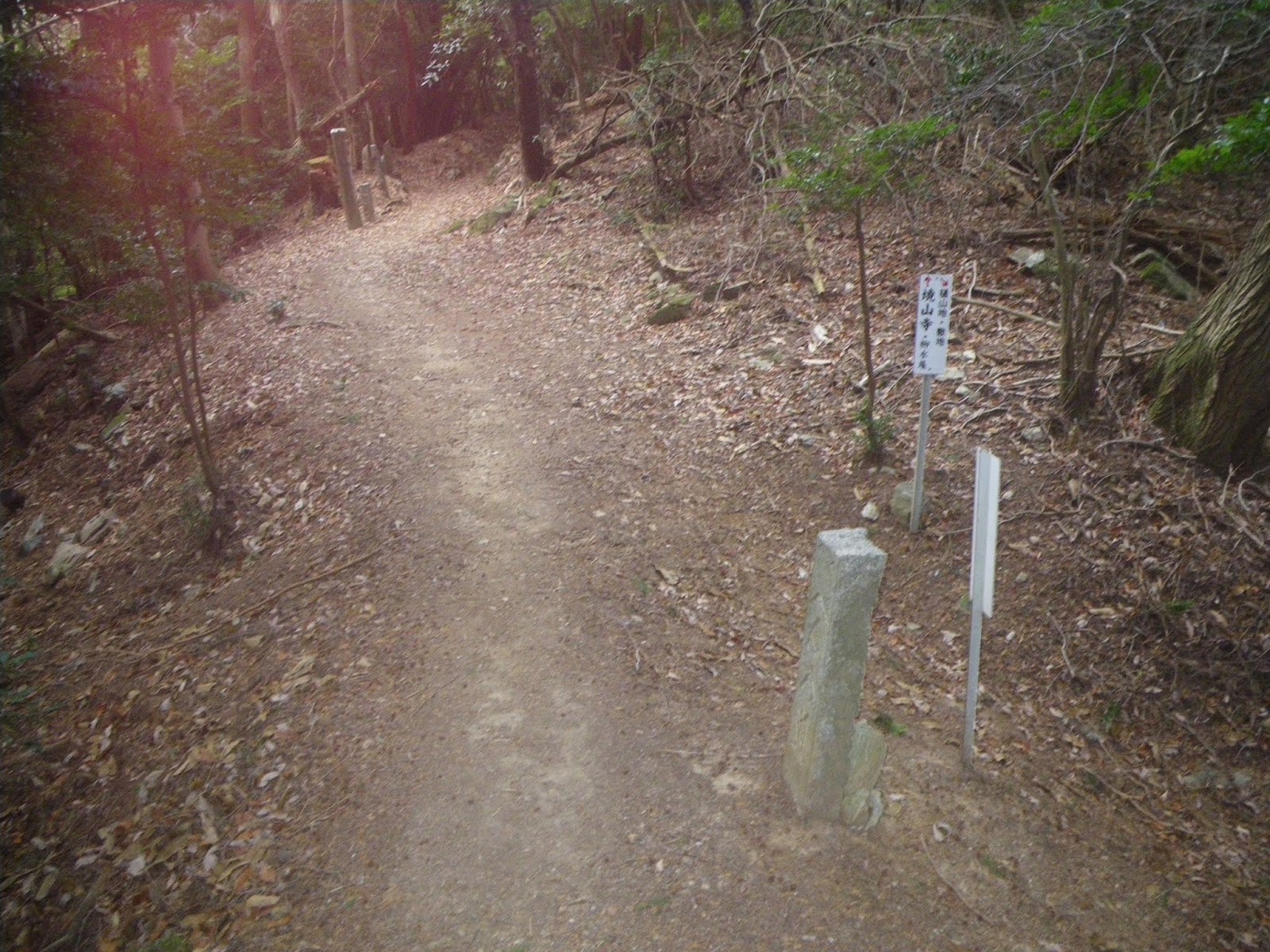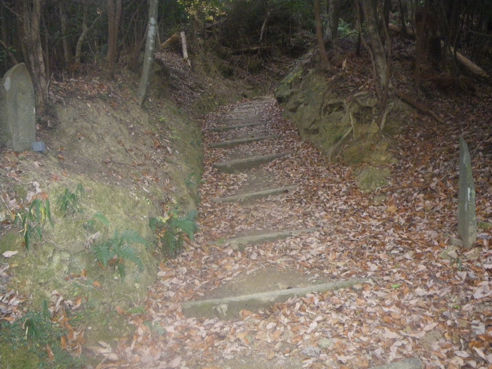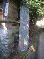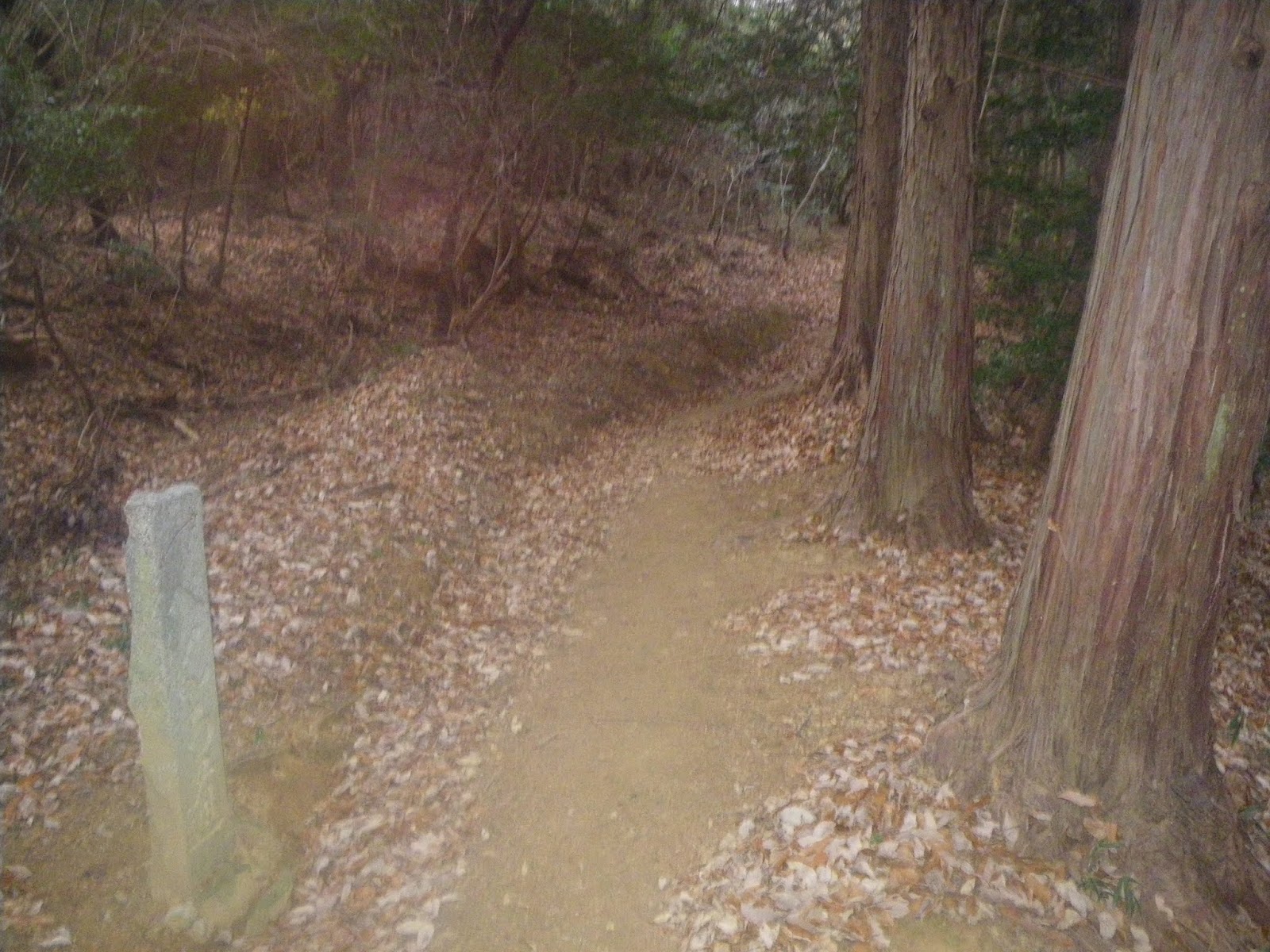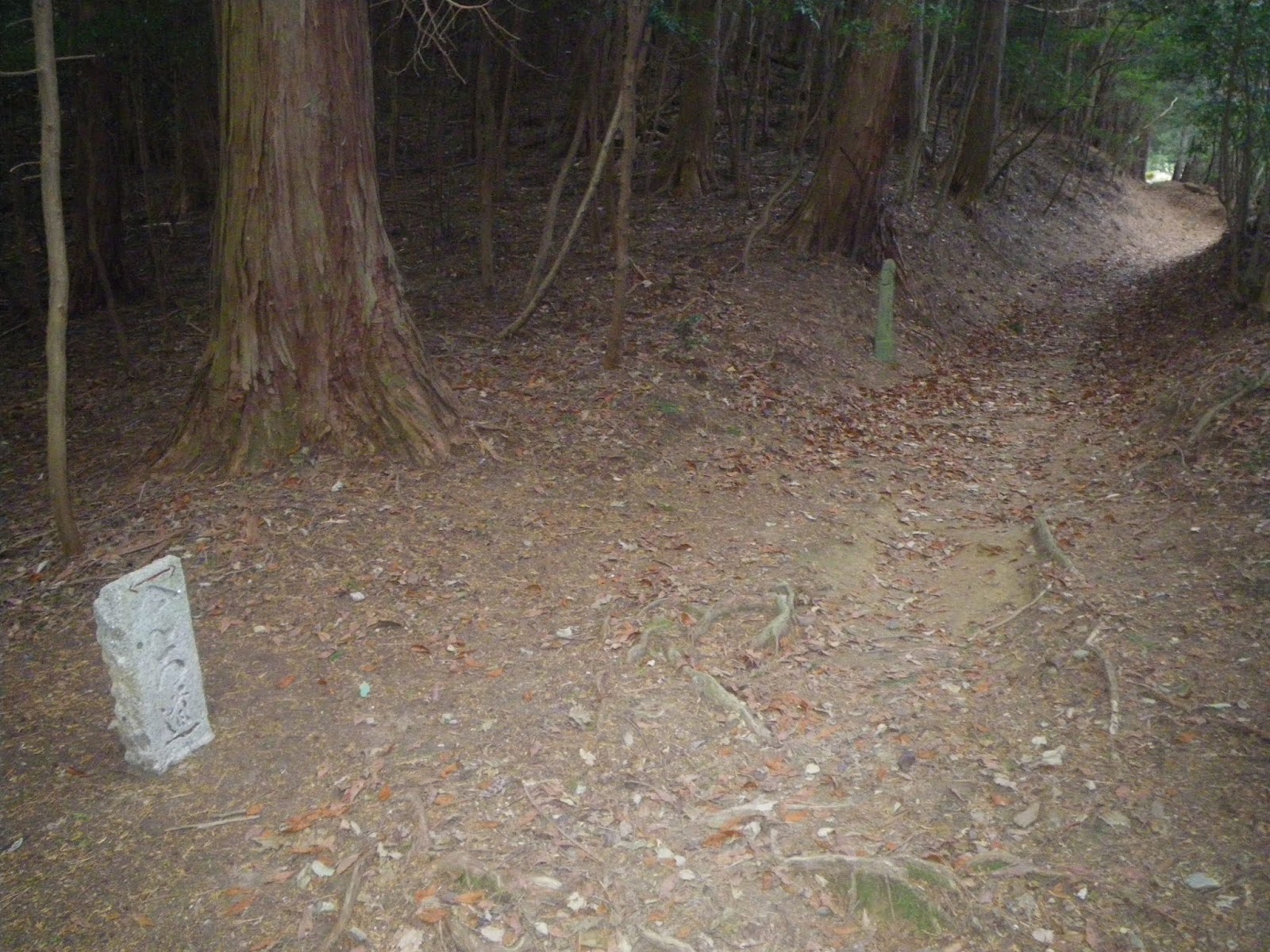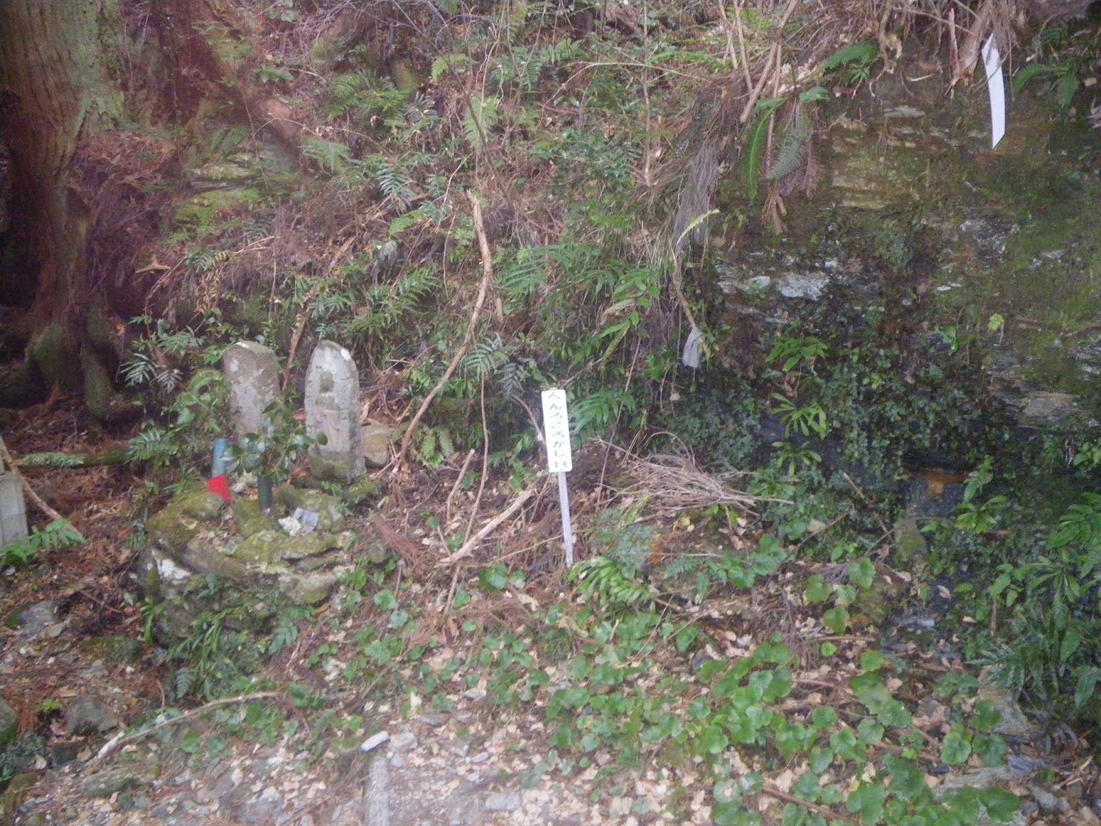 杖杉庵から先の遍路道は車道を離れ土径を下る(午後3時)。杖杉庵東端に土径への下り口。その両側に標石が立つ。左手は中尾多七標石。右手には角柱丁石。「十三丁」だろう。