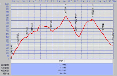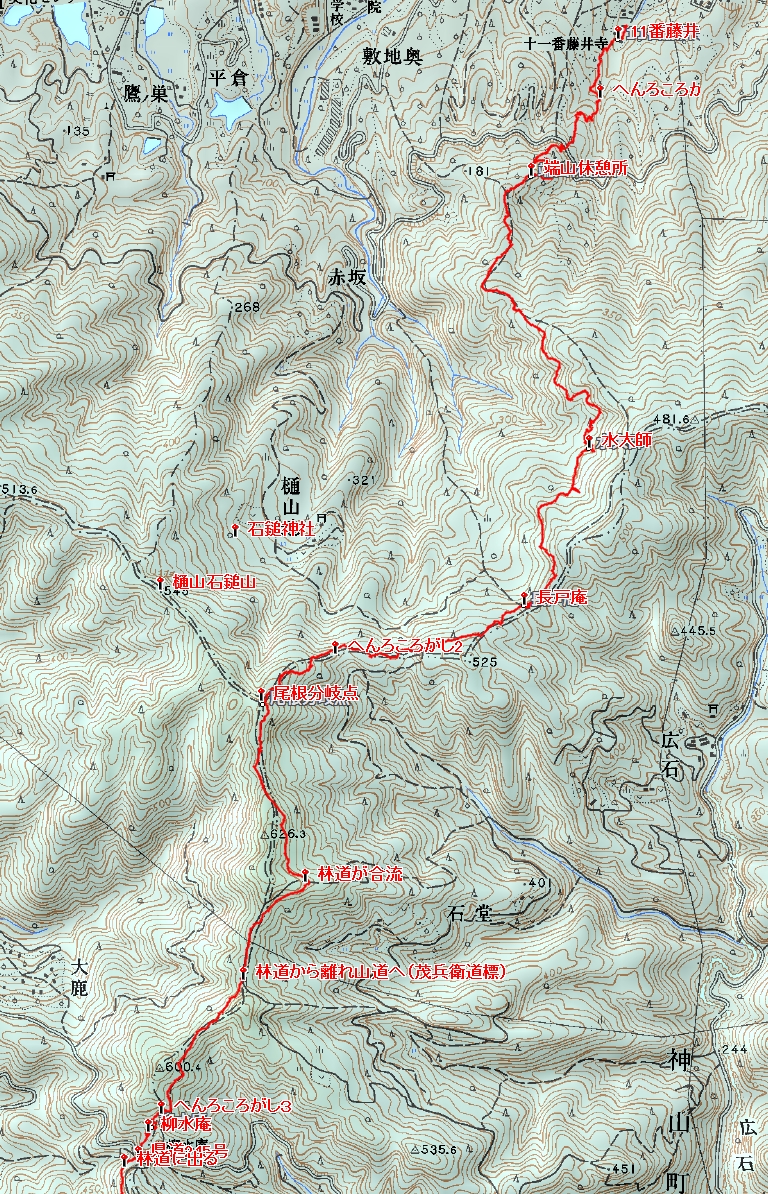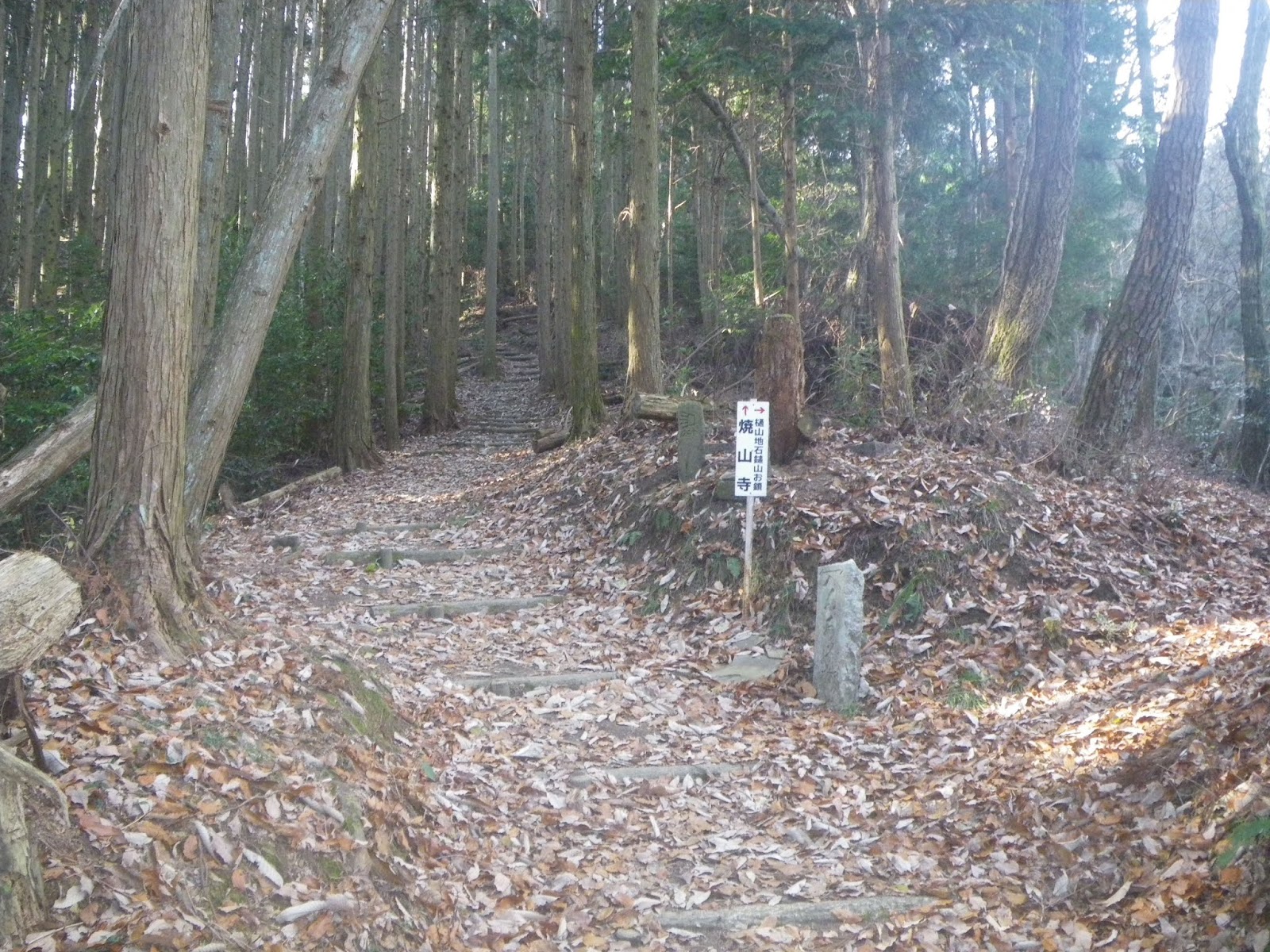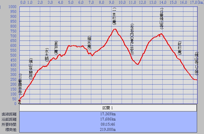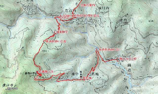 標高430mほどの左右内集落の谷筋から焼山寺山の山腹、標高700mほどところに立つ焼山寺を経て、バス停のある焼山寺山裾の標高250mの岩鍋集落へ下る。焼山寺まで2キロ・比高差270m、焼山寺から岩鍋集落まで3.5km・比高差450m(5.5km;最大比高差450m)