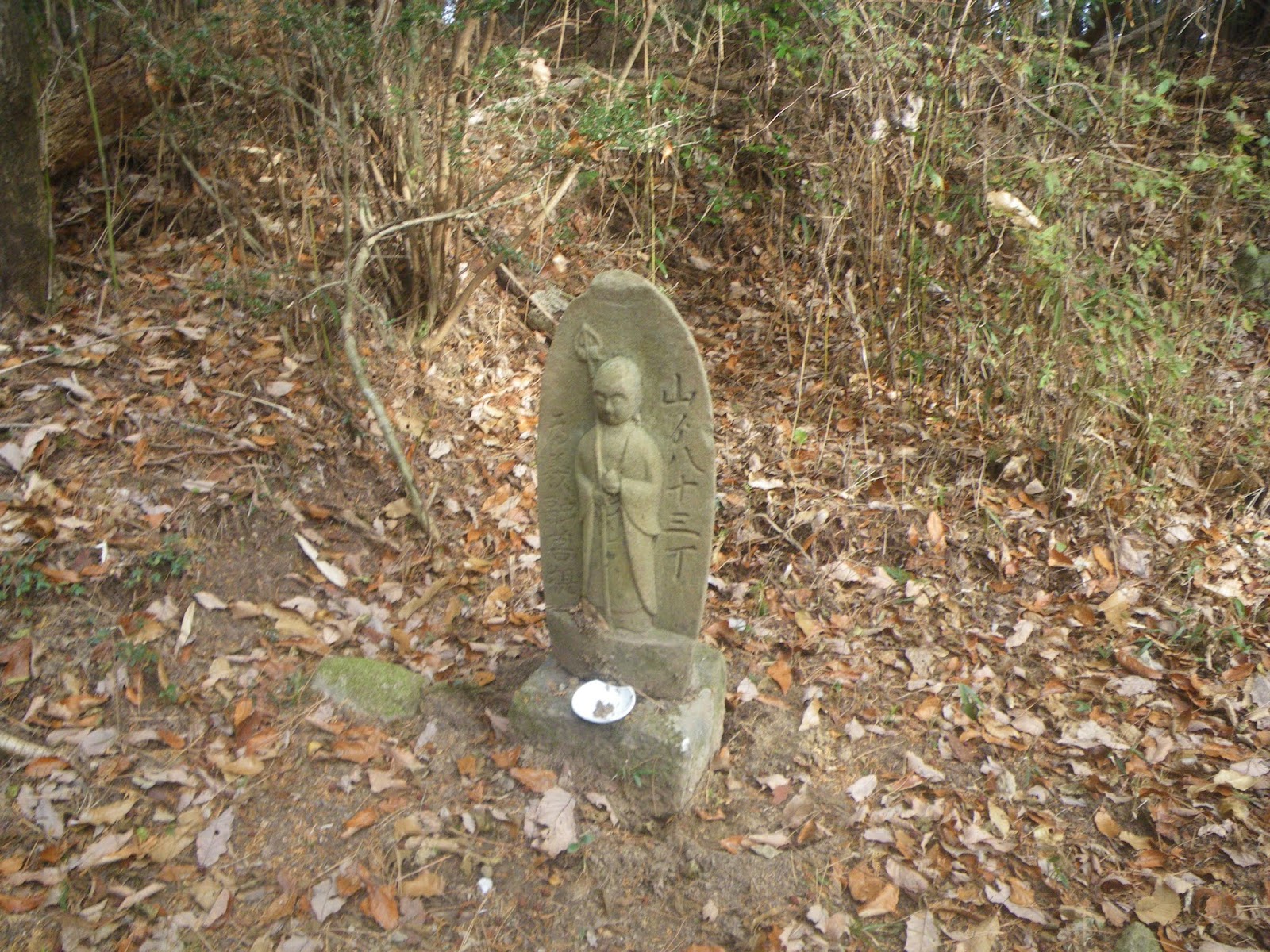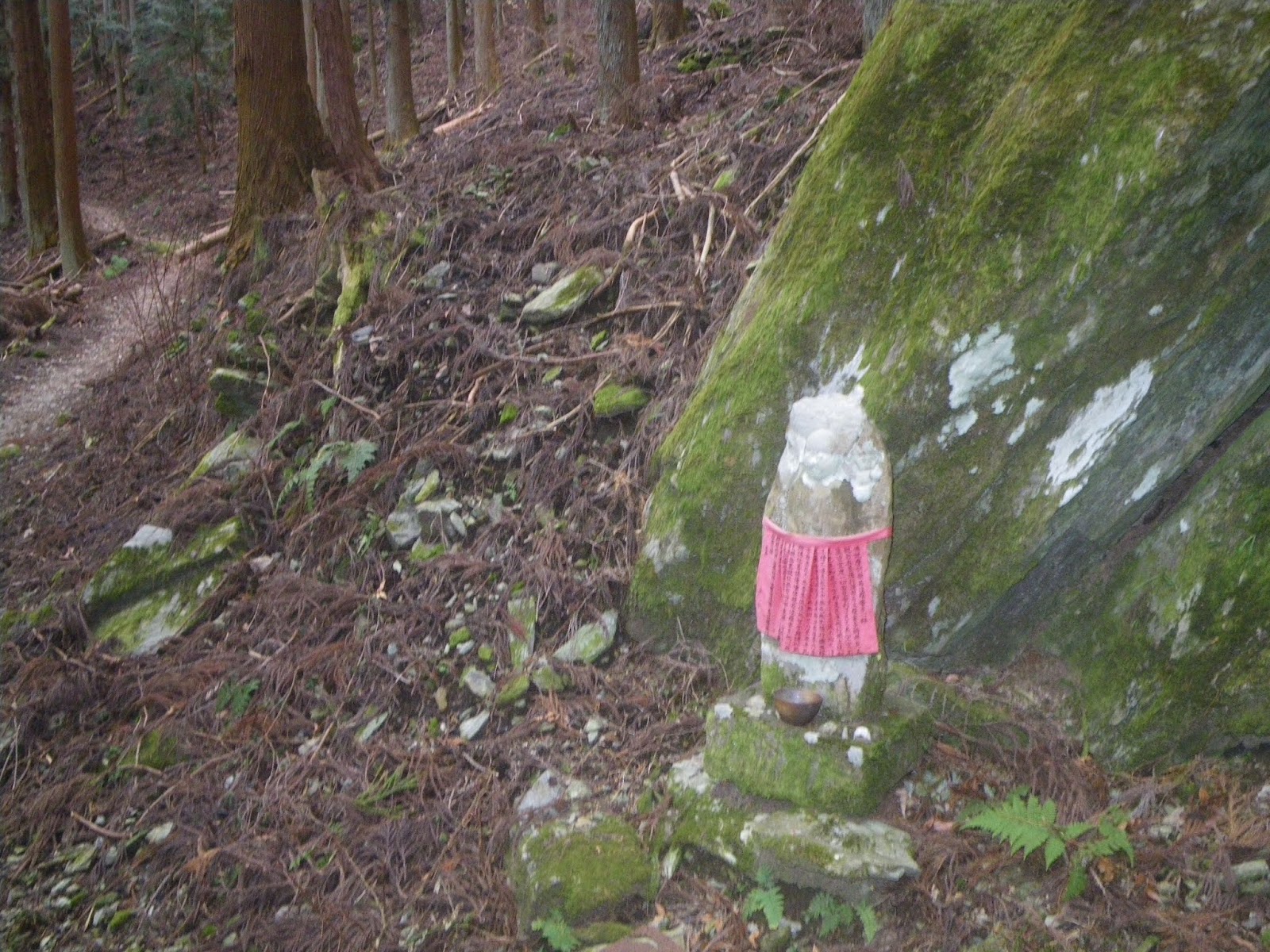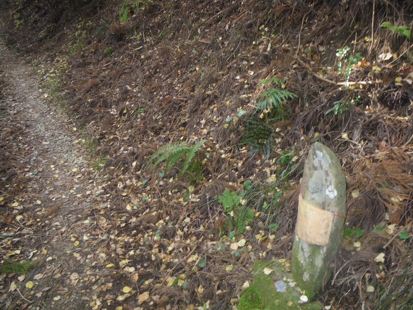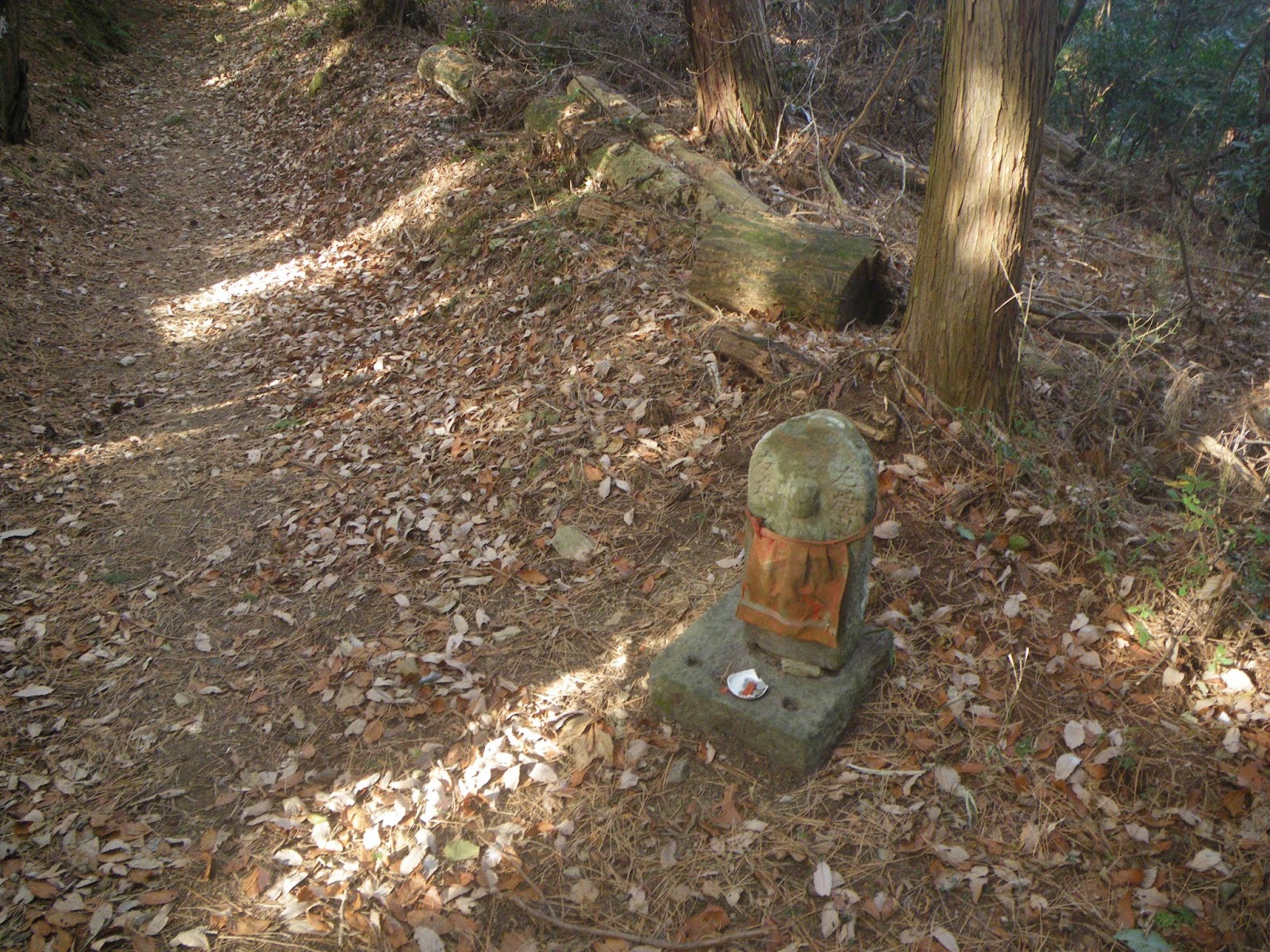 直ぐに急坂の案内(午後12時8分)。比高差100mほどを一気に下る。道脇に傾いた舟形地蔵。丁石だろうが丁数は読めない。痛めた膝が辛い。