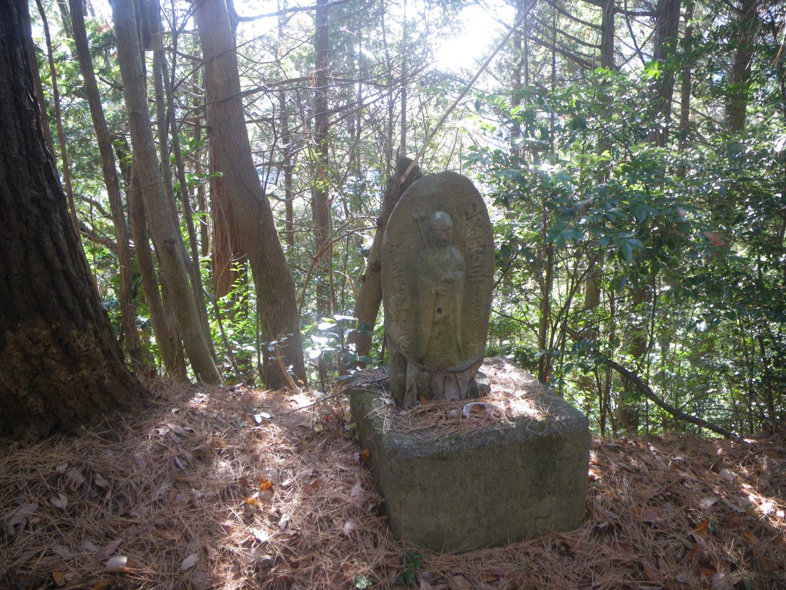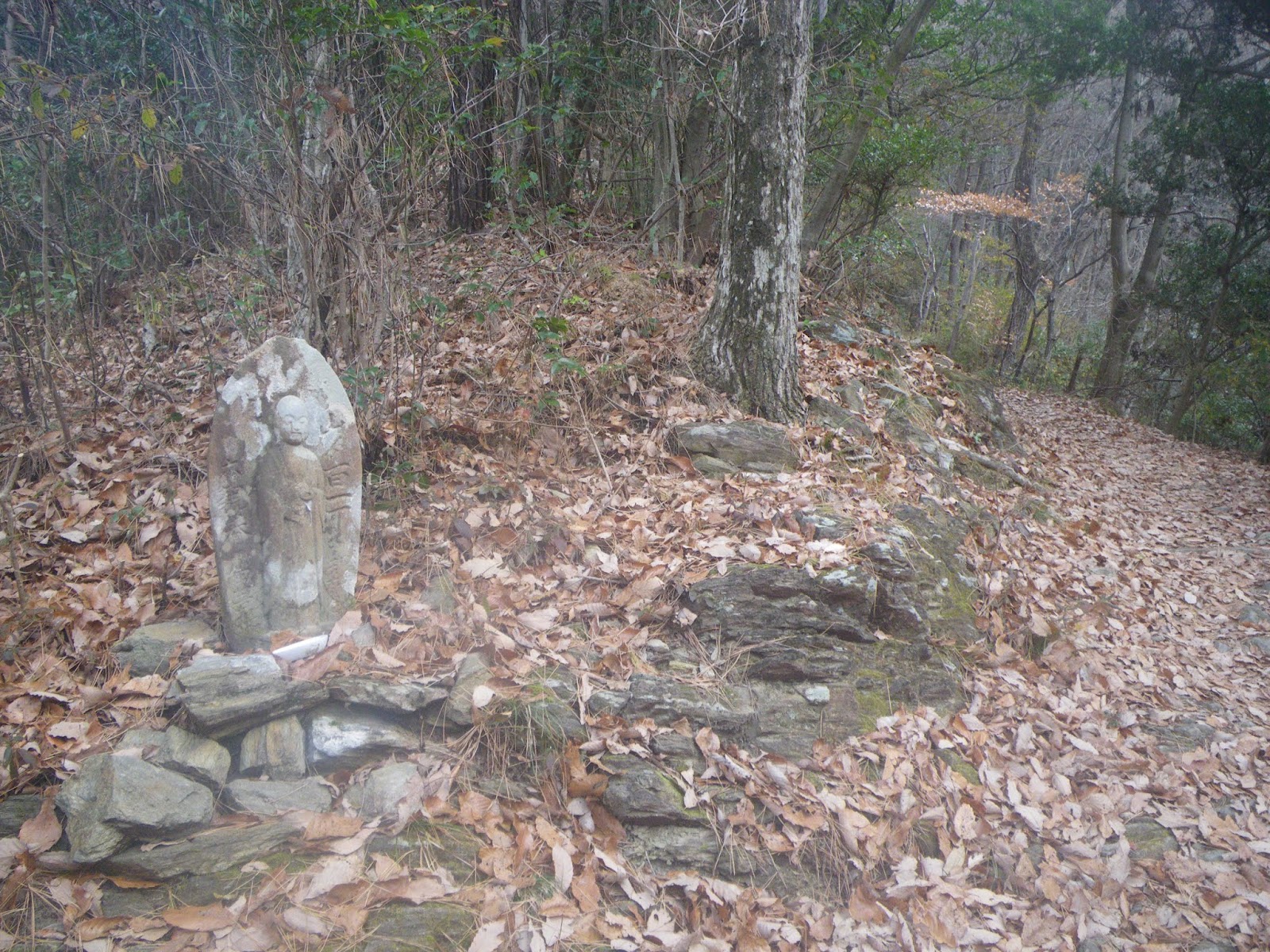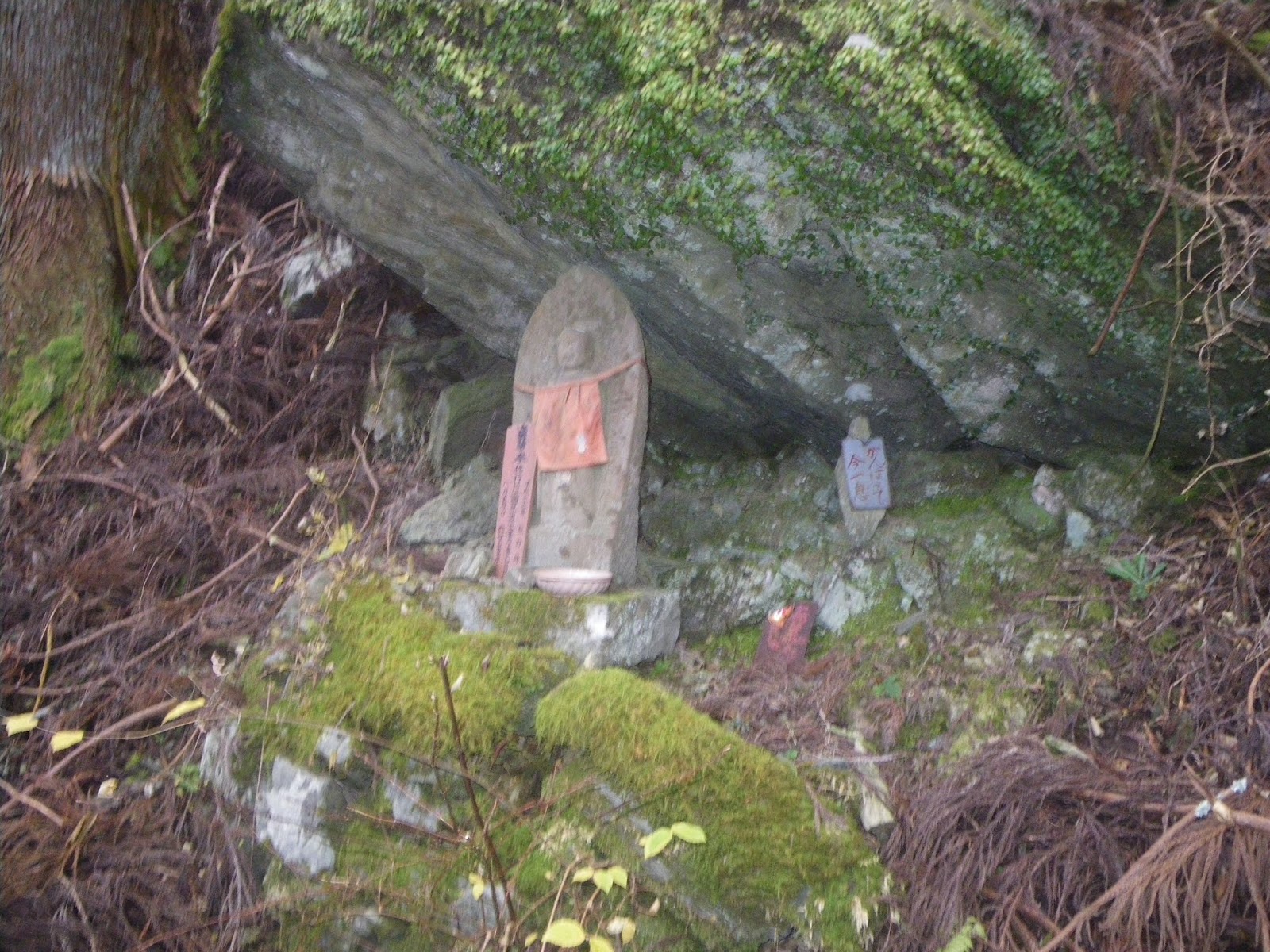 直ぐに急坂の案内(午後12時8分)。比高差100mほどを一気に下る。道脇に傾いた舟形地蔵。丁石だろうが丁数は読めない。痛めた膝が辛い。