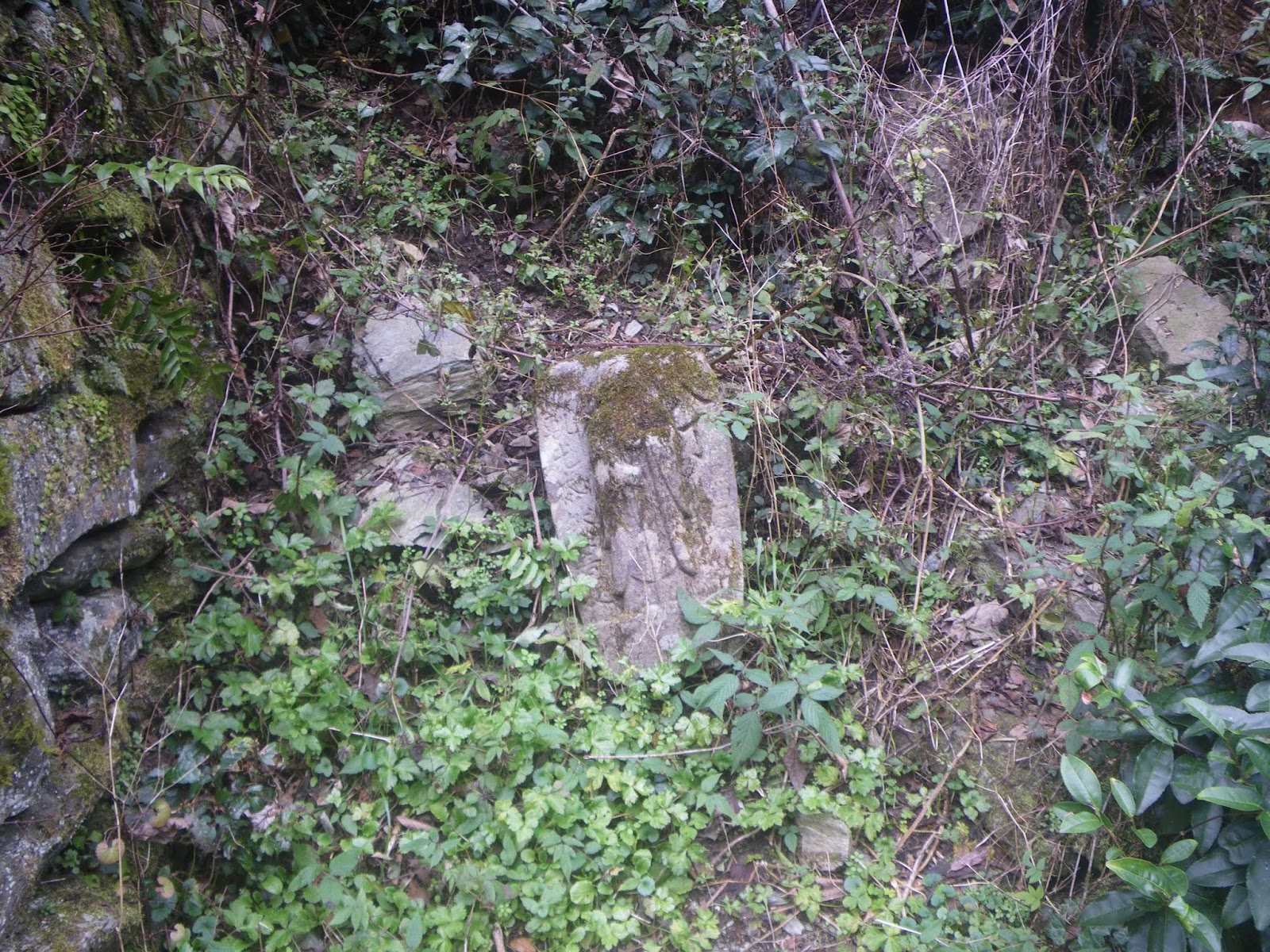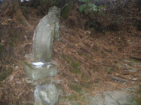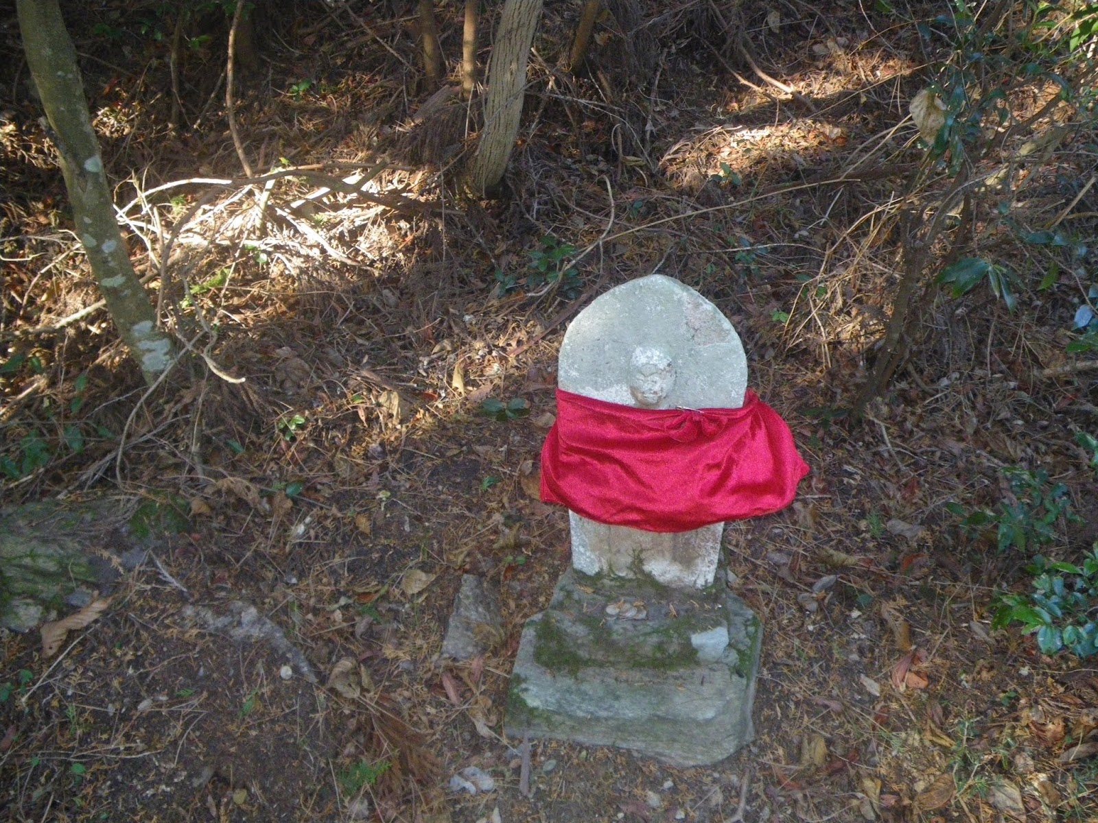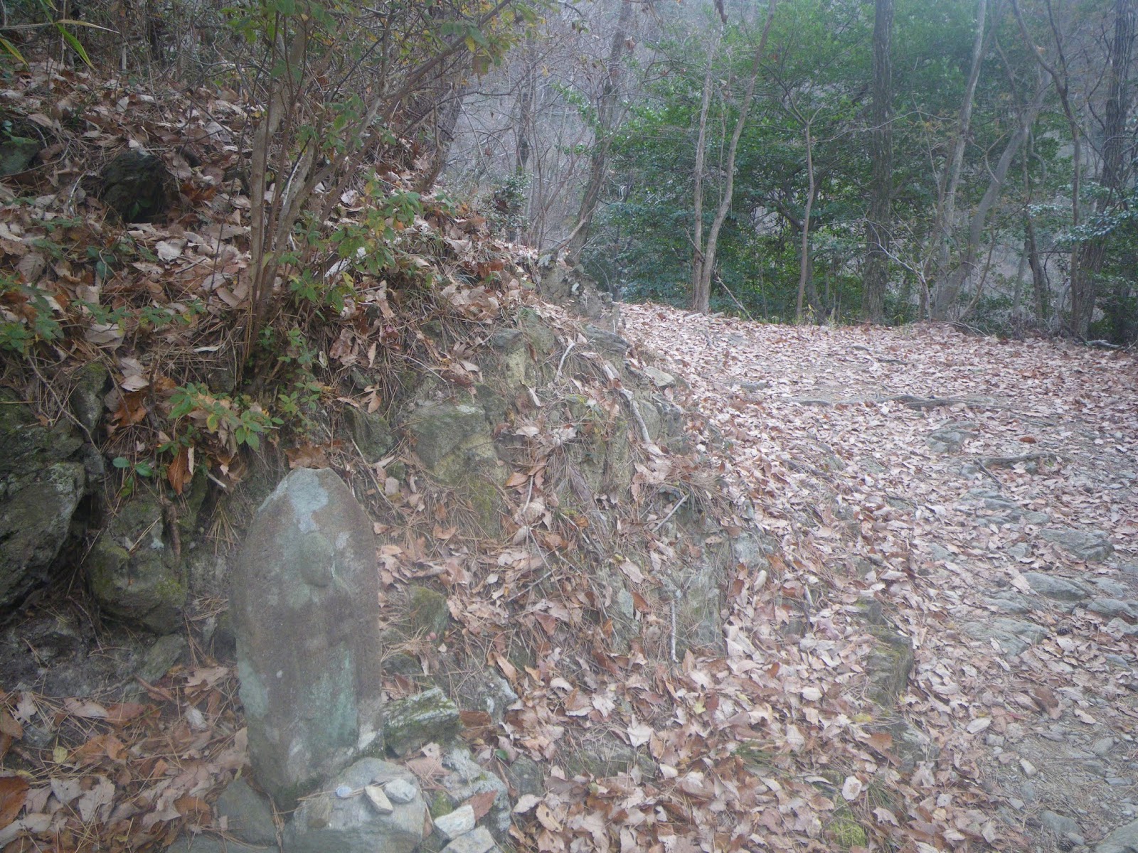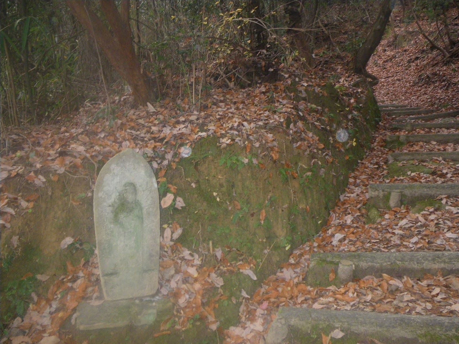直ぐに急坂の案内(午後12時8分)。比高差100mほどを一気に下る。道脇に傾いた舟形地蔵。丁石だろうが丁数は読めない。痛めた膝が辛い。