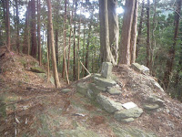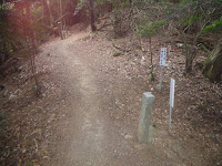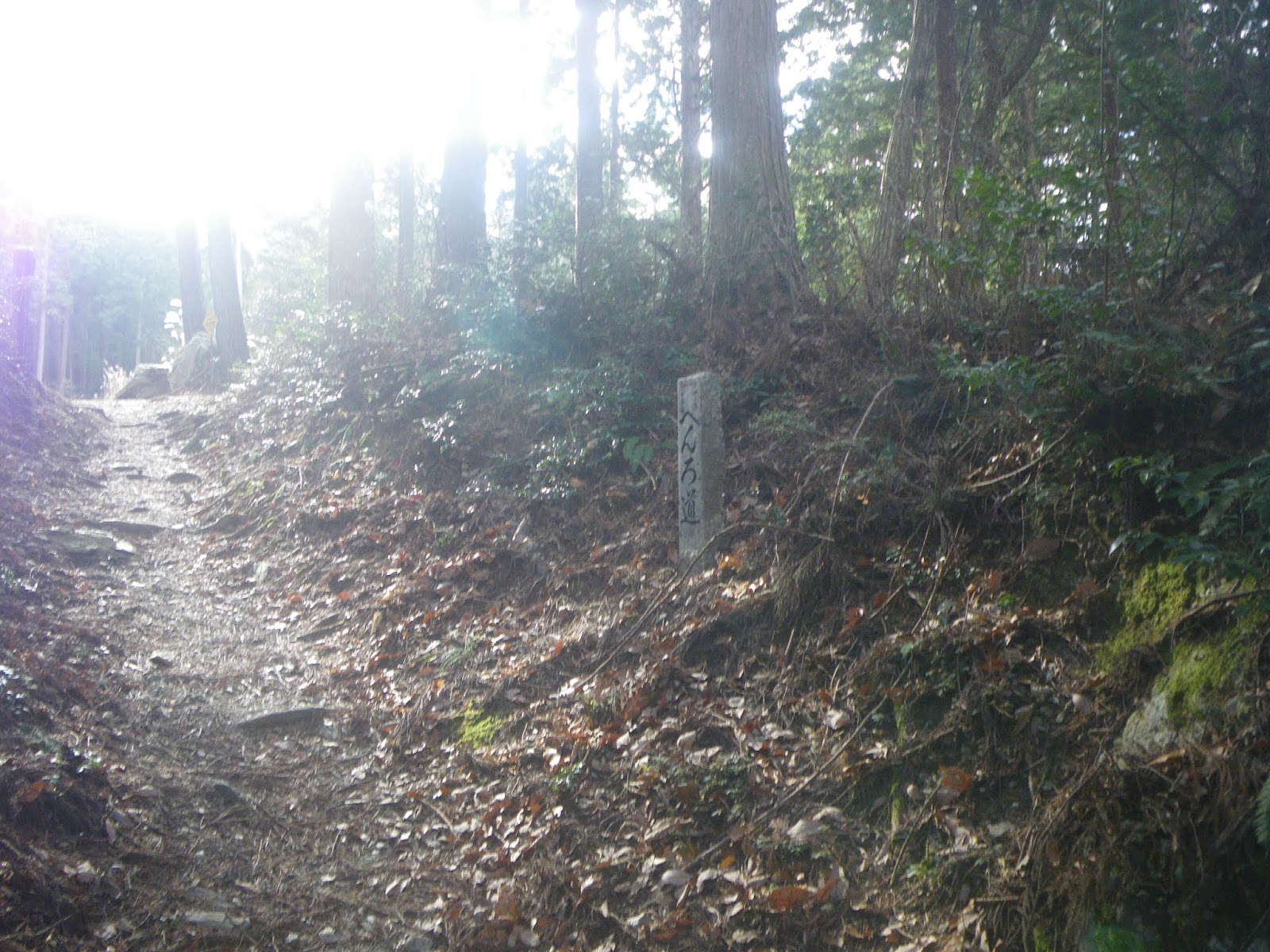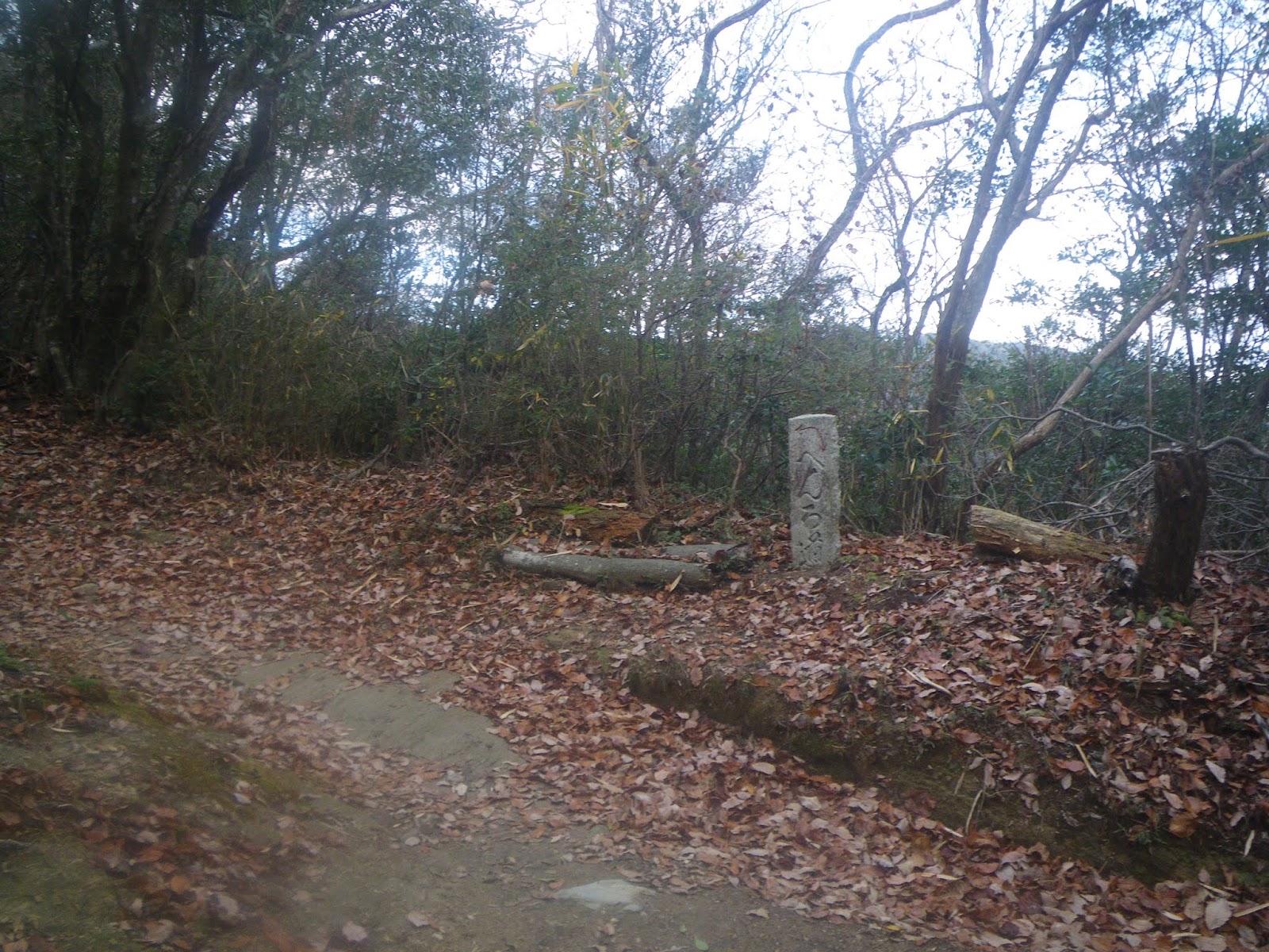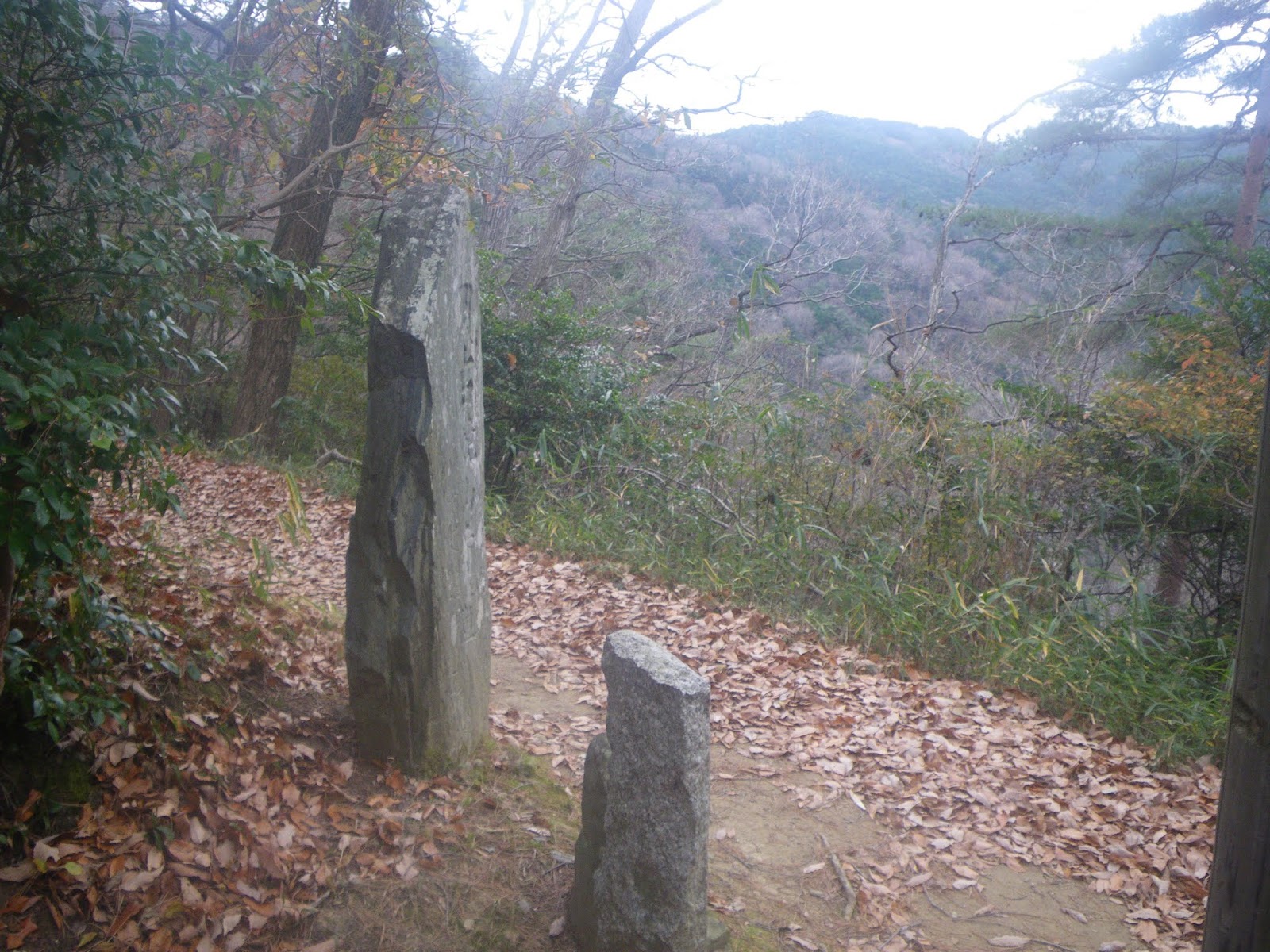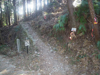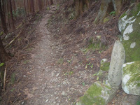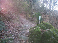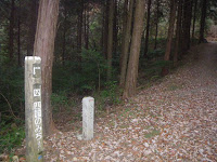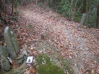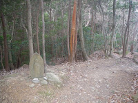 山道を5分ほど歩くと東西に山を越える林道に一瞬合流(午前10時49分)。標石に従い直ぐ山道に入る。その先に中尾多七標石(午前10時50分)。
