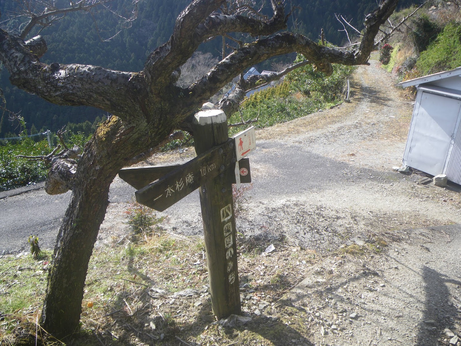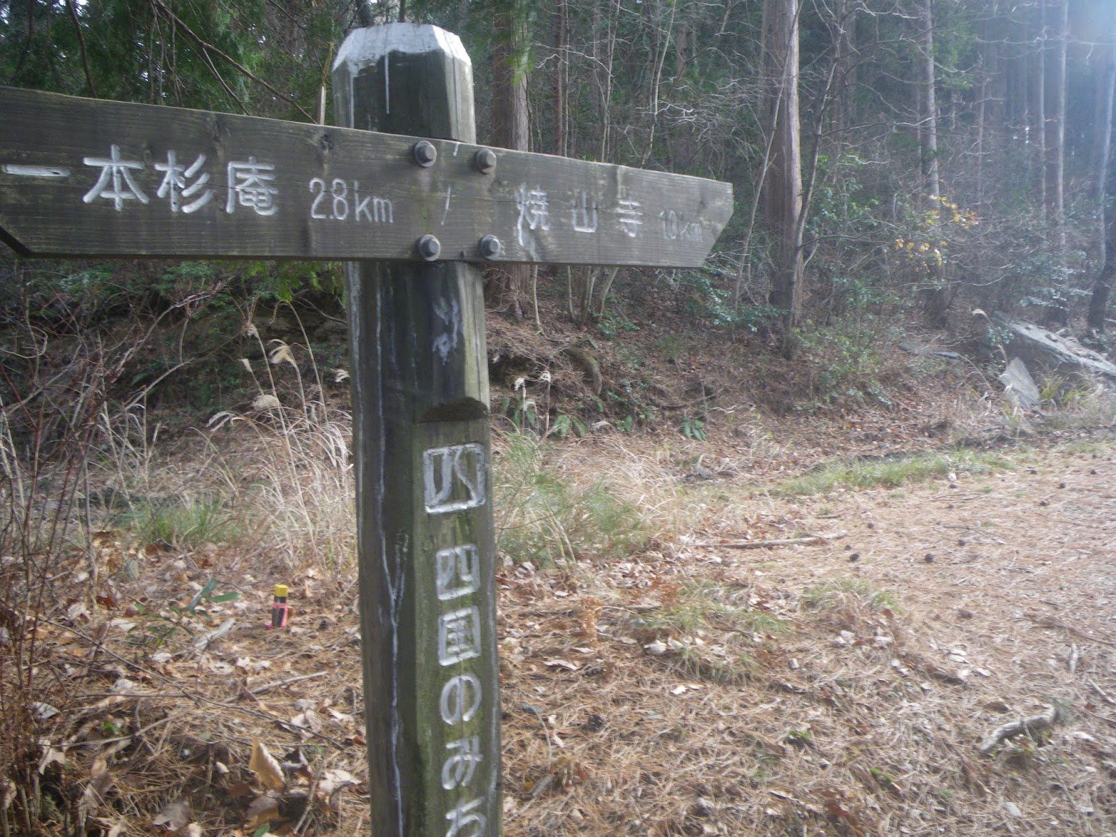 左右内集落に出る。藤井寺を出ておおよそ5時間。ほぼ予定通り。里の舗装道に出たところに「四国のみち」の指導標。「一本杉庵1.8km」とあった。