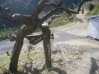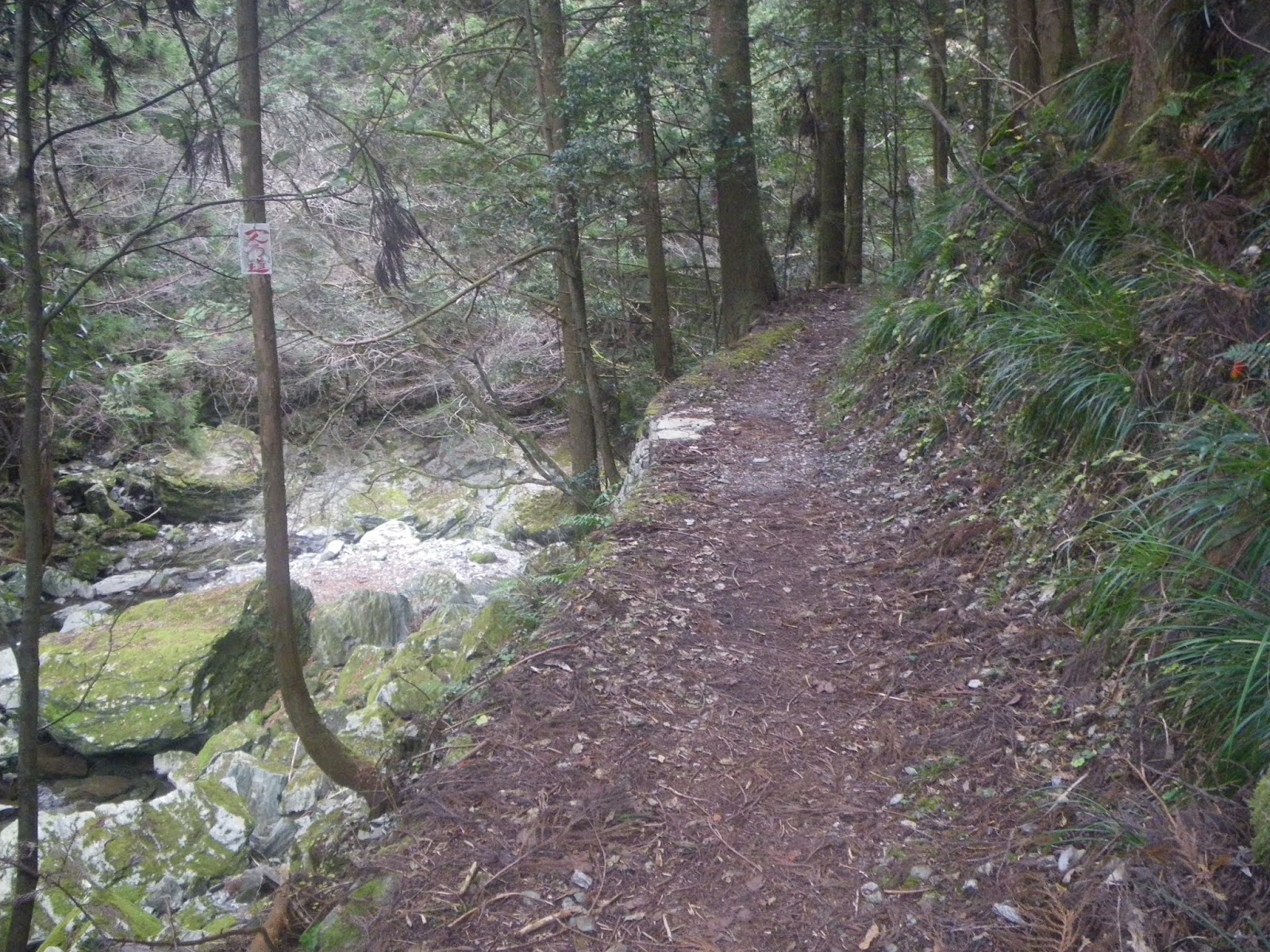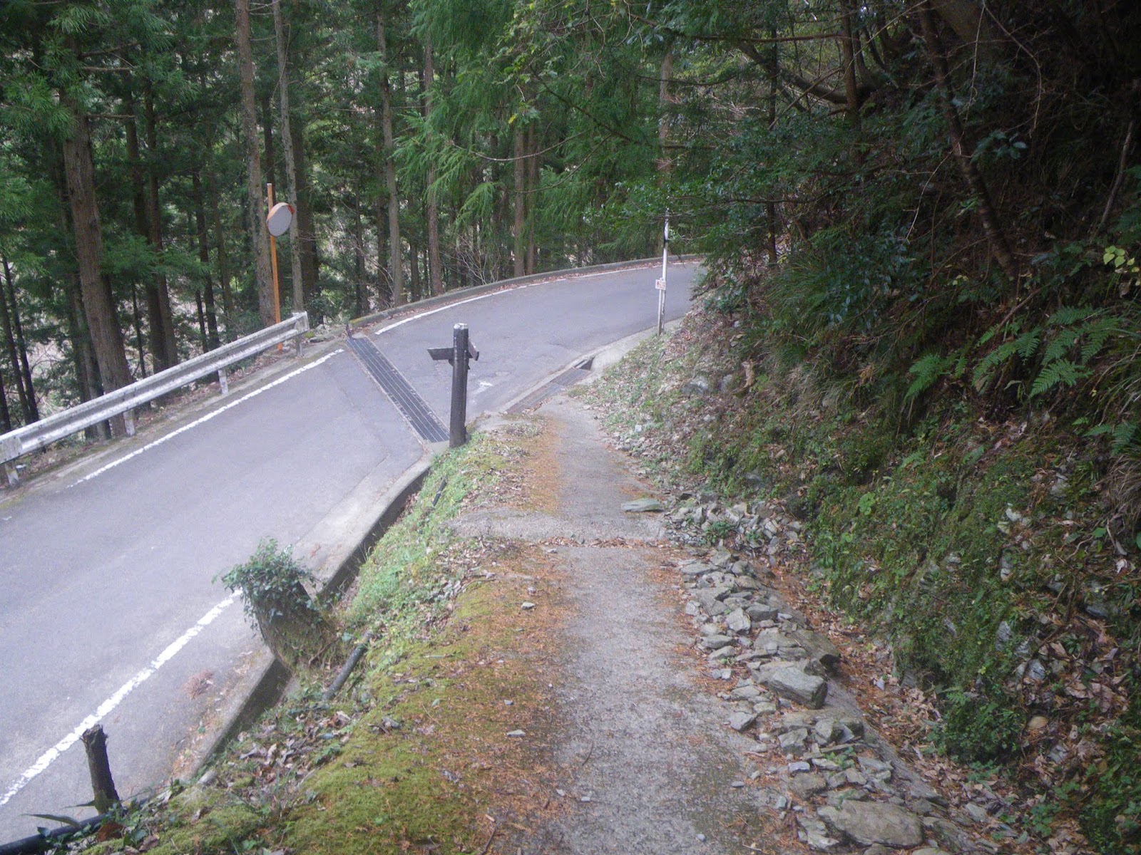 10分弱車道を下に見ながら進み、左右内谷川の手前、道が大きくヘアピン状に曲がる手前で車道に下りる(午後3時19分)。その先は車道を進む。