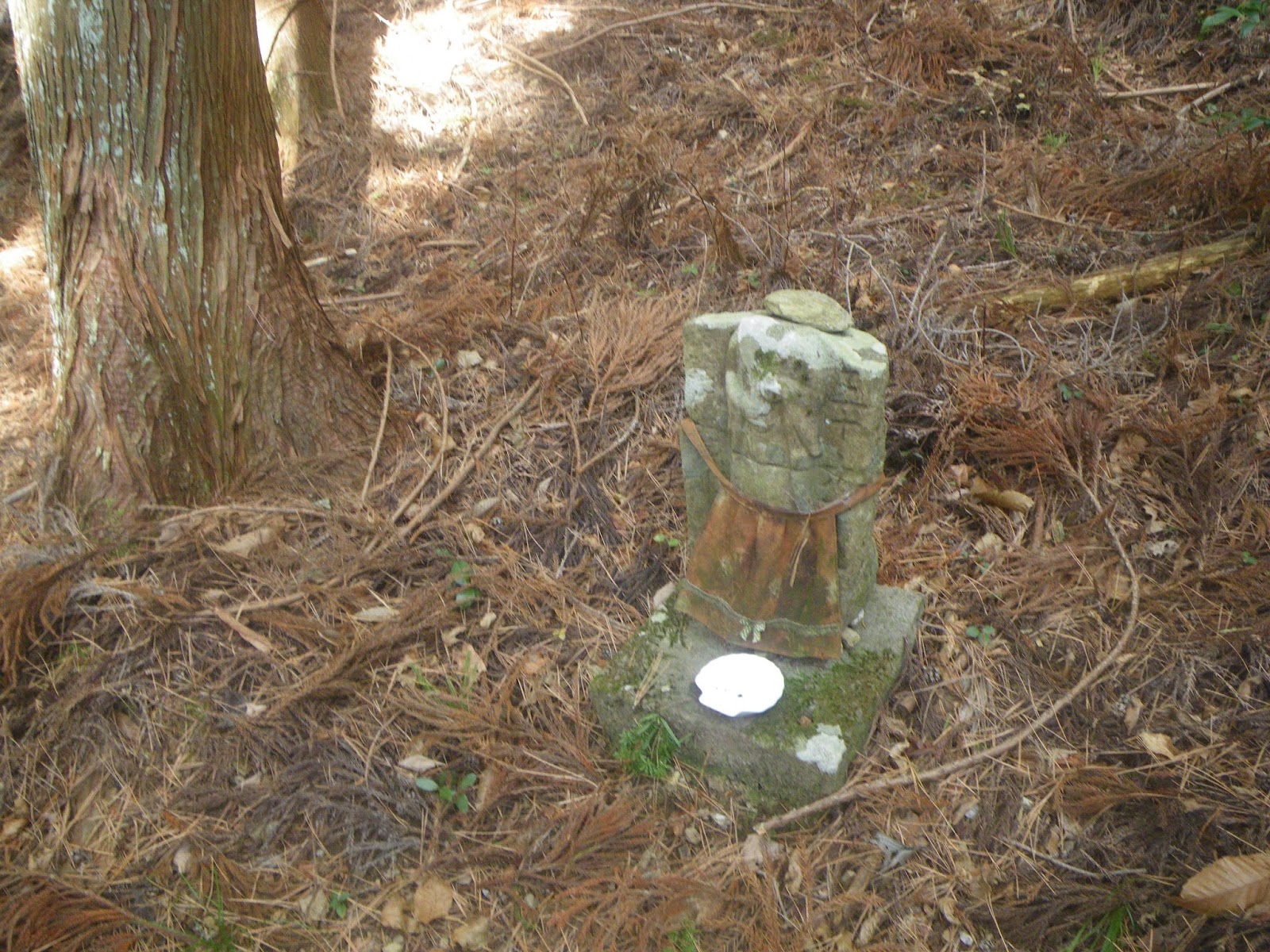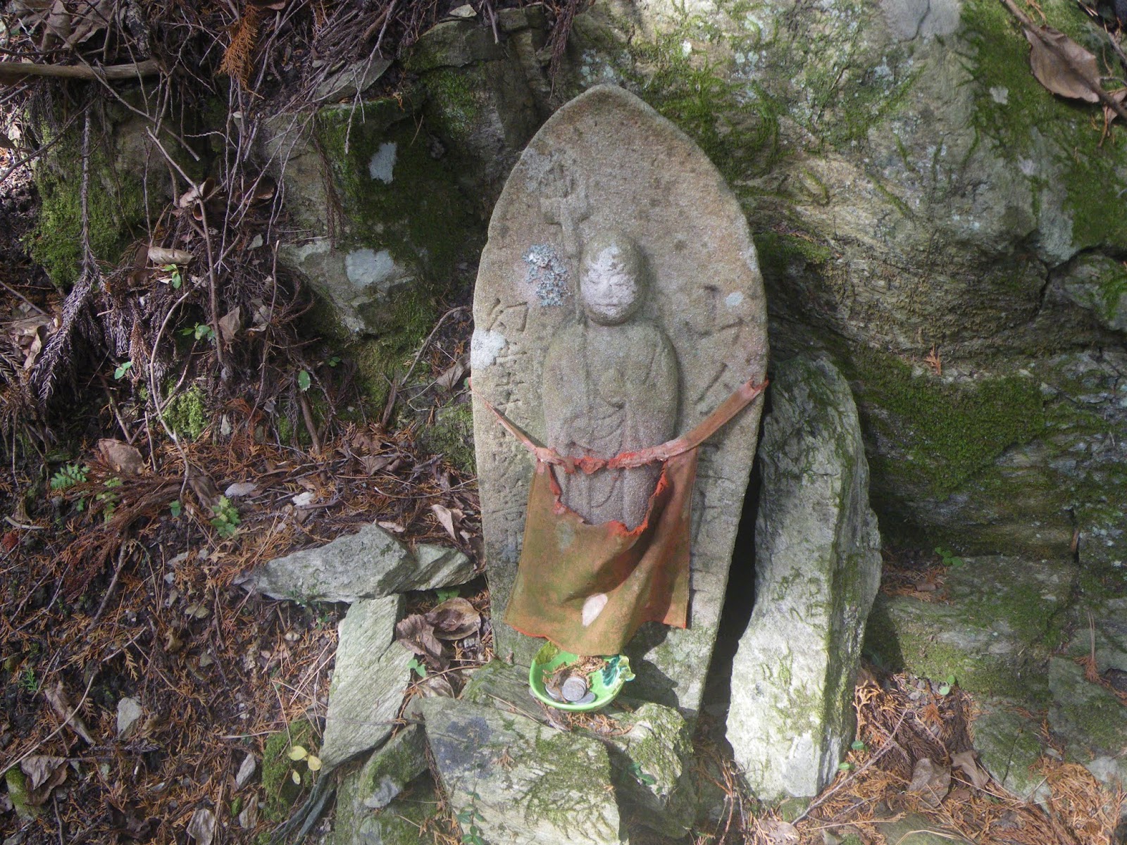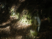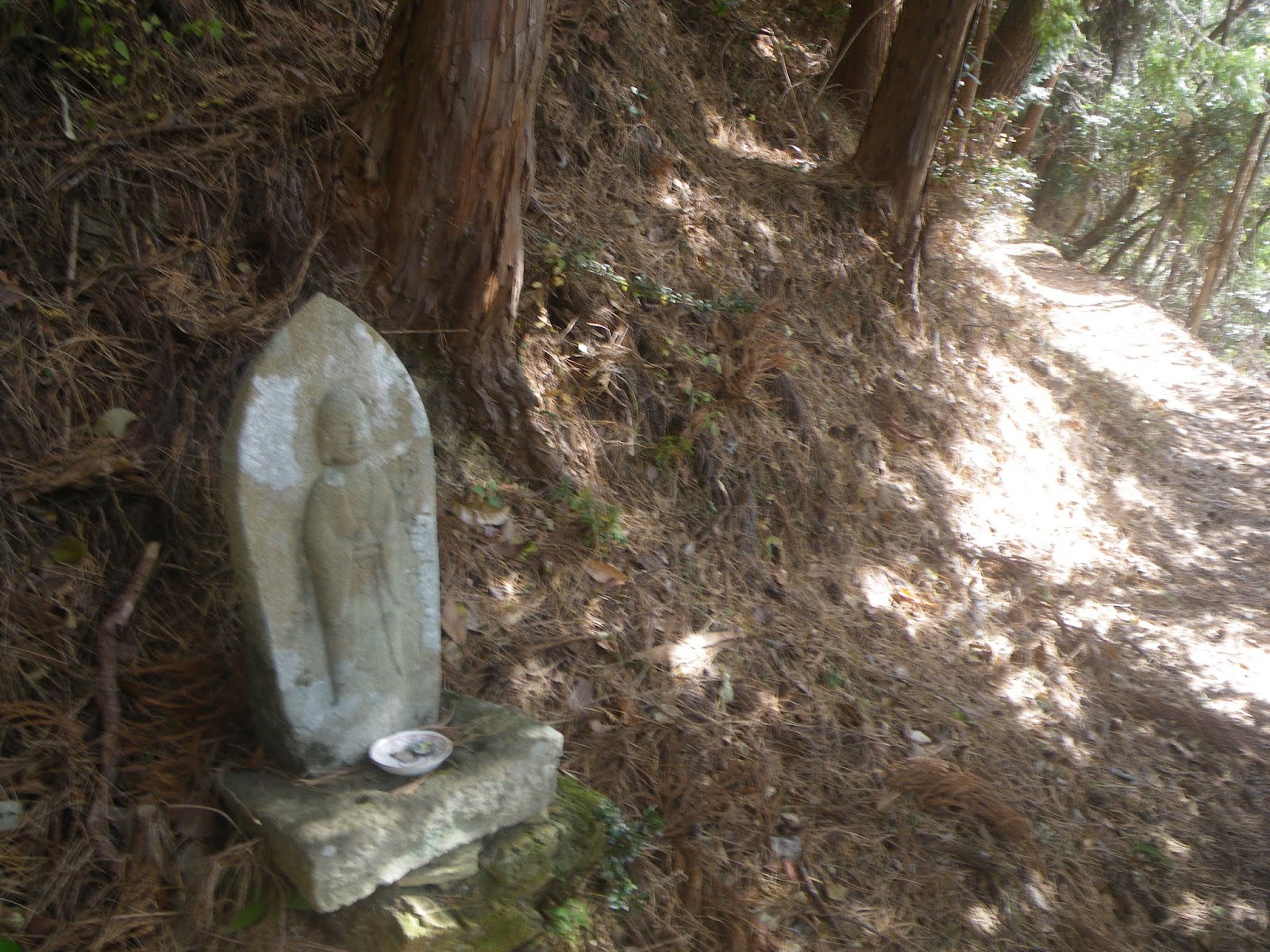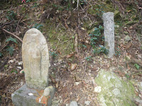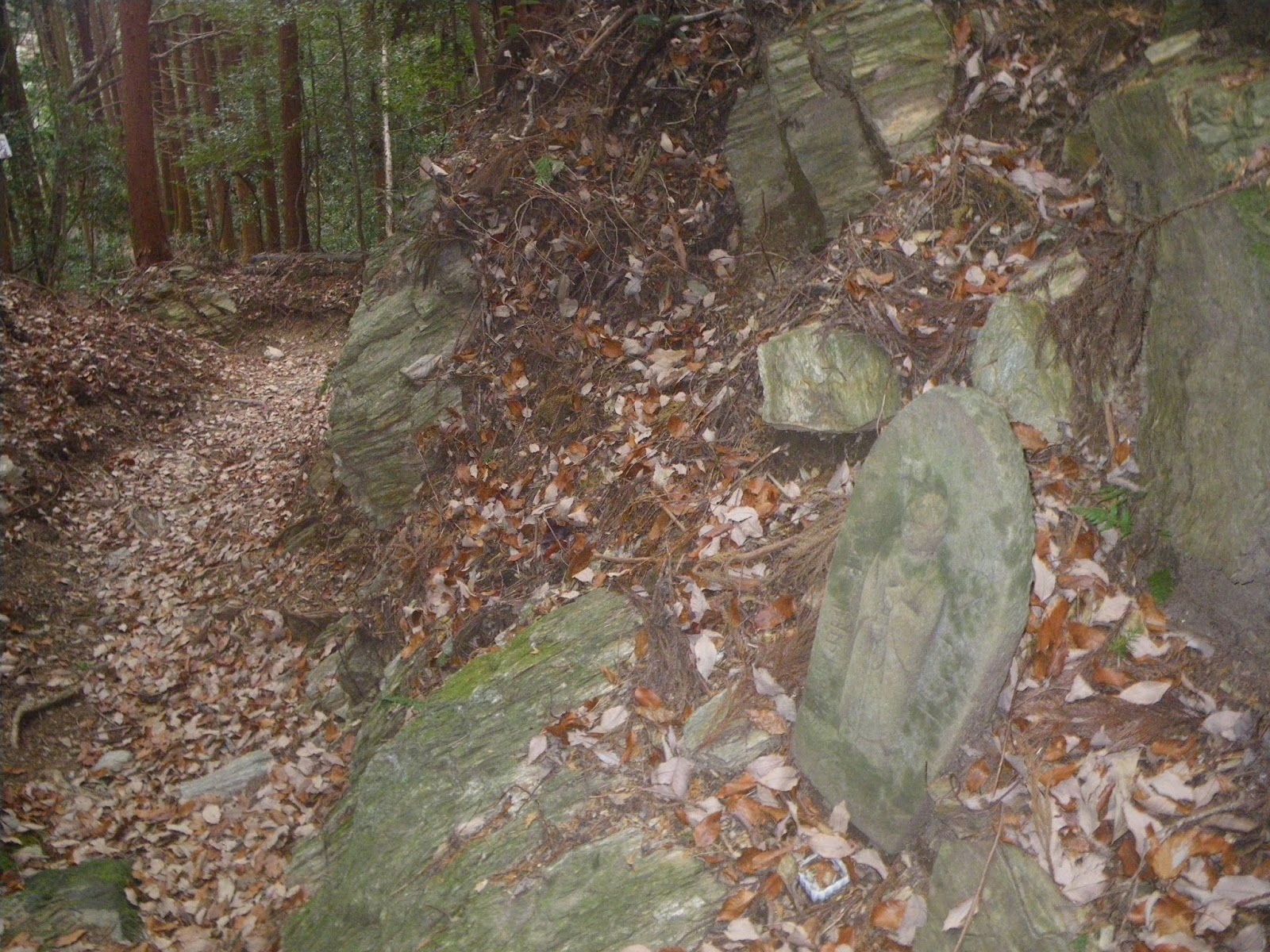 林道を進むと直ぐに舟形地蔵丁石が2つ続く(午前10時23分、10時27分)。共に摩耗が激しく丁数は読めない。