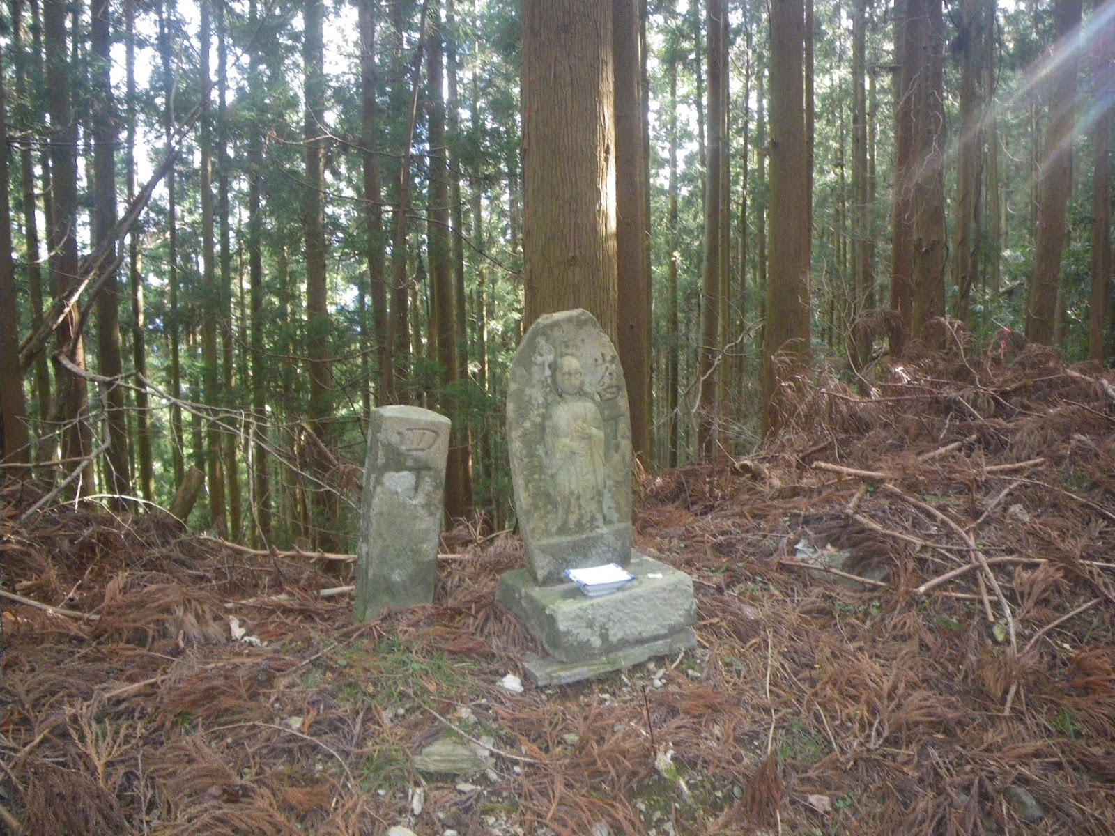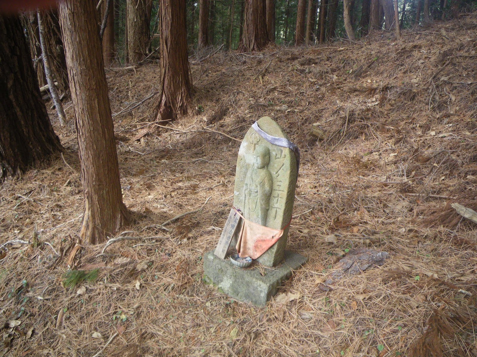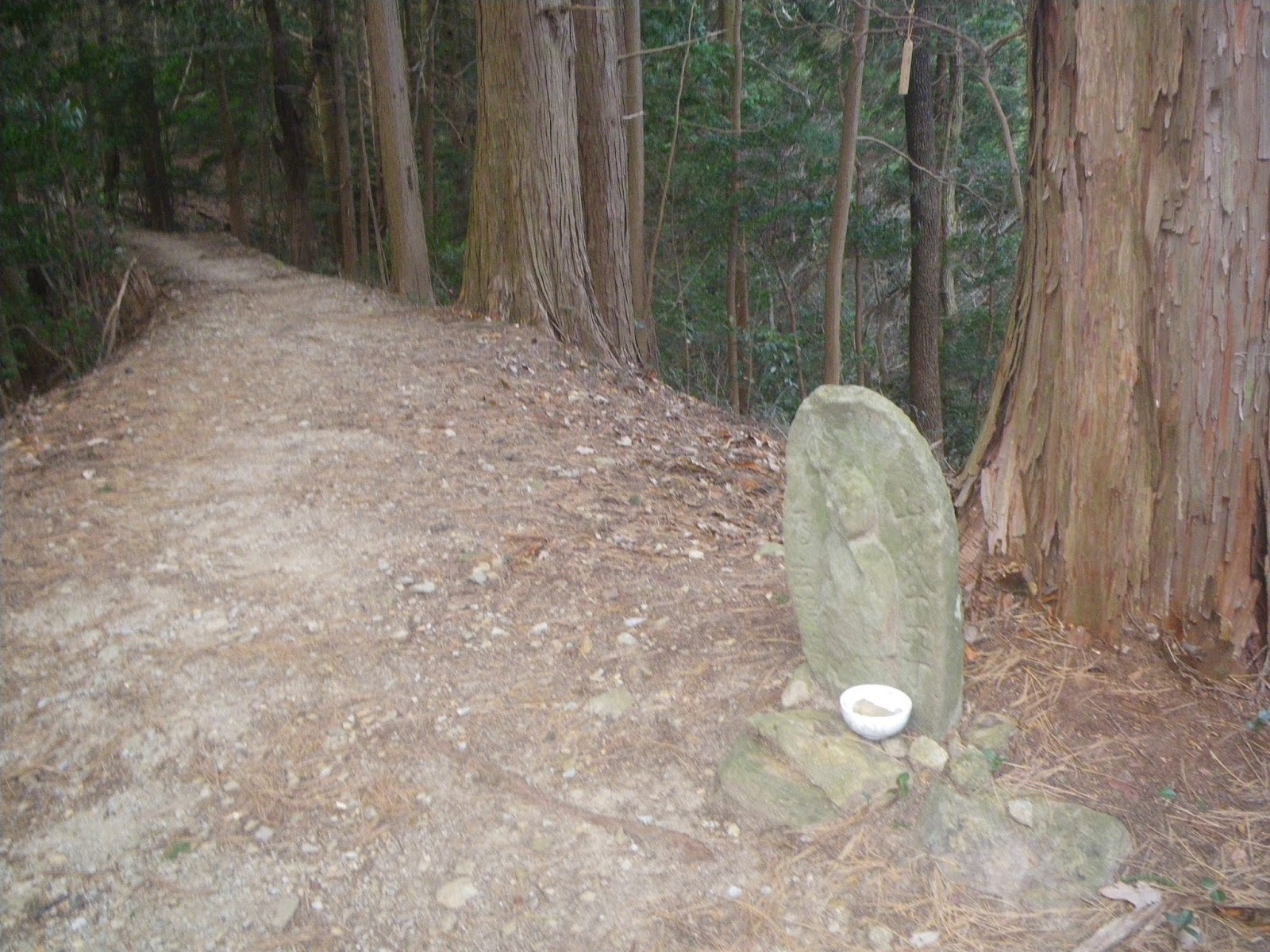 林道を進むと直ぐに舟形地蔵丁石が2つ続く(午前10時23分、10時27分)。共に摩耗が激しく丁数は読めない。