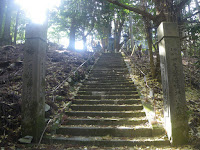 林道をクロスし山道を上る。道の左に角柱丁石と舟形地蔵丁石(午後1時34分)。「五丁」「山与五丁」と刻まれる。更に角柱丁石と舟形地蔵丁石(午後1時36分)。「四丁」と「山与 四丁」とある。その先に焼山寺の参道が見えてくる。