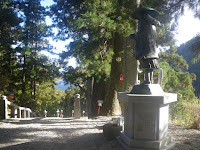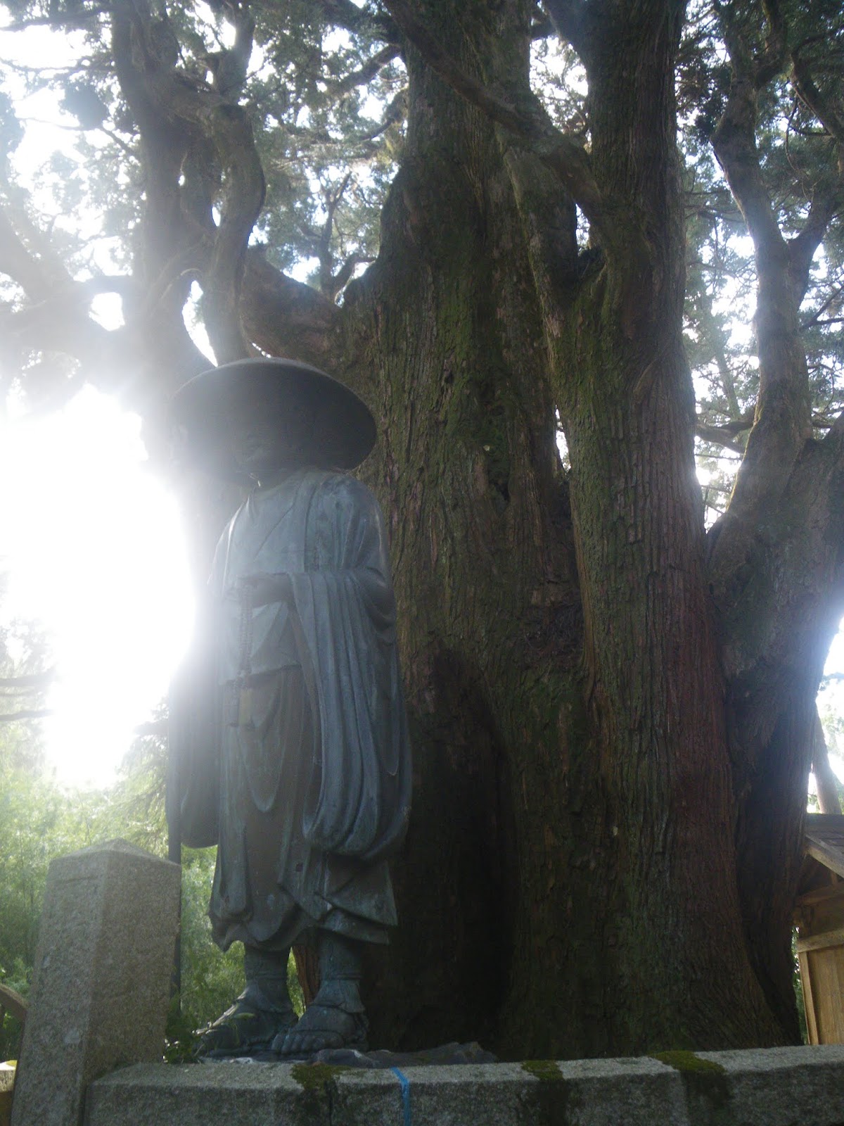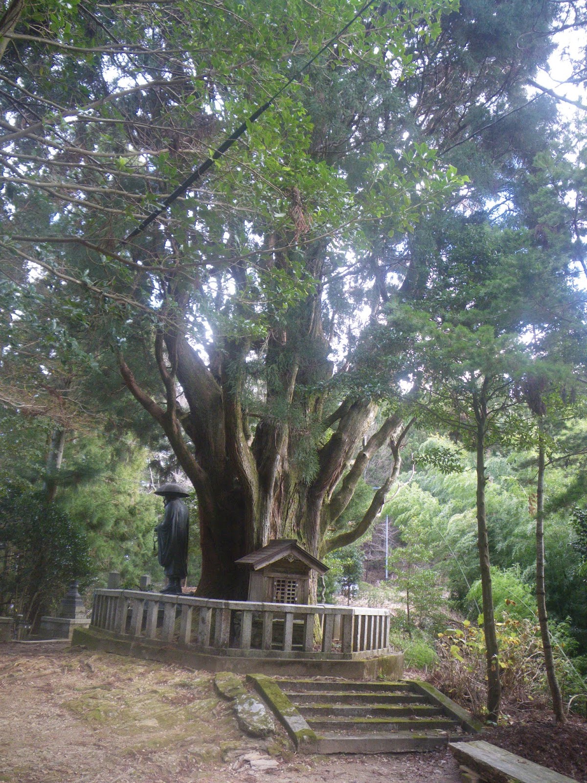 一本杉の幹回りは7m強。樹高30m。樹齢数百年と言われる大杉である。大杉の下に3mほどの修行大師像。大正15年(1926)、京都の篤志家が施主となり石段と共に寄進されたとのこと。