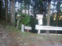 道の右手に中尾多七標石(午後1時27分)を見ると直ぐその先で林道に出る(午後1時27分)。合流点にある「四国のみち」木標には「焼山寺1.0km」とある。