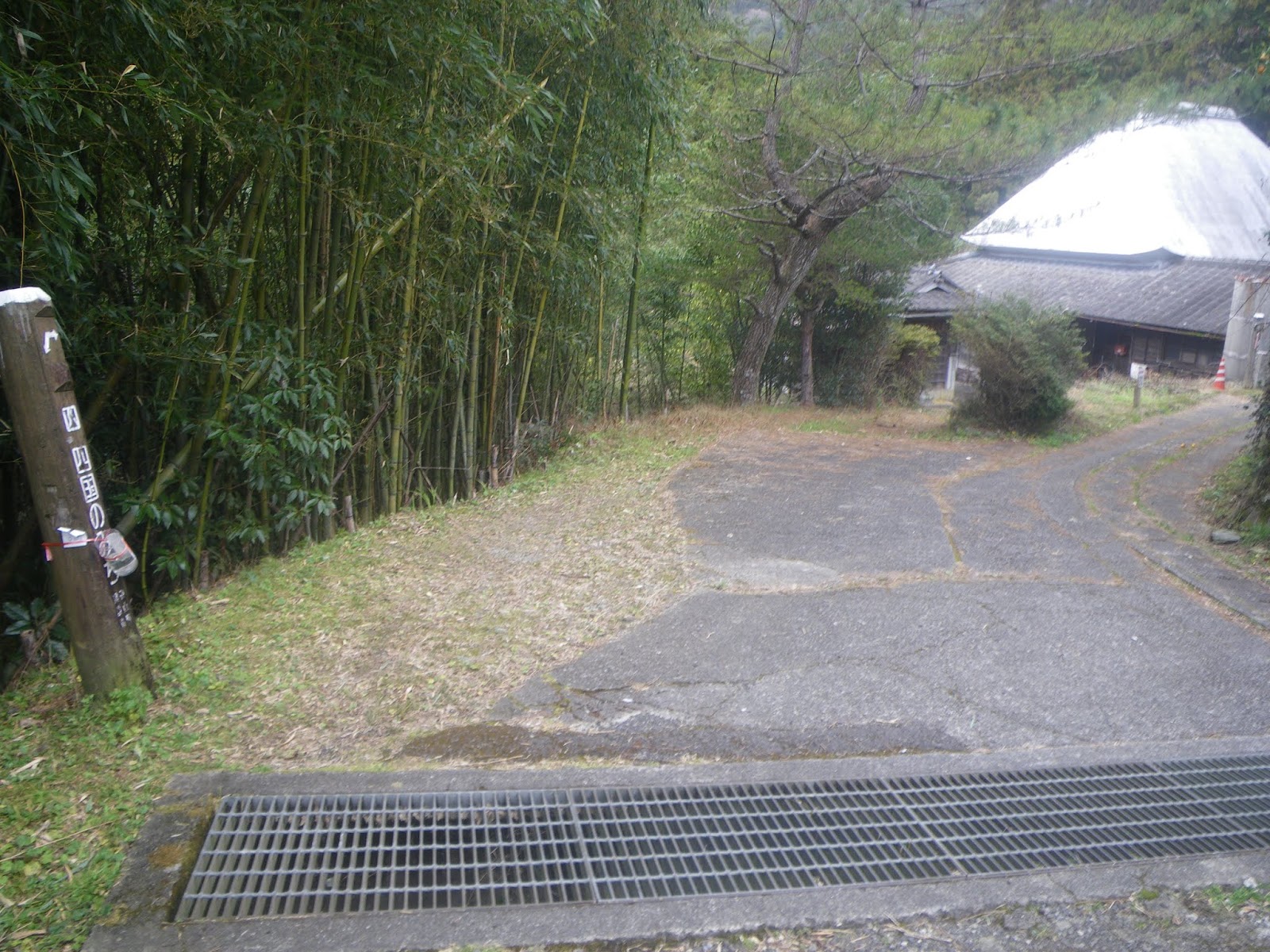遍路道は左の指示に従い舗装された道を進む。ほどなく道を右に折れる案内。集落の細路に入る。