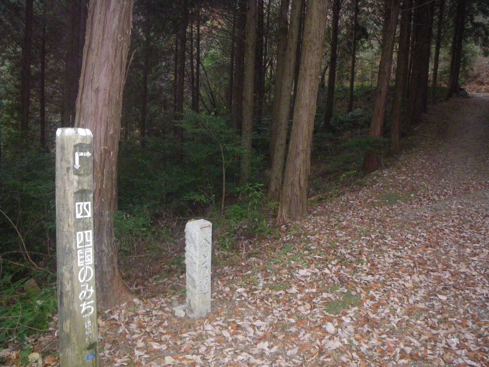県道245に下り、指示に従い右に折れると直ぐ、県道を離れ左に折れる標識。標識傍には「へんろ道」と刻まれる中尾多七標石が立つ(午前10時21分)。山道に入ると直ぐ林道に合流(午前10時22分)。地図には尾根筋を進む林道が記される。
