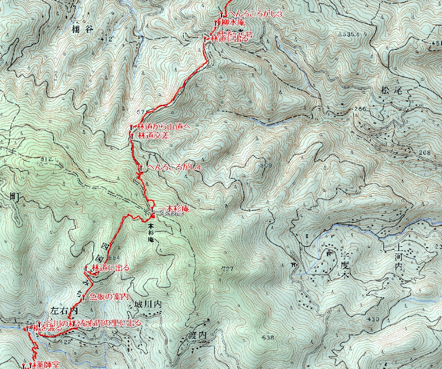 ここまでは先回のメモで歩いたところ。今回のルートについては、続いて「柳水庵から県道245号を横切り4箇所目のへんろころがしを通り柳水庵より2.2kmの距離に焼山寺道最高地点・標高745mの浄蓮庵(一本杉庵)がある。浄蓮庵より標高400mの左右内まで5箇所目のへんろころがしを下り、最後のへんろころがしを登って浄蓮庵より距離4.1kmで標高700mの焼山寺に到着する。