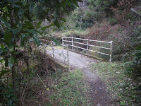 崖に埋もれたような角柱丁石(午後2時49分)。「七丁」と読める。数分歩き沢に架かる橋を渡る(午後2時51分)。