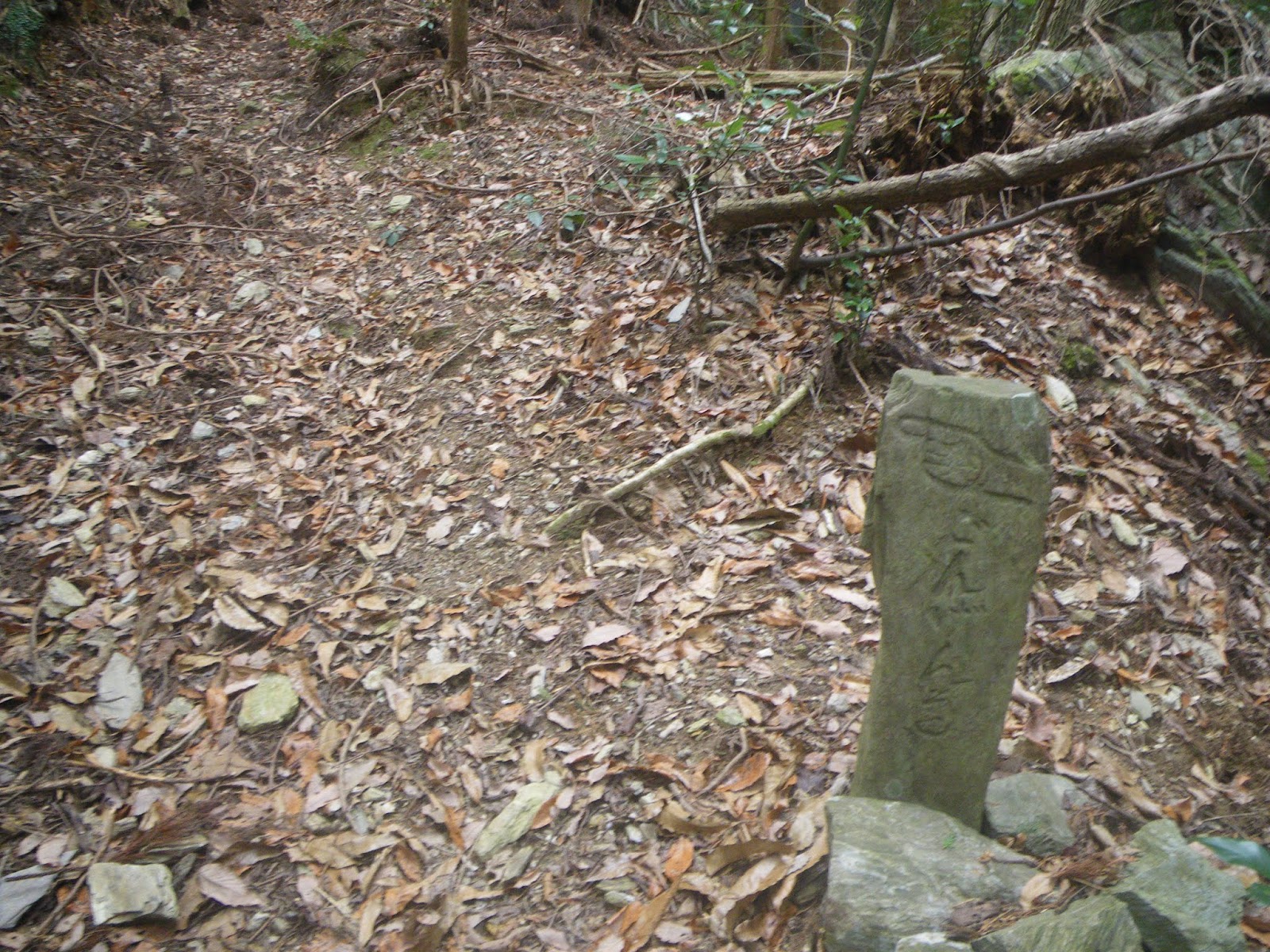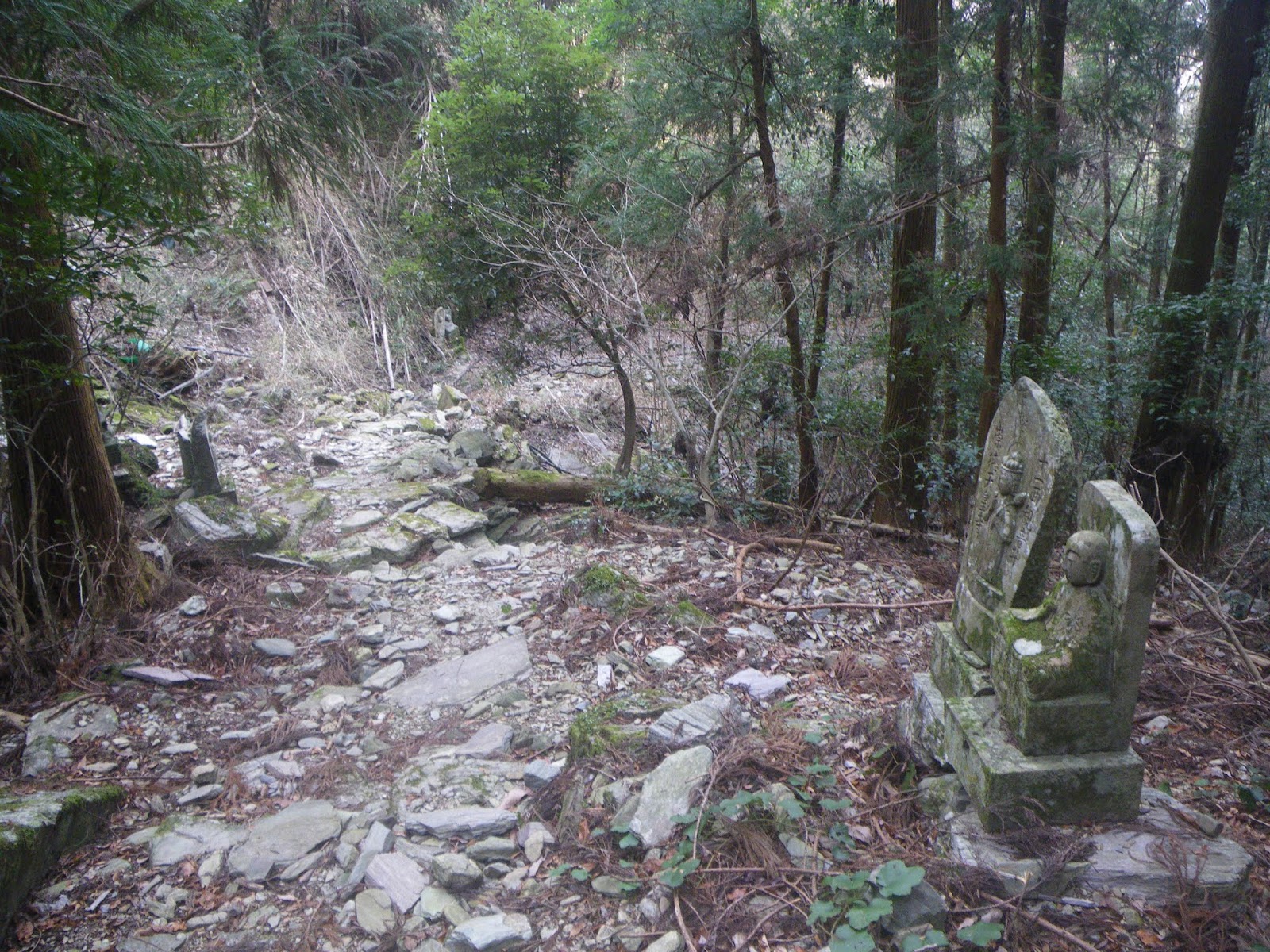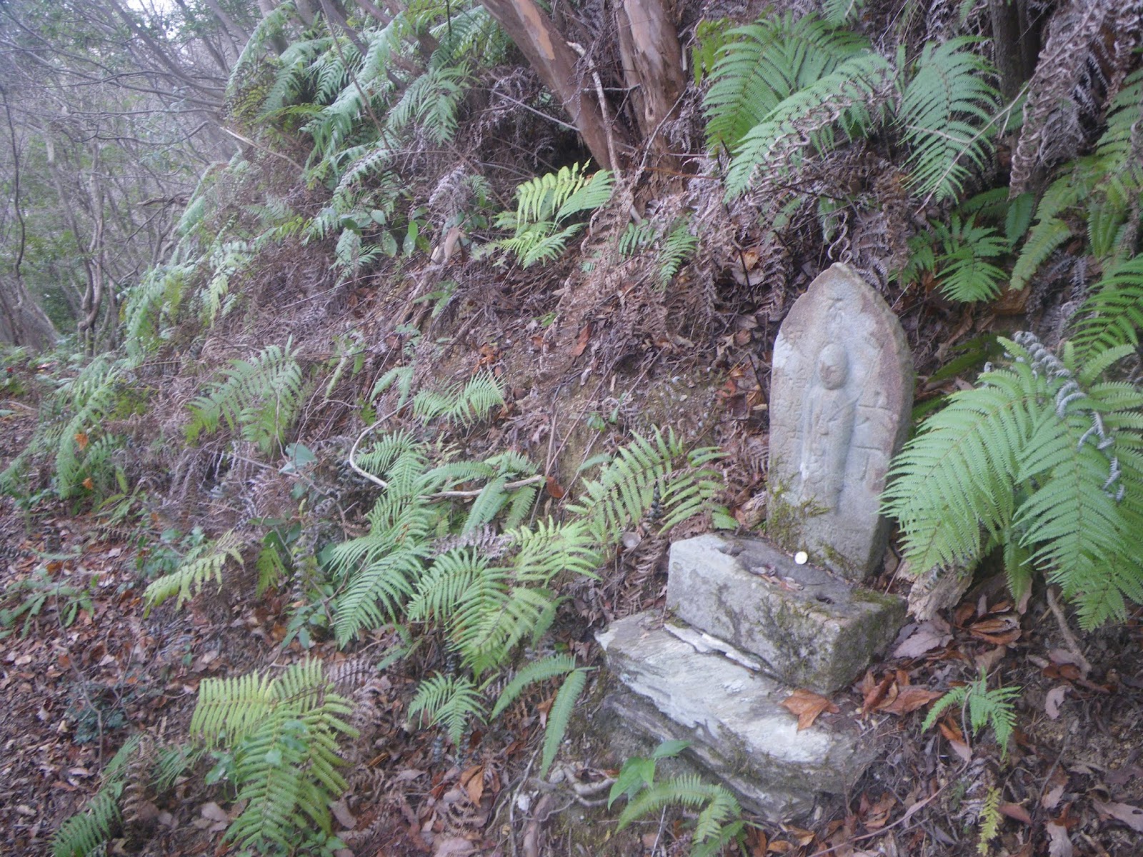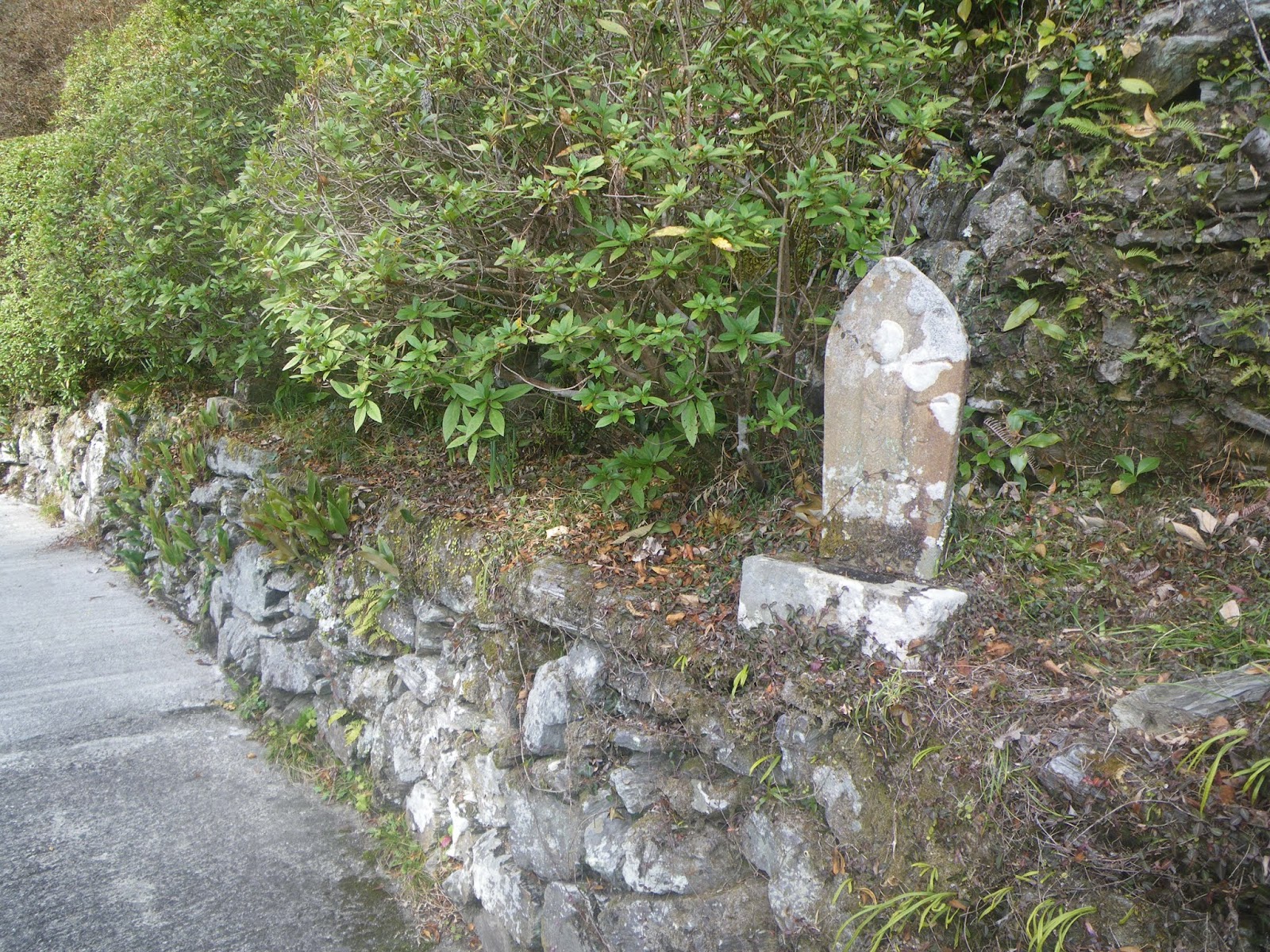 足を踏み入れる前は、人里離れた山道をはっきりとしたルート図もなく歩くのはかなわん、などと思っていはいたのだが、上りの道筋の半分近くは山麓の集落を抜ける道であり気持ちも楽に歩けた。下りの鎖場は多くの記事にあるような「難所」といったものでもなく、危険と感じるところも特に無かった。只、下りは荒れた沢筋の道であり、沢筋に立つ四国霊場本尊石仏を目安に下る箇所もいくつかあったが、ルーティングにそれほど困ることもないかと思う。