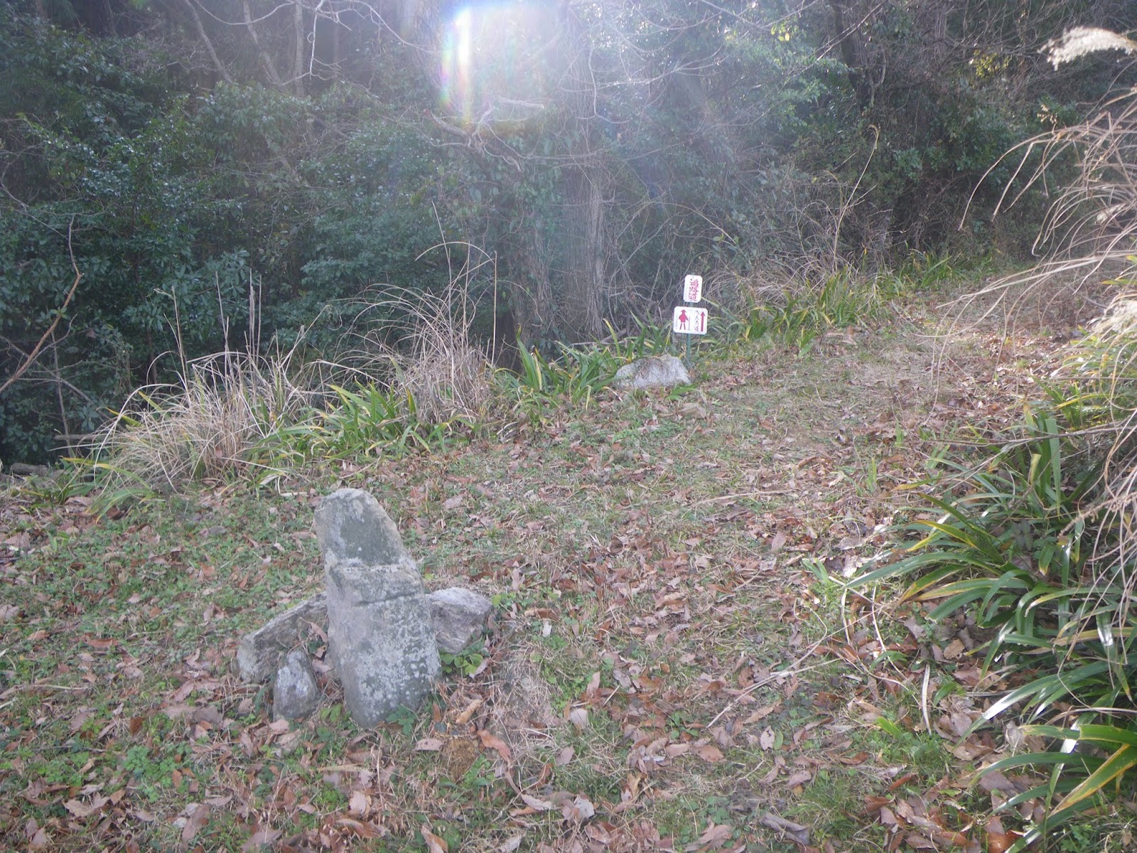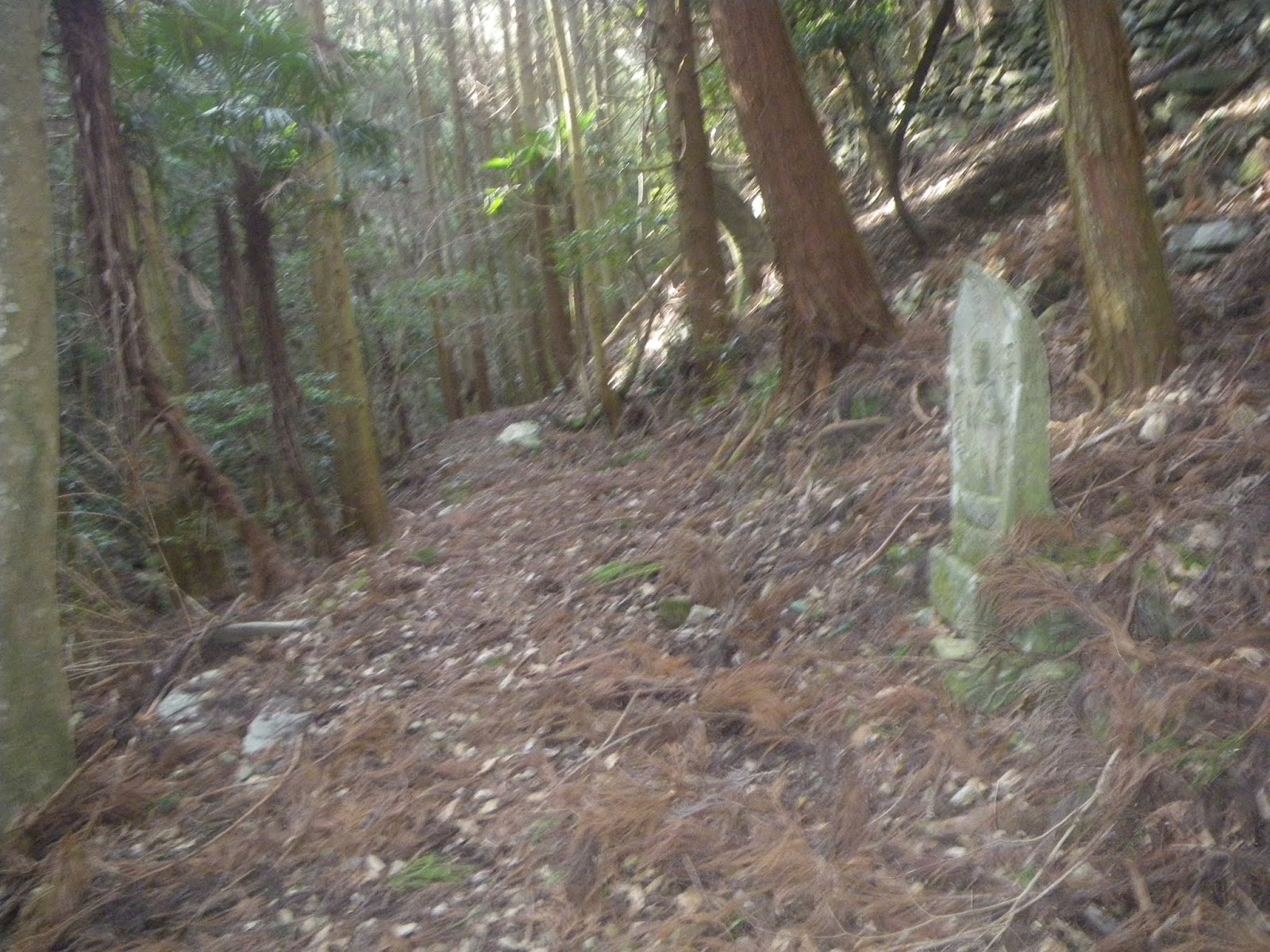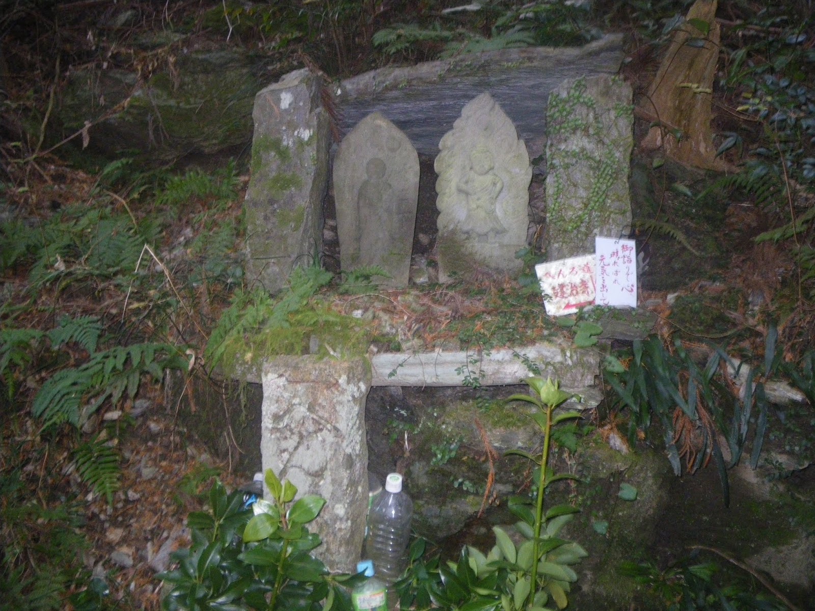足を踏み入れる前は、人里離れた山道をはっきりとしたルート図もなく歩くのはかなわん、などと思っていはいたのだが、上りの道筋の半分近くは山麓の集落を抜ける道であり気持ちも楽に歩けた。下りの鎖場は多くの記事にあるような「難所」といったものでもなく、危険と感じるところも特に無かった。只、下りは荒れた沢筋の道であり、沢筋に立つ四国霊場本尊石仏を目安に下る箇所もいくつかあったが、ルーティングにそれほど困ることもないかと思う。