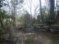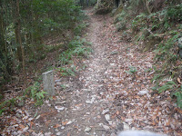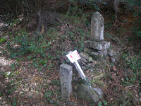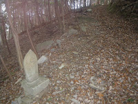 八十八霊場の石仏を目安に岩場の沢筋を下る。ほどなく遍路道は沢筋から離れる。石の祠に祀られる六十七番札所小松尾寺(大興寺)の本尊薬師如来の先に中尾多七標石(午前10時17分)。その直ぐ先で道はふたつに分かれる。
