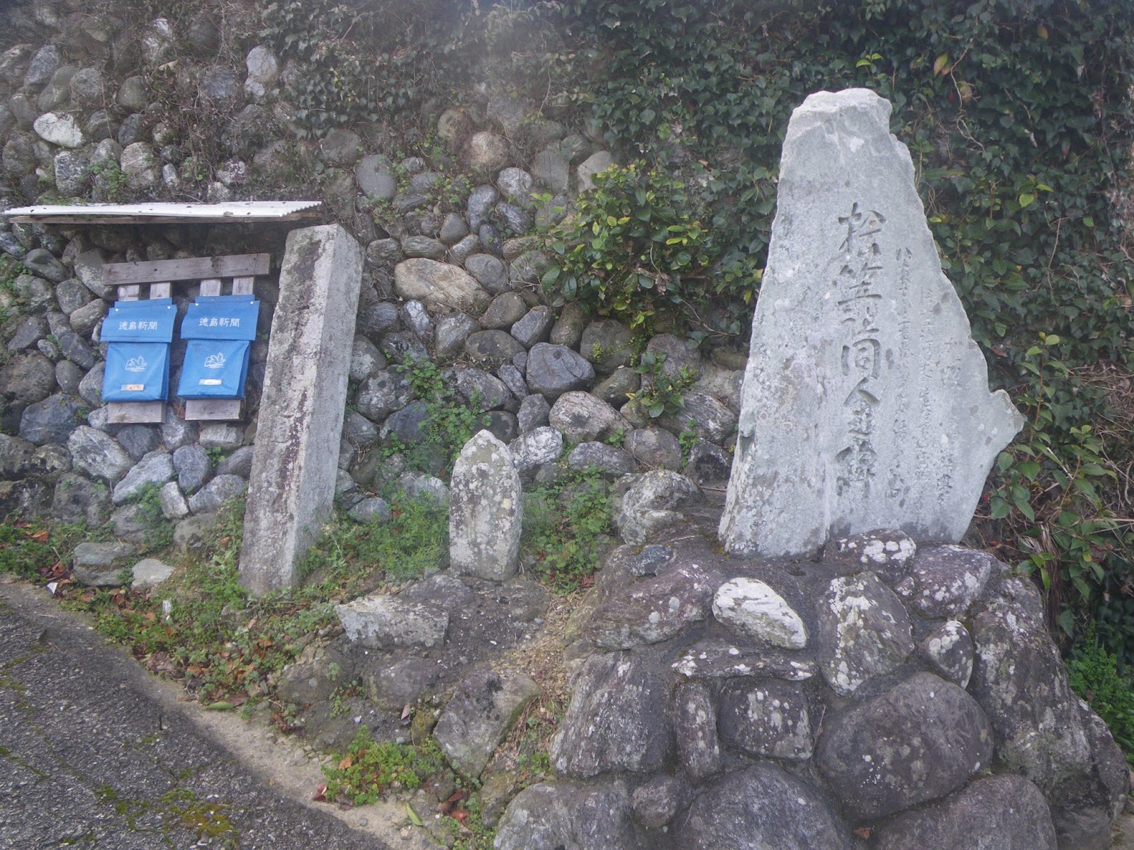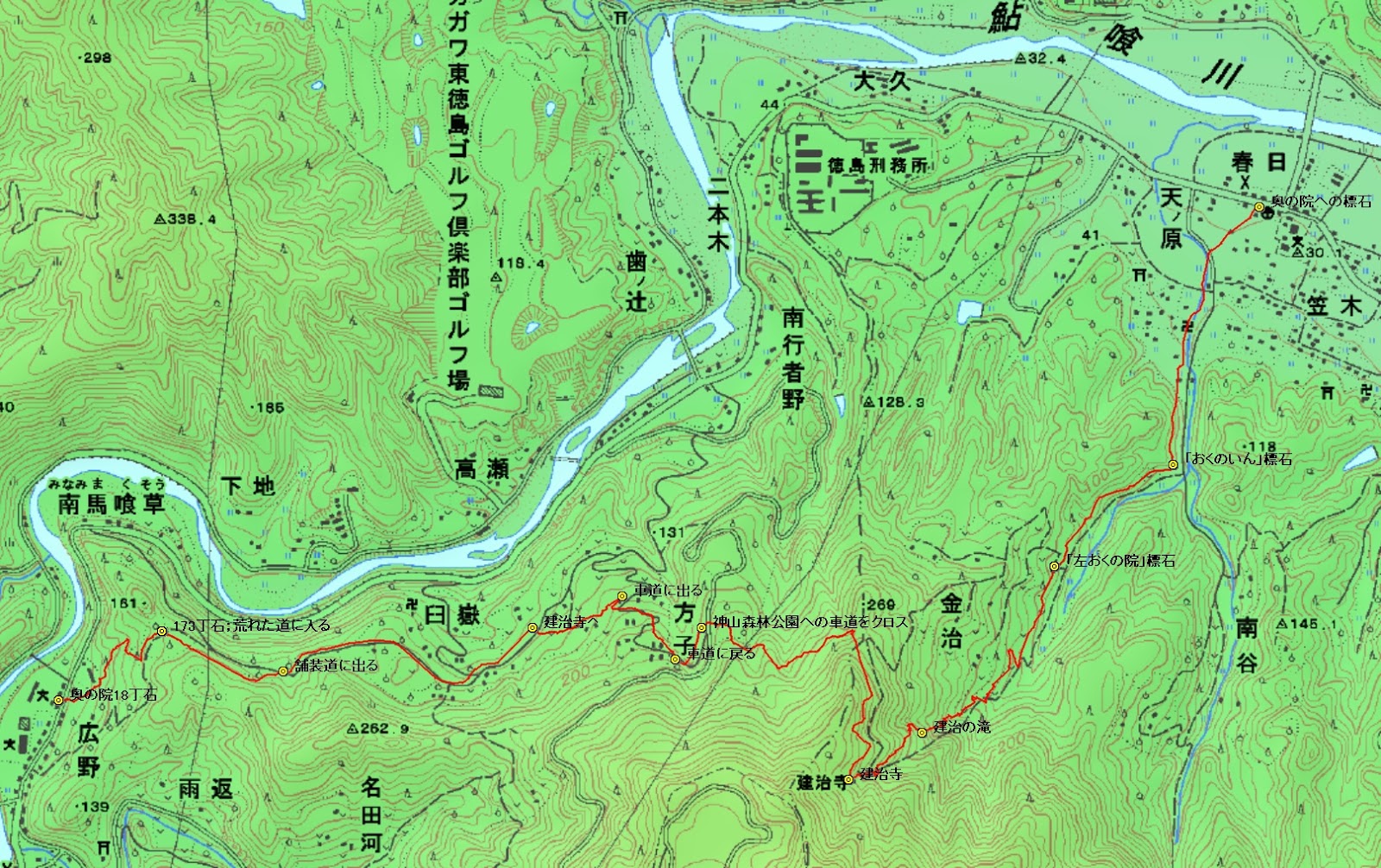 車道を進む。里は開け民家も現れる。四国霊場18番札所恩山寺の本尊薬師如来の立つ少し先、上述「おくの院」標石から10分ほど歩くと南谷川徒金治谷川の合流地点にT字路。その角に2基の標石。「おくおいんみち 文久三」「名勝建治乃瀧 右上」と刻まれる。