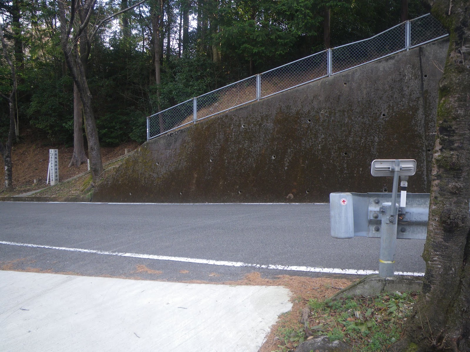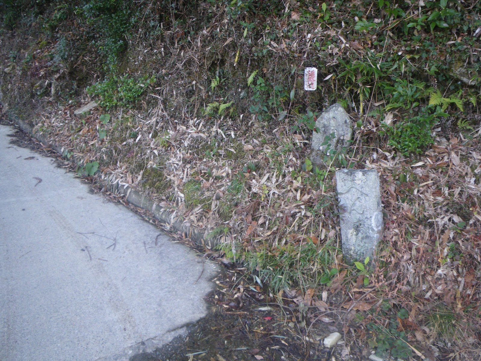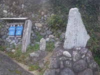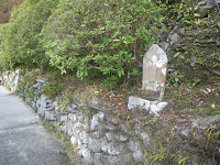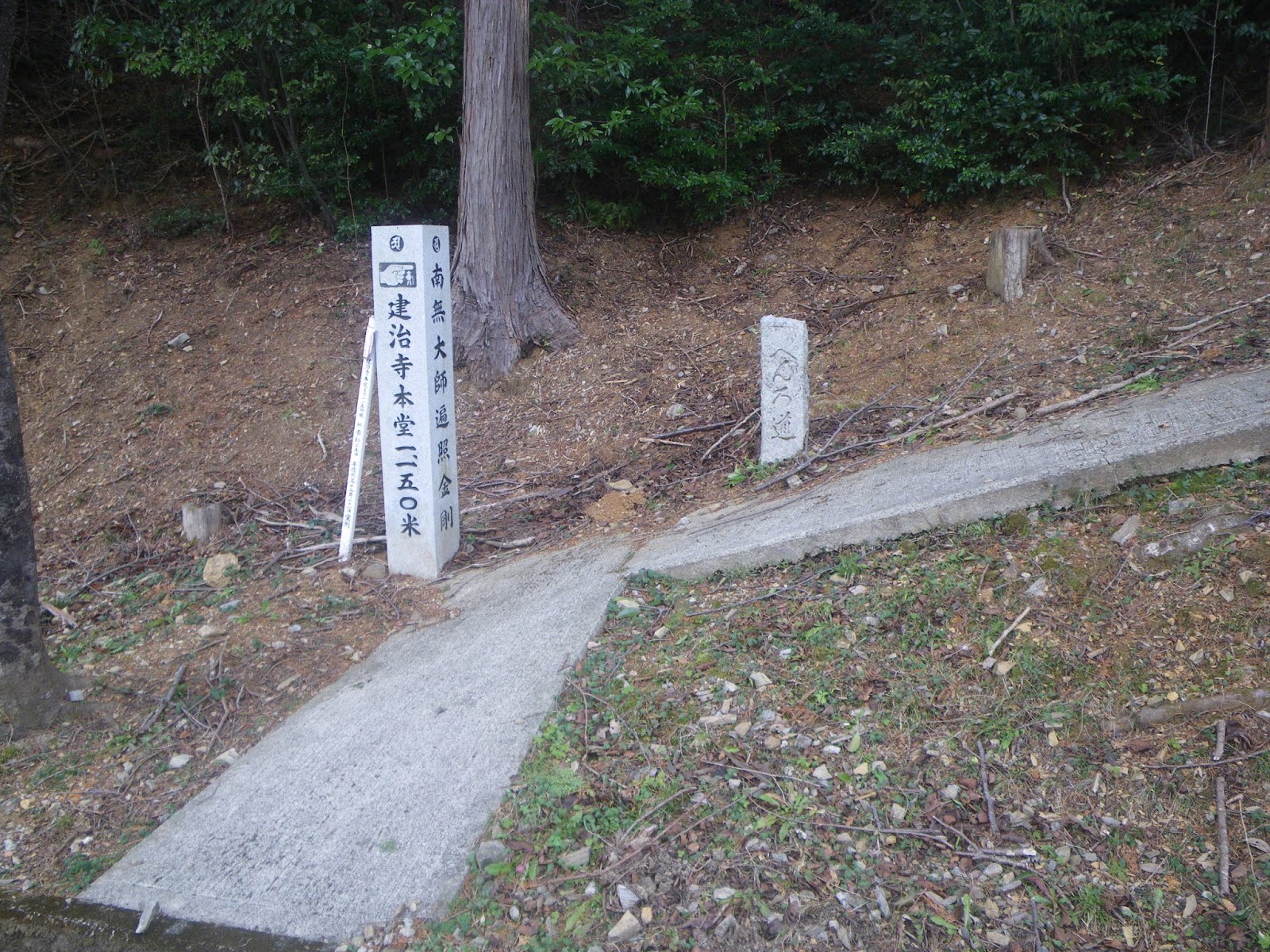 遍路道は車道をクロスし山道へと入る。車道を越えたところには「建治寺本堂 1,150米」の真新しい標石があり、その傍に中尾多七標石が立つ。
