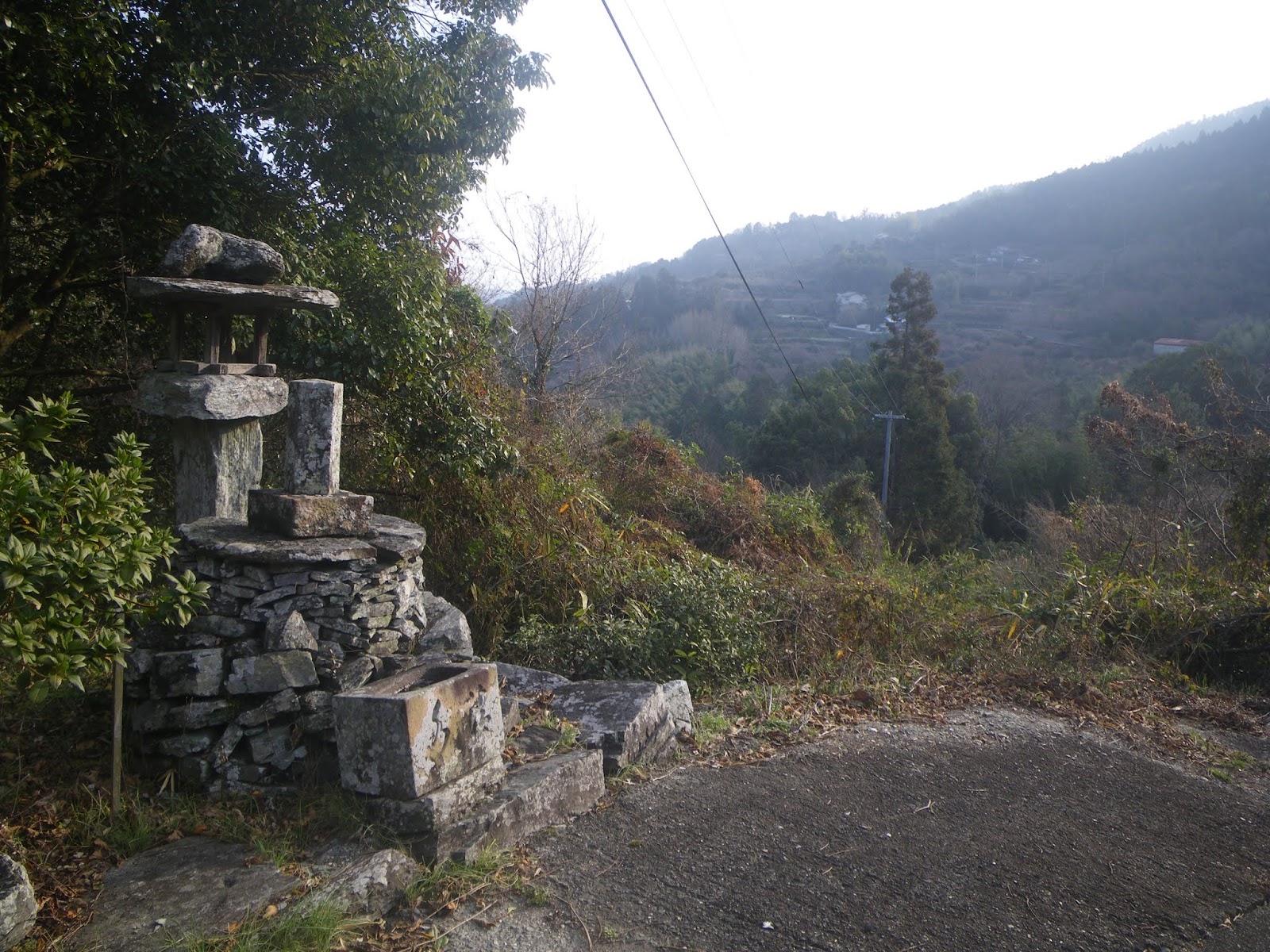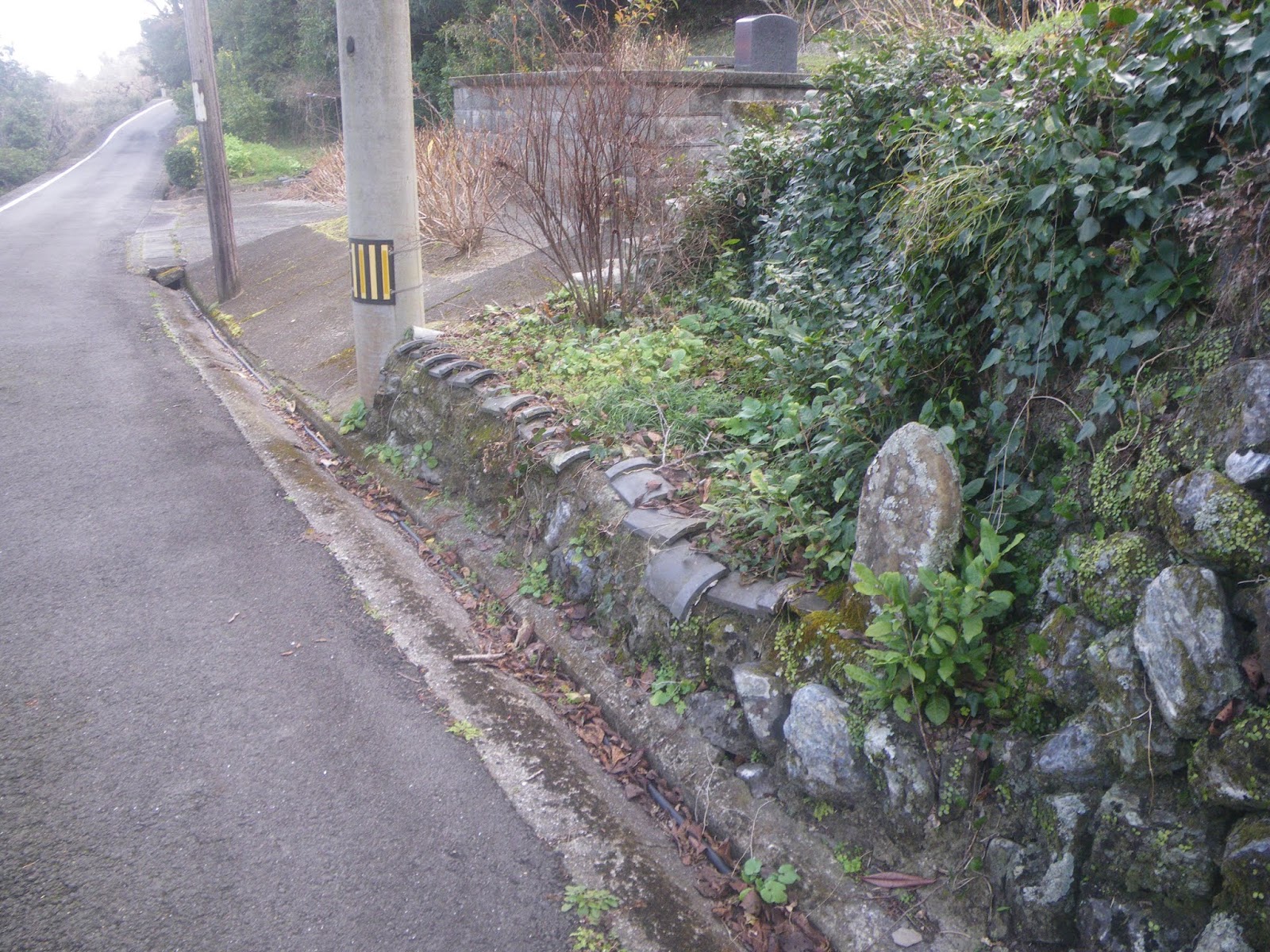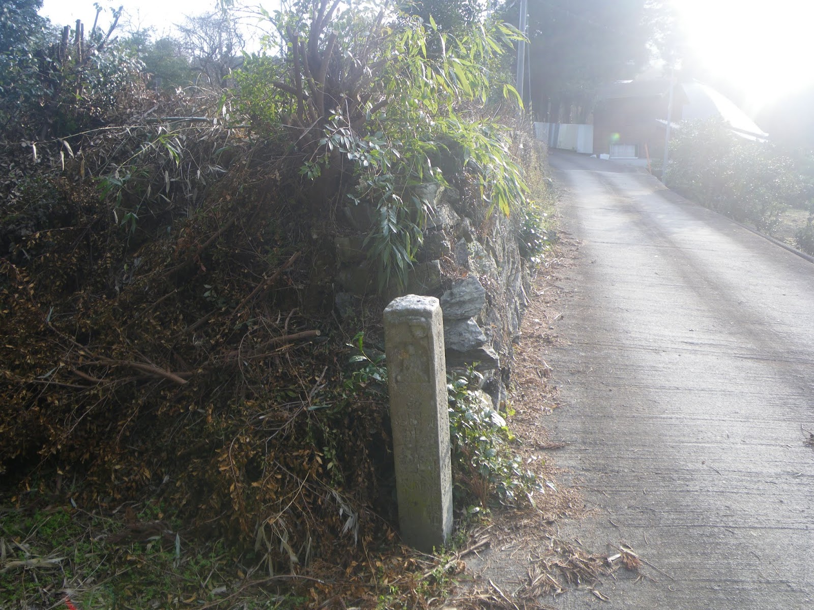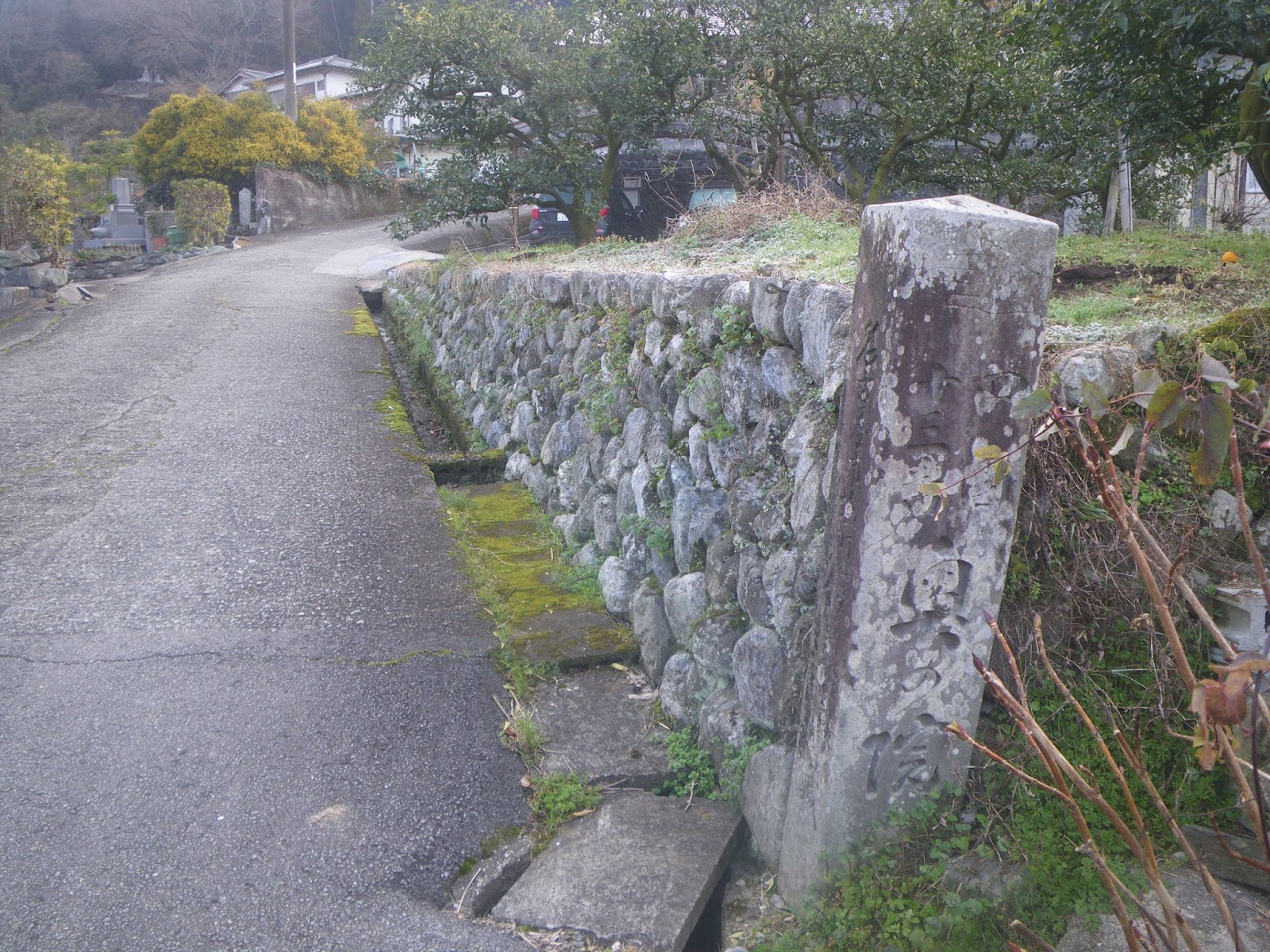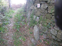 集落の車道を離れ右に折れ狭い道を数分上ると集落を走る広い車道に出る(午前9時)。車道を歩くと右手石垣前に「十*丁」といった文字が読める(午前9時1分)。その先で遍路道は集落を走る車道を離れ右に折れる(午前9時4分)。