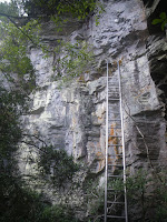 三丁石まで戻り、沢筋に向かうと梯子のかかった岩場に出る(午前10時29分)、梯子の上に岩壁を穿った溝といったものが見える。オーバーハング気味のルートを進むと岩場の行場があるようだ。高所恐怖症のわが身はご勘弁と梯子上りは避ける。