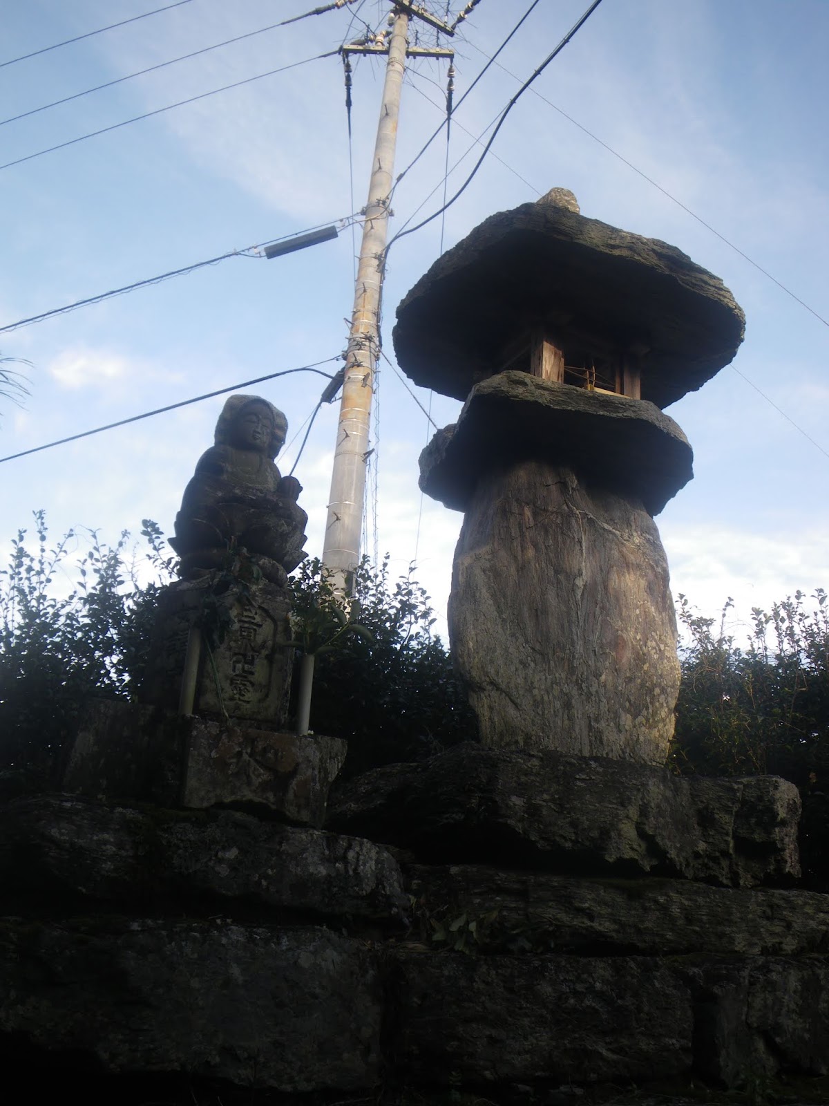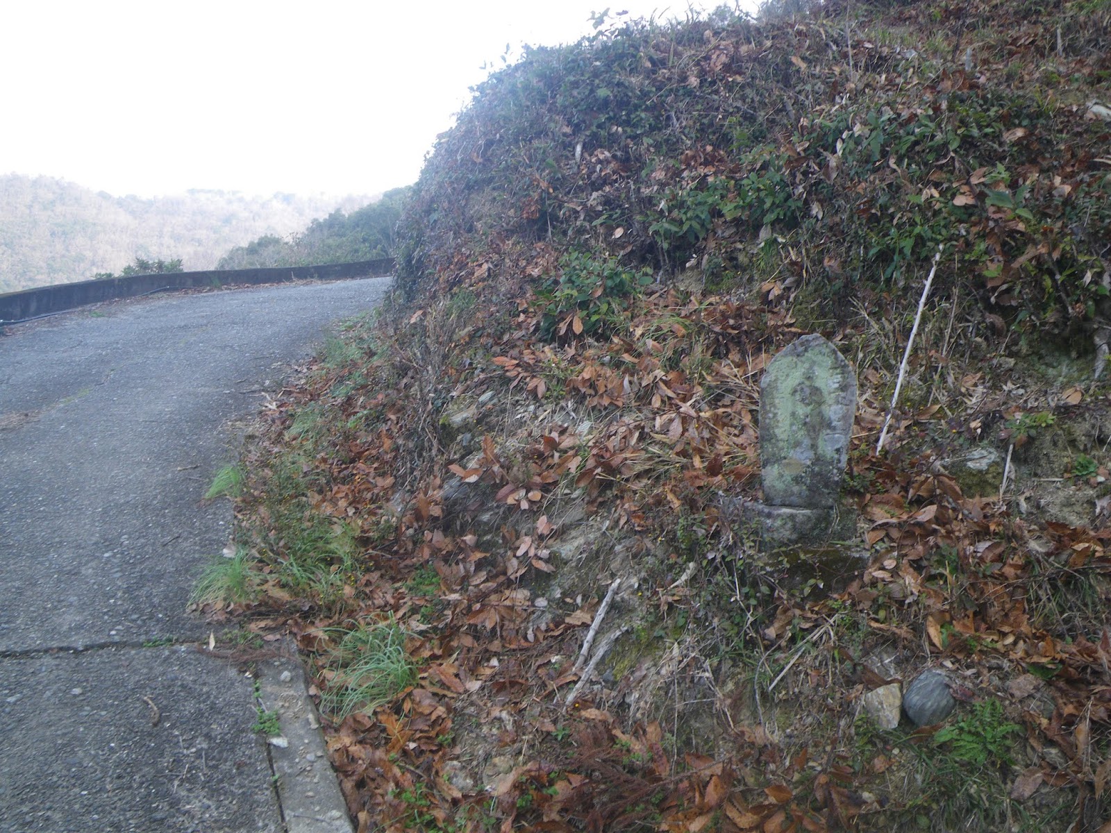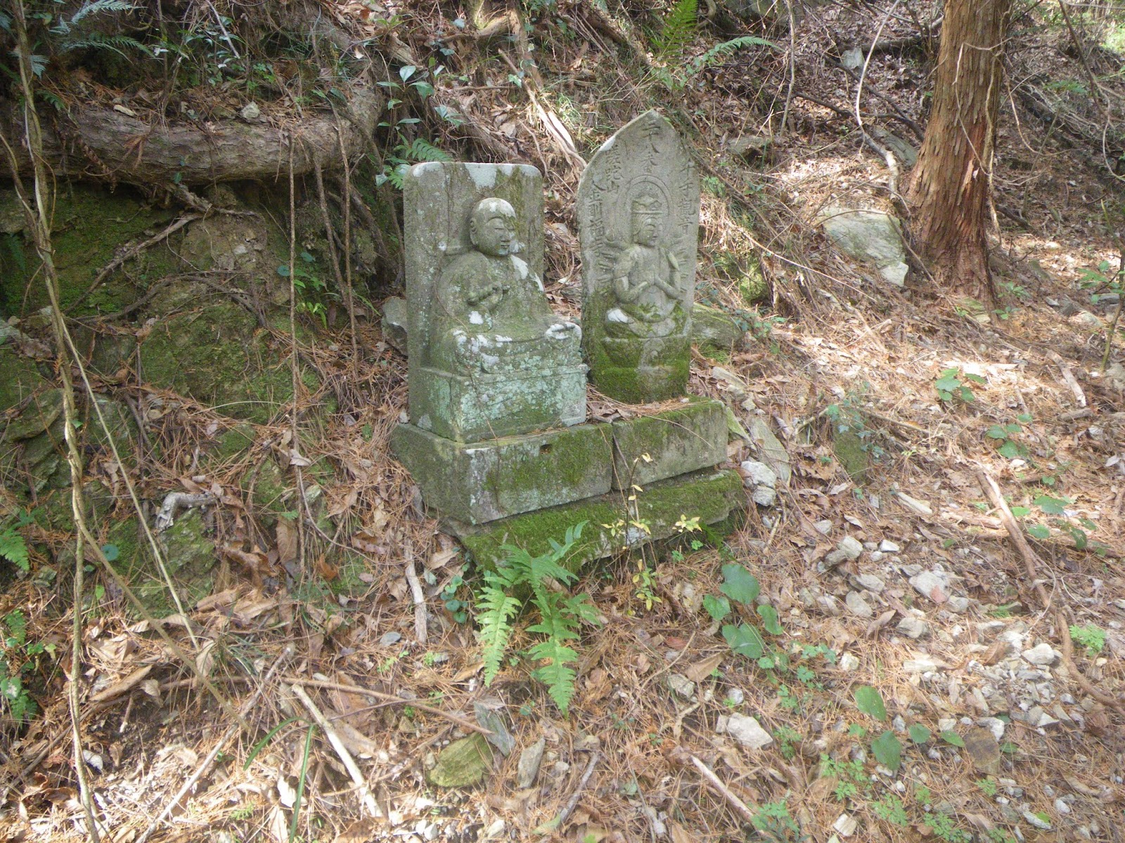 数分あるくと道は3つにわかれる。その真ん中の道、すぐ先にペアの石仏が並ぶ(午前11時38分)。札番号は読めなかったが、流れからすれば四国霊場本尊座像ペアであろうとその道筋を進む。建治寺から続いた四国88霊場の本尊石仏の一番がどこから始まるのか確認したかったのだが、結局わからずに終わってしまった。