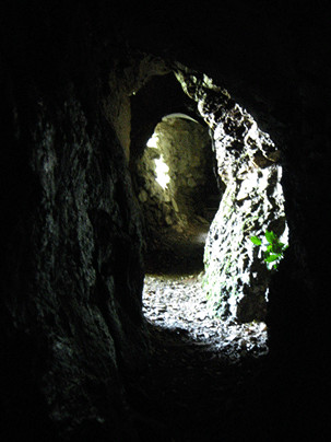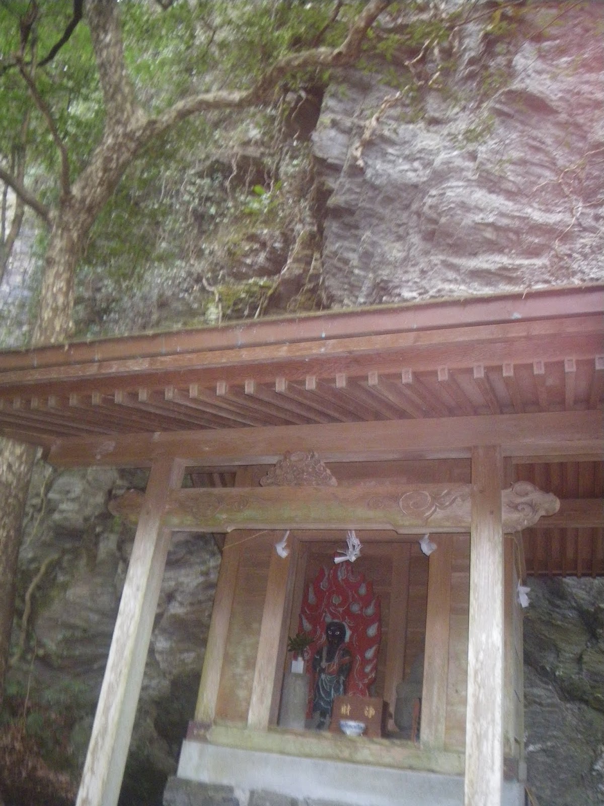 大師堂の右手に「建治龍門窟」と書かれた石柱。先に進むと狭い洞窟が続き、最奥部には不動明王が祀られる。