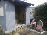 道の右手に「百八十二丁」の舟形地蔵丁石(午前8時53分)。その先に風雪に耐えた趣の大師堂。常夜灯も立つ。