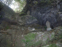 62番宝寿寺の十一面観音、60番横峰寺の大日如来などに一礼しながら道を進むと鎖場に。それほど危なそうではない。鎖をしっかり握り、足場を確保し鎖場を下りる。岩場には石仏が立つ。はっきりとは見なかったのだが、四国霊場本尊石像ではないようだ。