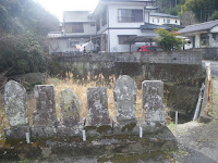 10分ほど歩くと遍路道は橋を渡り川の右岸に。橋傍に6基の石仏。四国霊場の本尊石仏だろう。大師像とのペアであるので3霊場だろうが、左端の石仏に「六番」と読める以外、摩耗が激しく札番号はわからなかった。