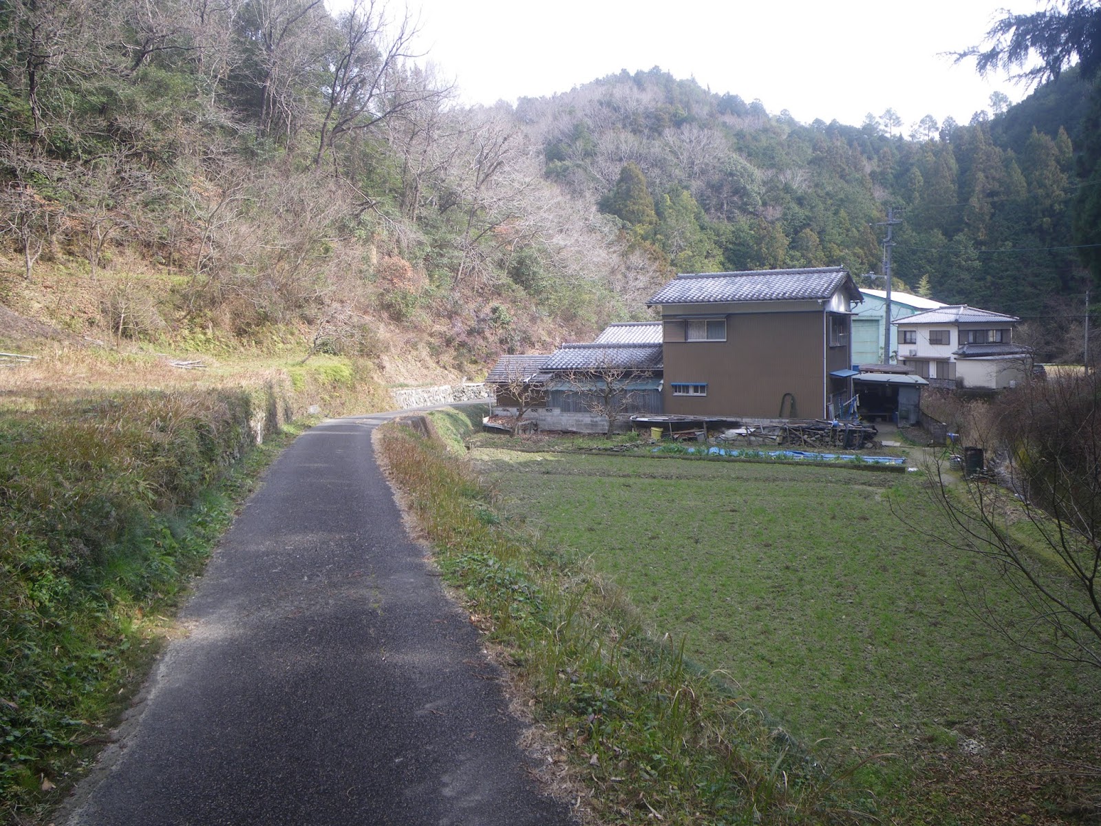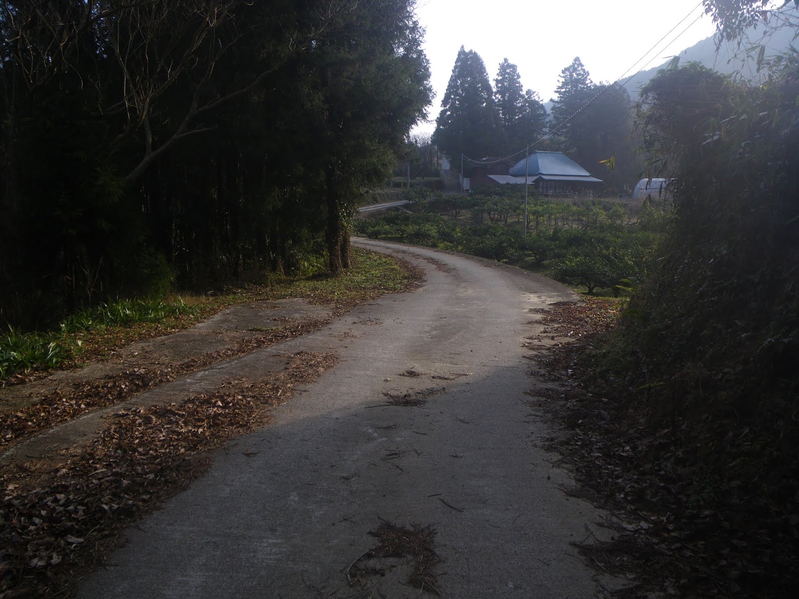 土径を5分ほど歩くと舗装道に出る(午前9時18分)。先ほど分かれた集落から上る車道である。