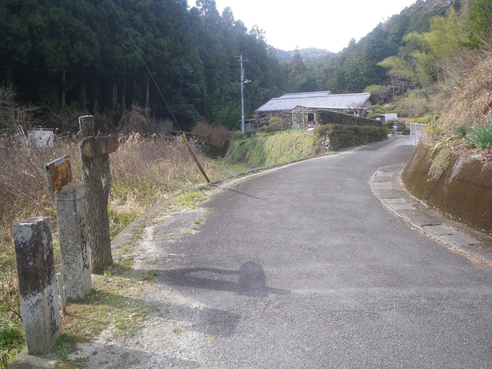 そこに遍路道右折の遍路タグがある。水路溝に沿って舗装された狭い坂が上っている。建治寺へはここを右に折れる。