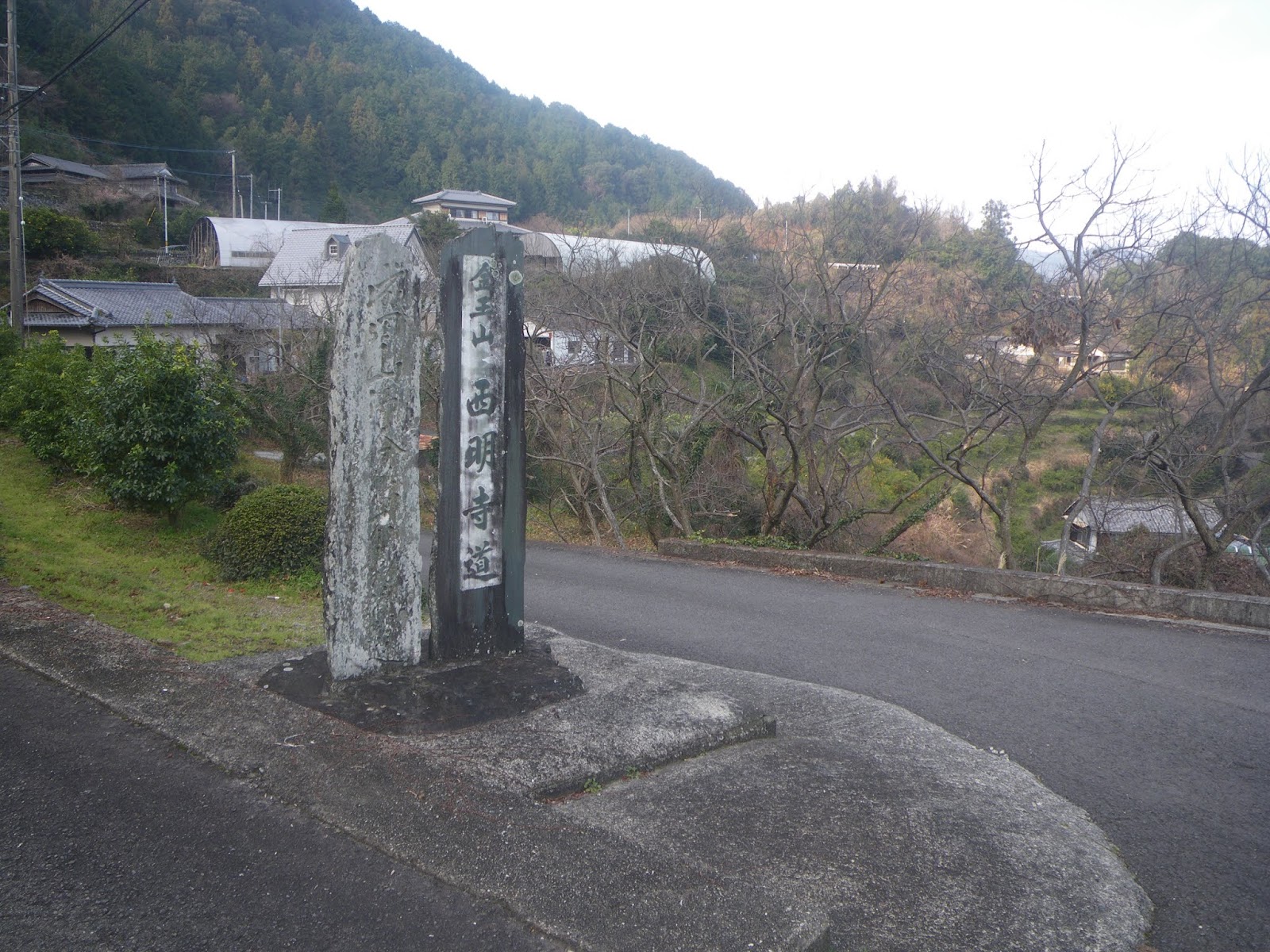山麓を走る舗装道を鮎喰川の谷筋を見やりながらのんびり歩く。5分ほど進むと道の分岐点。その角に2基の標石が立つ(午前8時49分)。比較的新しい1基には、「金玉山 西明寺道」、古い標石には「成田山御分*不動尊道 十三番うちぬけ 是より三丁」とあるようだ。
