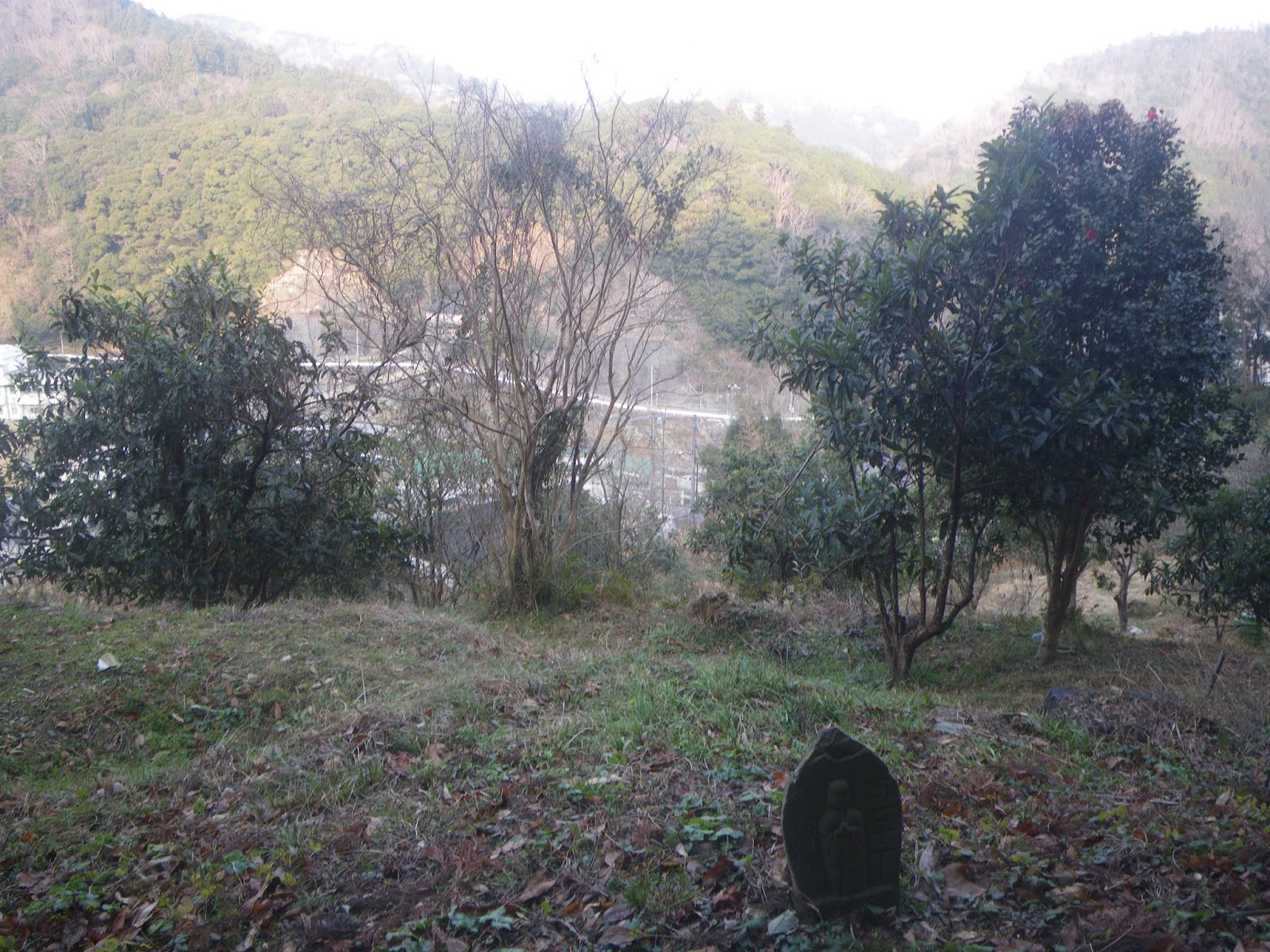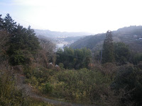 車道を進む。道は尾根筋を少し東に廻り込み、300m等高線辺りを進むことになる。5分強歩くと寺の駐車場(午前9時52分)。駐車場から尾根の東側の遠景、お寺さまにお参りした後に下る遍路道ではあろう谷筋、その先の鮎喰川の遠景を楽しむ。