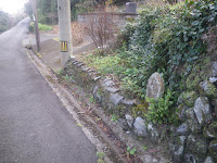 大師堂の直ぐ先、道の右手に3基の石造物(午前8時57分)。左端の自然石には、手印と共に、「右へんろ道」の文字が読める。その他の石造物は風化が激しく文字は読めない。