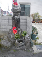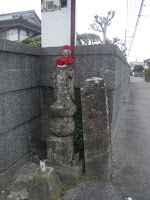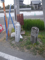 更に北に進むとT字路にあたる。その角に地蔵尊や石造物。その両端にそれぞれ2基標石が並ぶ。標石はどれも風化し文字は読めないが、右側には如何にも茂兵衛道標といった風情の標石と、左にはこれまた如何にも照蓮の四国千躰大師標石。