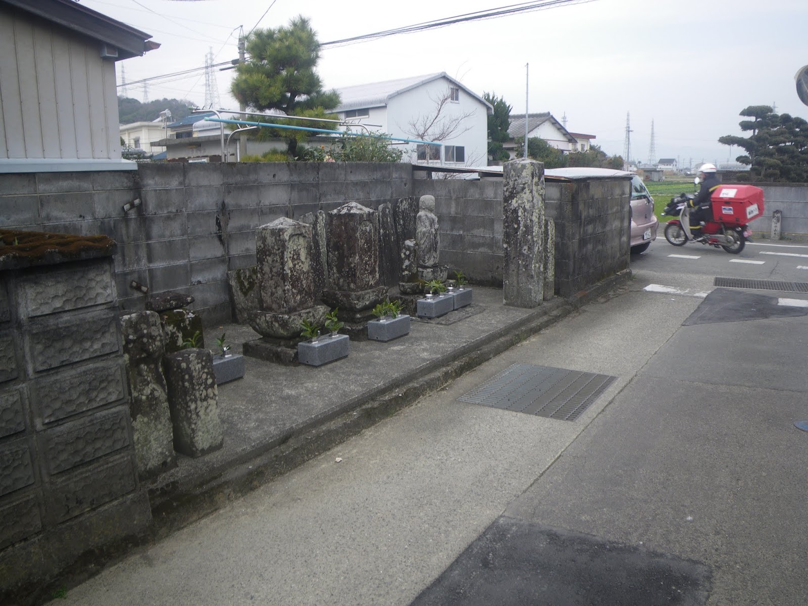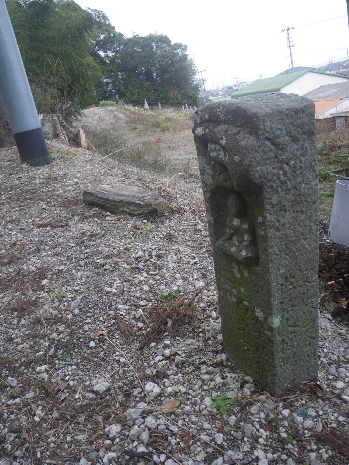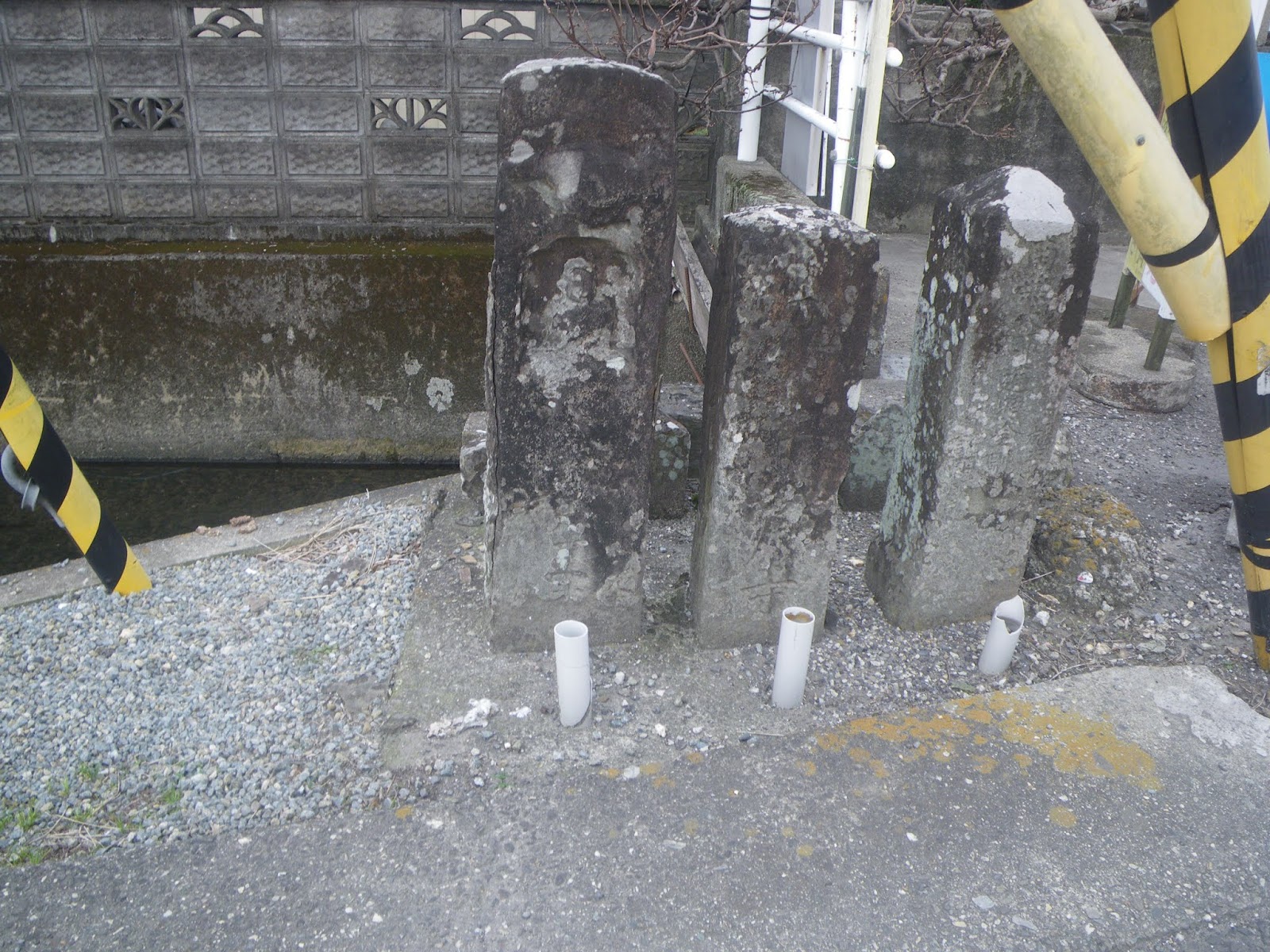 その左折角に3基の石造物。そのうち2基は標石。左端は摩耗し文字は読めないが。形からして照蓮の四国千躰大師標石。番号タイプのもので「第百六十一番 文化六」といった文字が刻まれるようだ。中央の石造物も標石。「左* 右*寺」がうっすら読める。