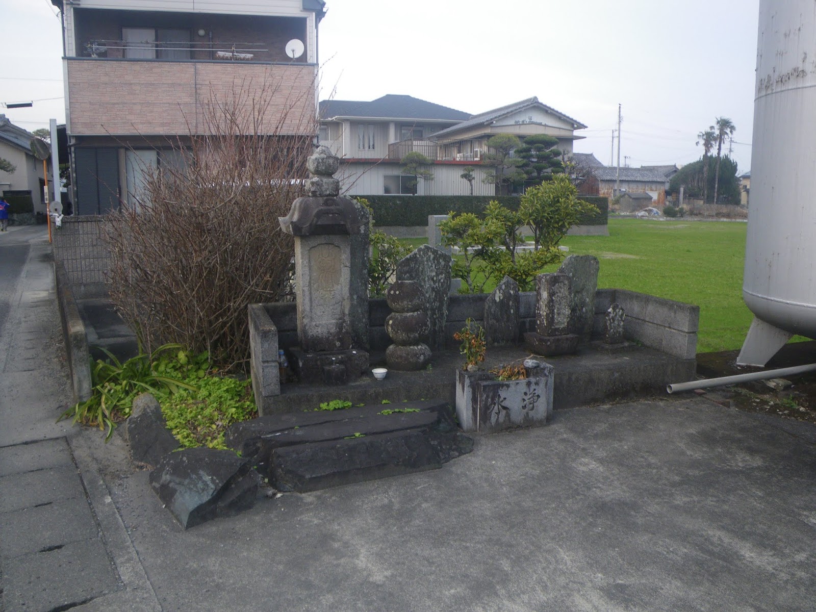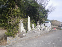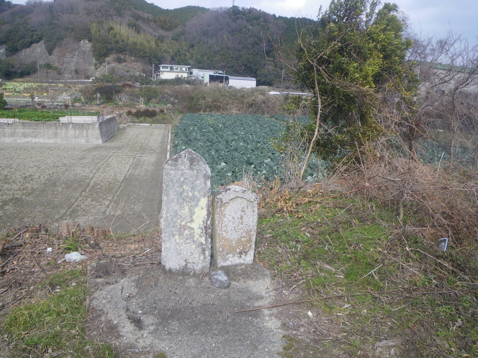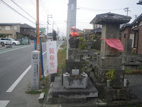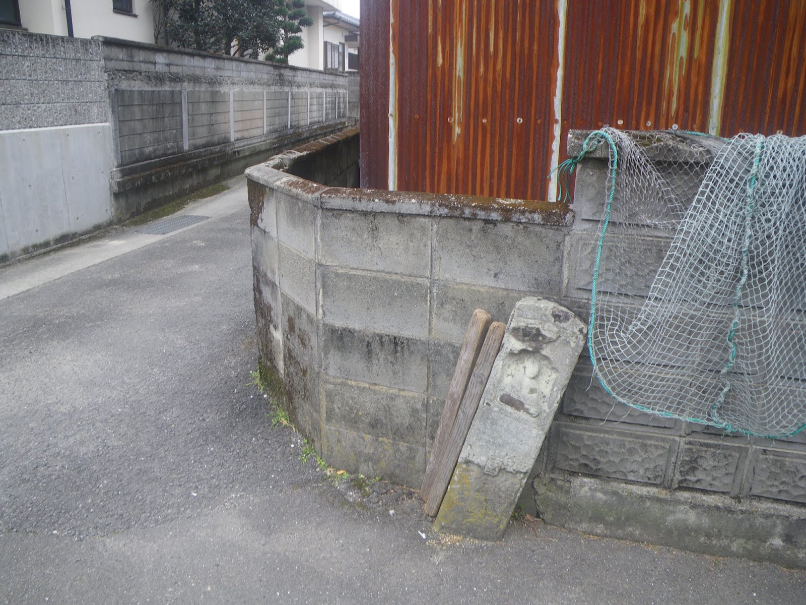 その左折角に3基の石造物。そのうち2基は標石。左端は摩耗し文字は読めないが。形からして照蓮の四国千躰大師標石。番号タイプのもので「第百六十一番 文化六」といった文字が刻まれるようだ。中央の石造物も標石。「左* 右*寺」がうっすら読める。