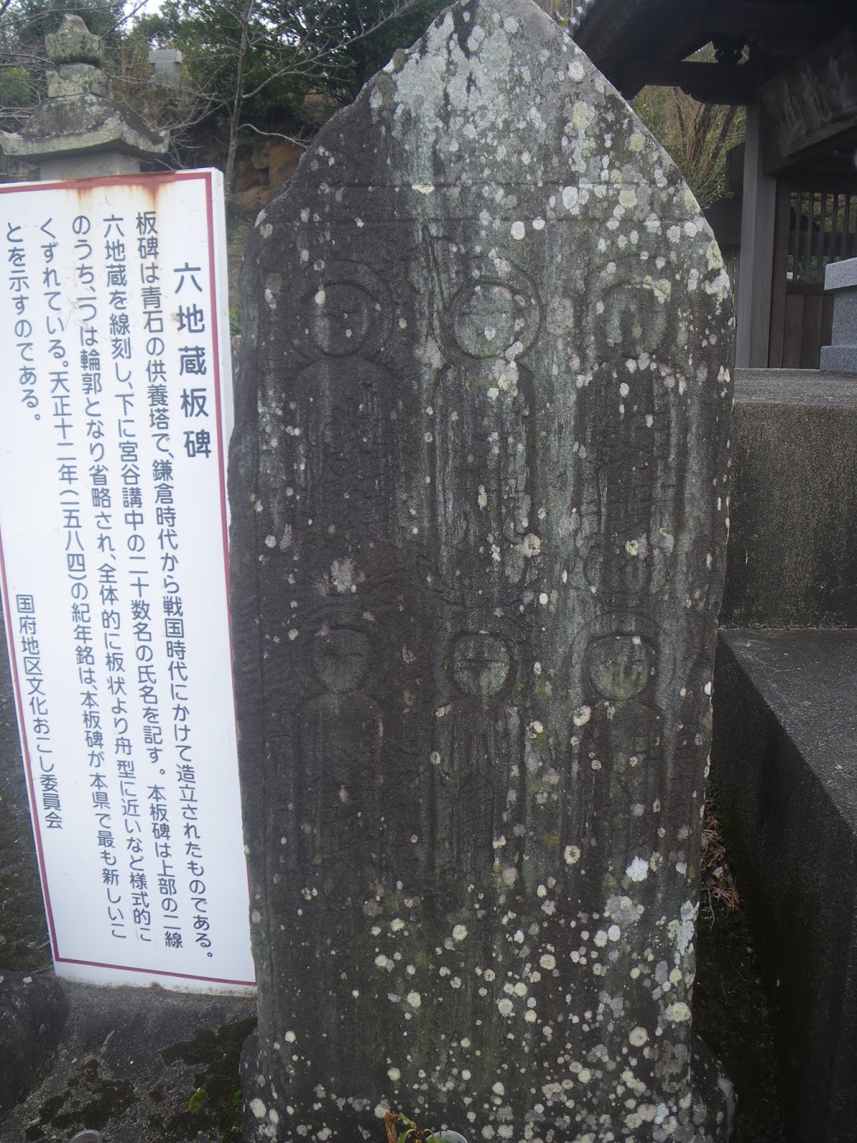 興禅寺前にお堂。その傍に六地蔵板碑。一枚の青石に六体の地蔵が彫られる。案内には「板碑は青石の供養塔で、鎌倉時代から戦国時代にかけて建立されたものである。六地蔵を線彫し、下に宮谷講中の二十数名の氏名を記す。