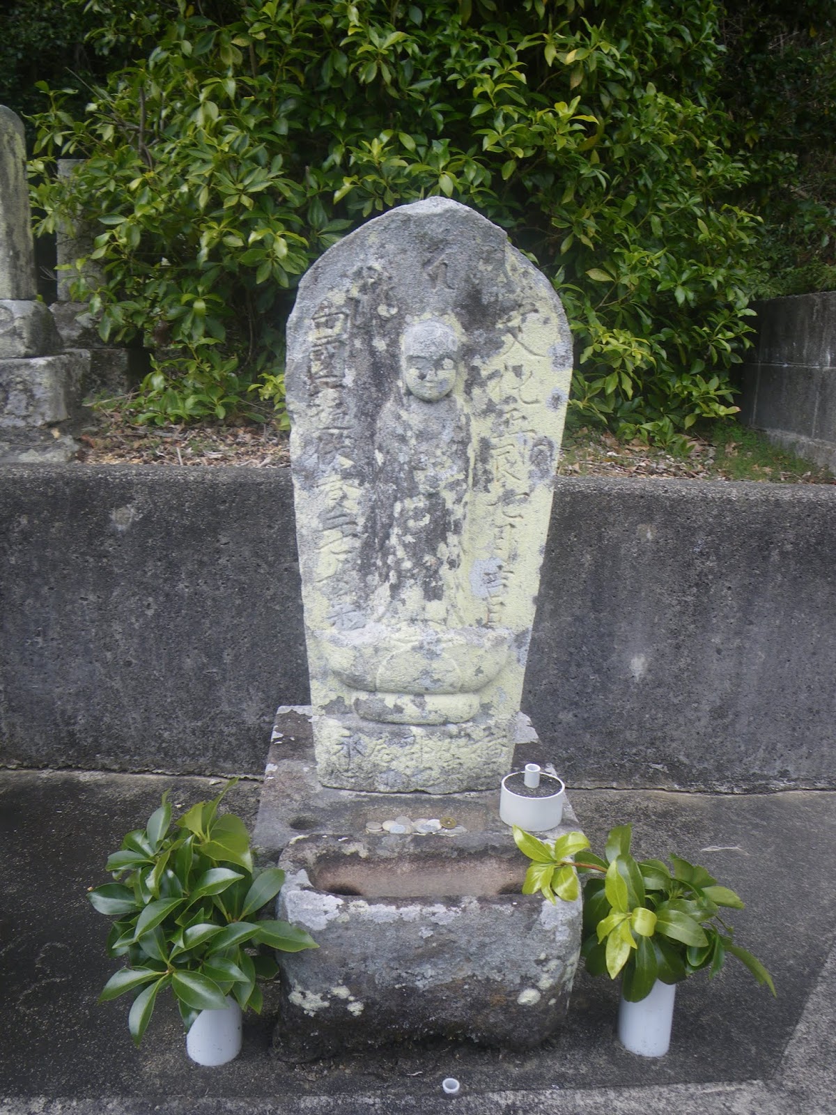 少し北に進むと道の右手に「四国のみち」の石標。右井戸寺0.3km」とある。その横に2基の石仏。1基は地蔵尊、もう1基は三界萬霊供養塔。笠型が目を惹く。「文化十三 井戸村講中」といった文字が台座に刻まれていた。