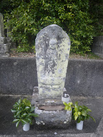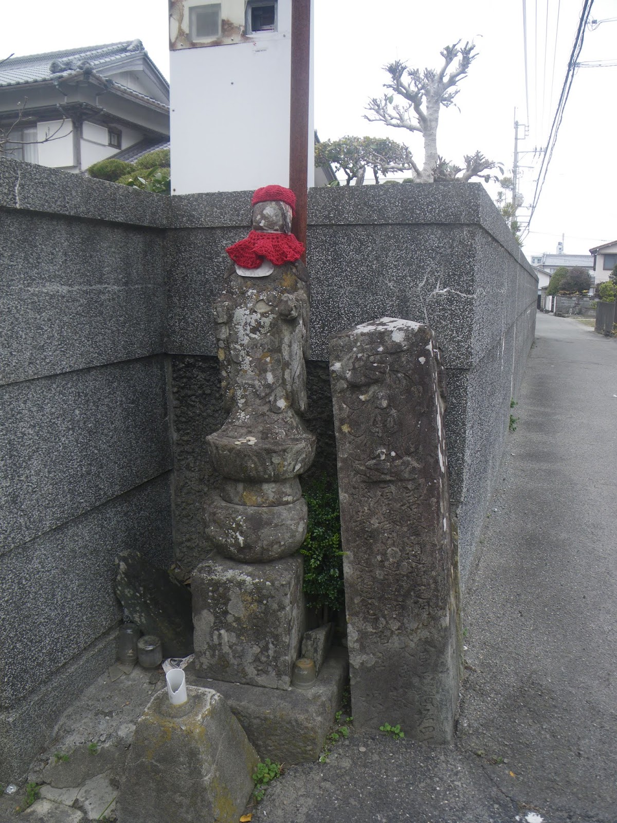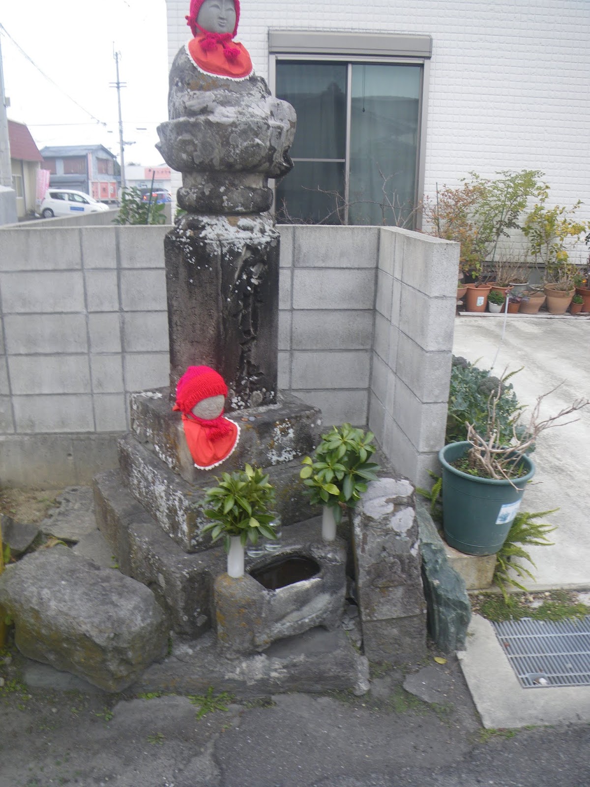 北に進み国道192号の一筋手前、四つ角東北角に地蔵座像と標石。地蔵座像の八角形台座正面に「右井戸寺」、右側面に「左観音寺」と刻まれた標石となっている。地蔵前の標石は摩耗し文字は読めないが、その形からして照蓮の四国千躰大師標石だ。