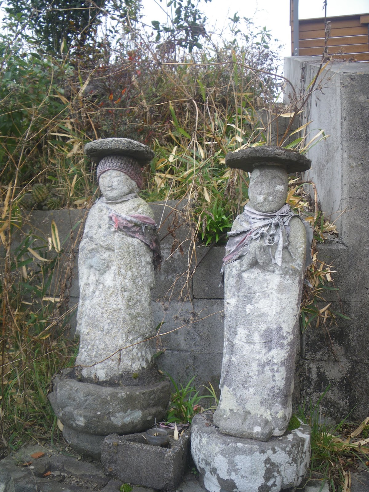 直ぐ先で道は二つに分かれる。その分岐点に石造物群。台座に座る地蔵は弘化四年の銘。地蔵座像の前にある2基の石像物は標石。右のものにはうっすら手印が見える。左を差す。半分埋まったものは手印と共に大師座像、そして「百」の文字が読める。照蓮が立てた四国千躰大師標石だろう。四国千躰大師標石にはよく見る「四国中千躰大師」と刻まれたものと、「百**番」といった番号を刻むものがあると言う。