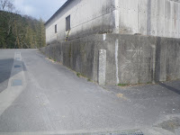 標石の指示に従い道を左にとり、土手へと向かう。土手少し手前、倉庫の角に茂兵衛道標。正面に「丹波国多紀郡」「阿波国麻植郡」の文字とその下に村名や人名が刻まれる。寄進者なのだろう。